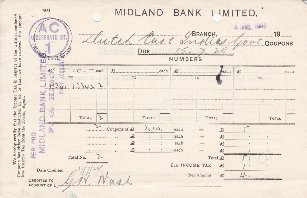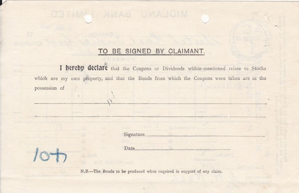 MIDLAND BANK LIMITED 1928 Dutch East Indies Govt. Coupons/Divid Receipt Rf 45988