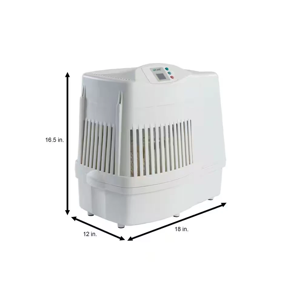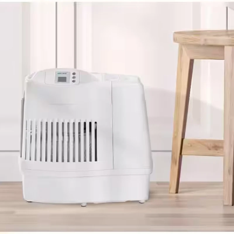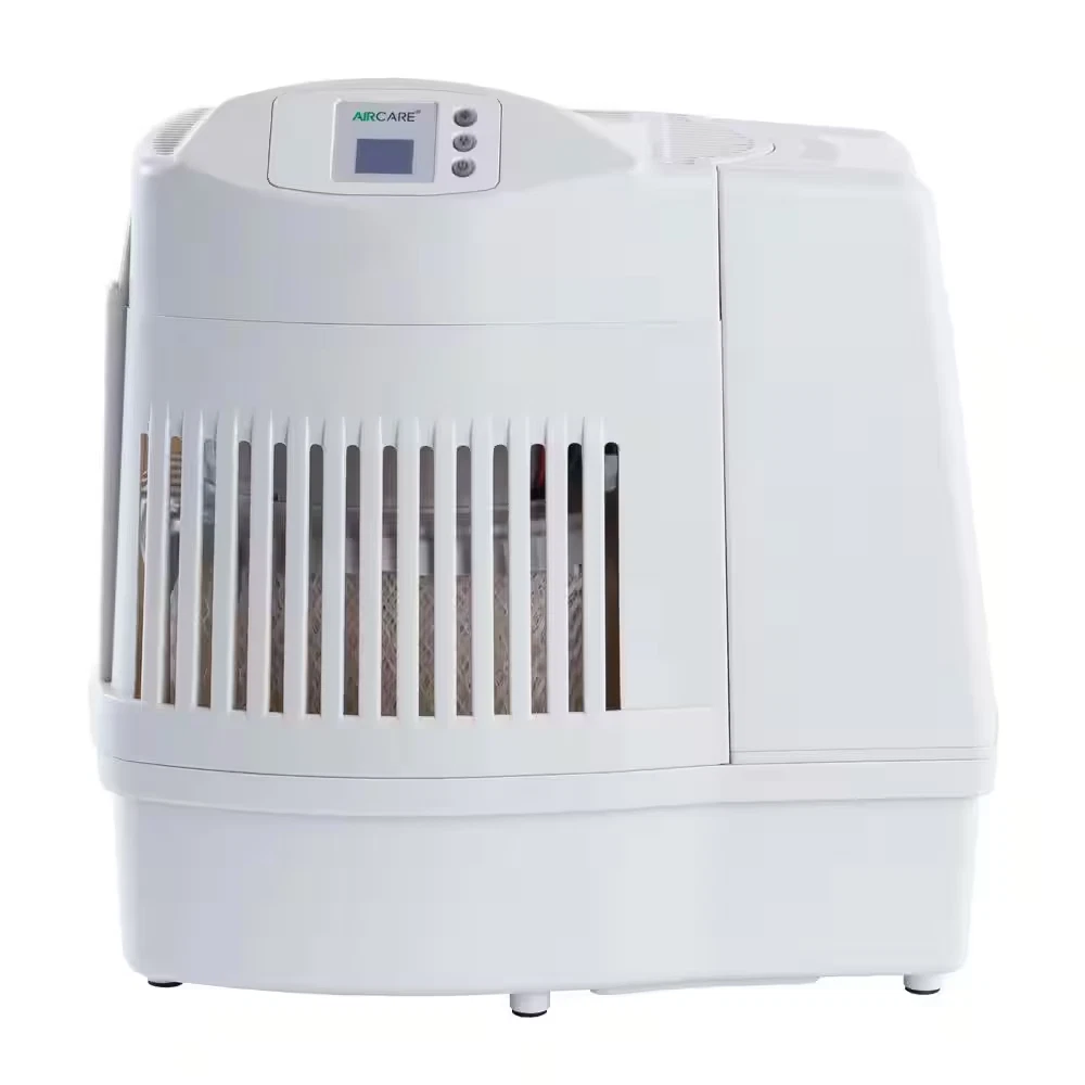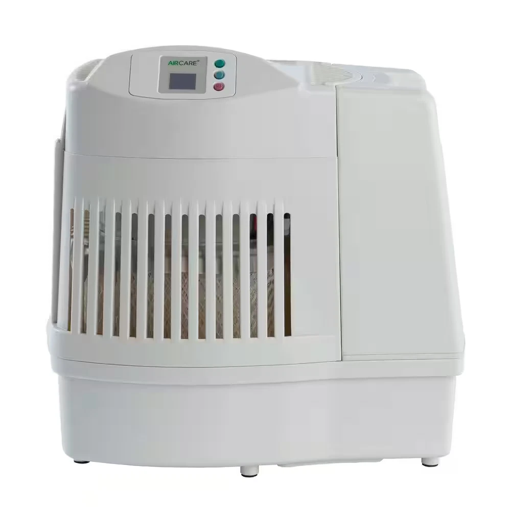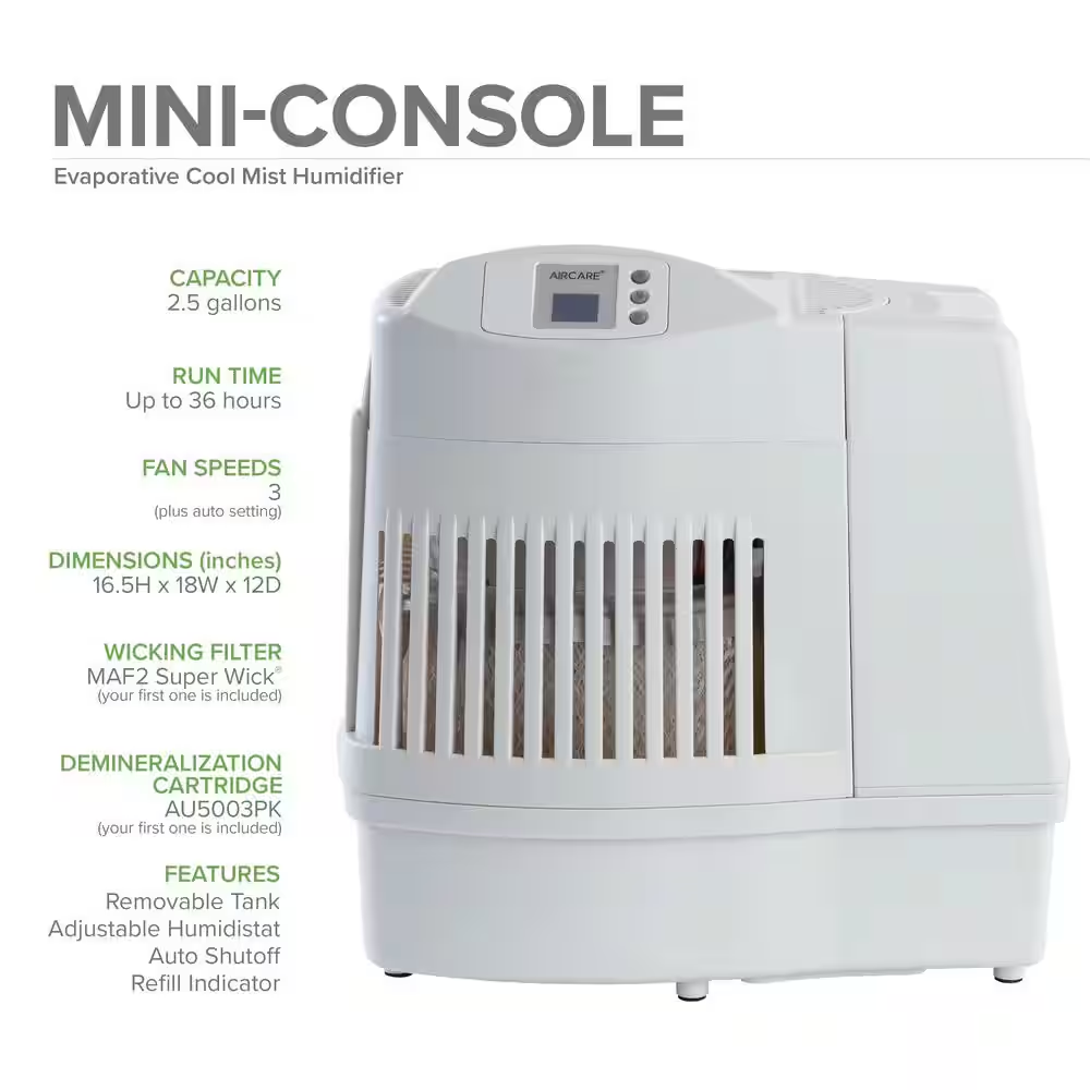 Cool mist evaporative humidifier Whole house humidifier for up to 2,600 square feet Uses AIRCARE MAF2 Super Wick® filter & AU5003PK (optional) This best-selling model's removable tank has a unique spring valve so there is no need for a cap - just press and fill. It has three fan speeds, plus an an auto setting that allows the fan to self-adjust according to the selected humidity level. The Mini-Console includes an adjustable humidistat, auto shutoff, refill indicator, and check filter indicator.