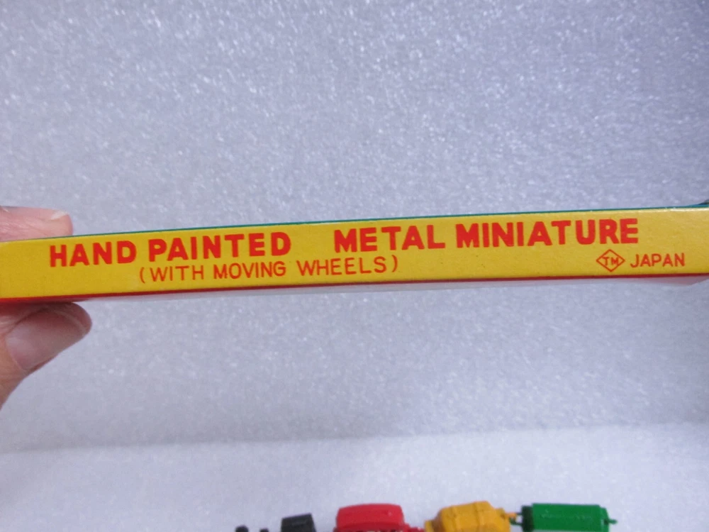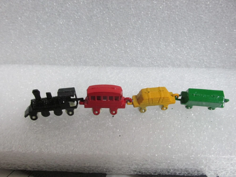 This listing is for a vintage box containing 4 miniature old fashion train pieces with moving wheels. They are in the original box. The only time they were taken out is when I took the picture. box measures 5 x 1 x 1/2" 110324-2 Please see all of the other, items that I have listed Please write if you have any questions and thanks for looking. .