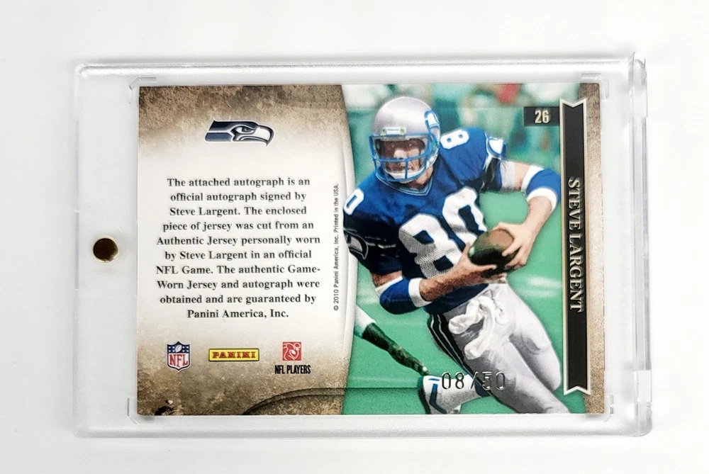 This rare and highly sought-after trading card is an absolute must-have for any serious collector. Featuring an autographed game-worn jersey patch of NFL legend Steve Largent, this 2010 Panini Absolute card is a limited edition, serial numbered and short printed, making it a true gem. With a print run of only 50, this card is an exclusive insert and memorabilia piece, showcasing Largent's impressive career with the Houston Oilers, Seattle Seahawks, and Tulsa Golden Hurricane. Made of high-quality card stock, this original and licensed reprint is a stunning addition to any football-themed collection. Don't miss out on the chance to own this incredible piece of sports history.