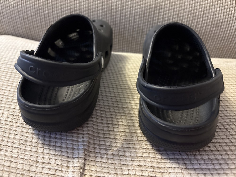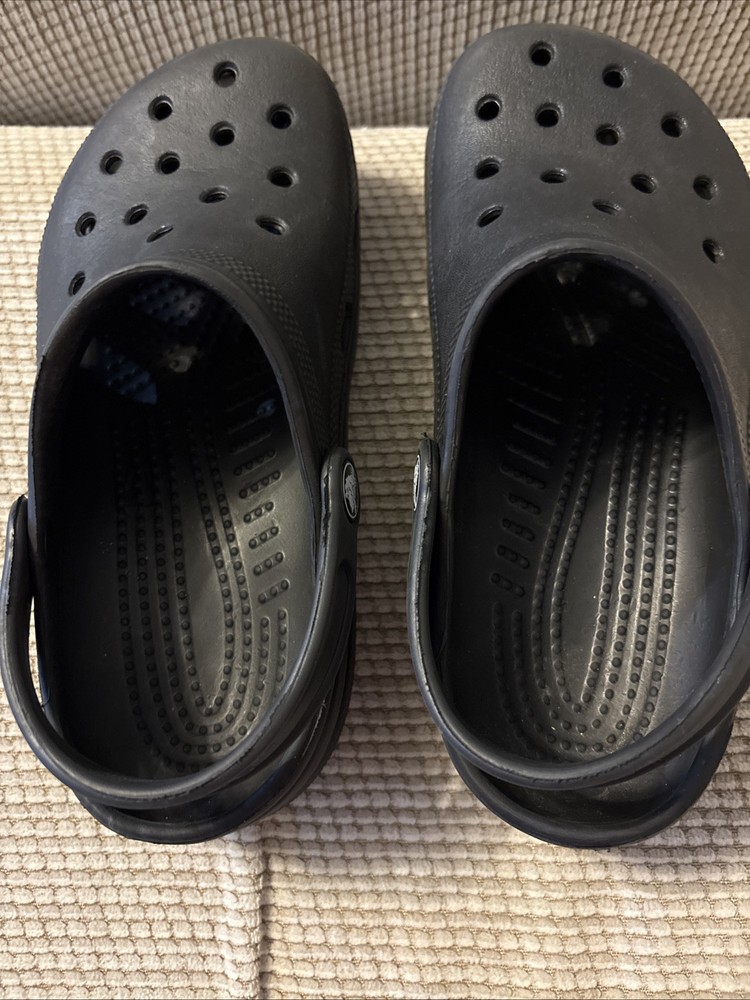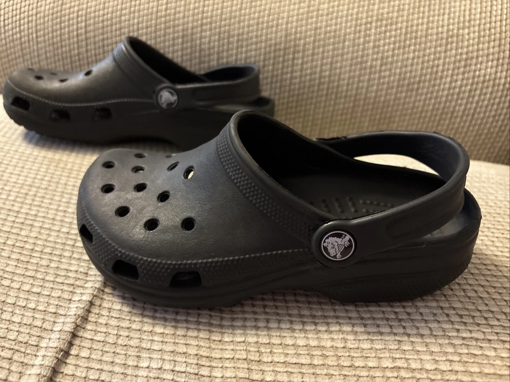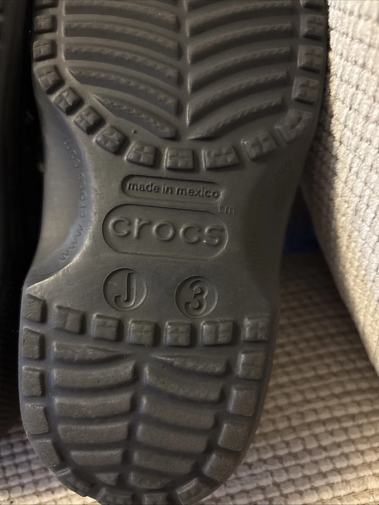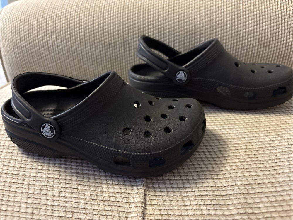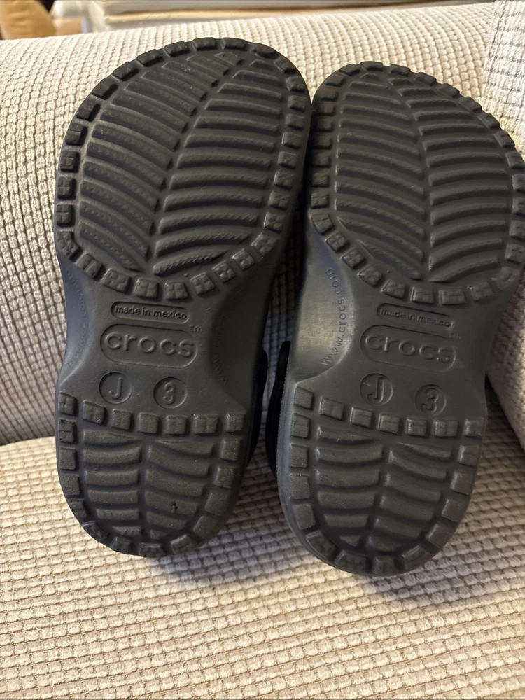 The product is a pair of kids' Crocs in size J3, featuring a classic clog style in black color. Designed with a slip-on closure, these unisex water shoes offer a comfortable and casual option for young wearers. The Crocs also include a platform sole for added height and style. Overall, these Crocs are in excellent used condition and provide a timeless and versatile footwear choice for unisex kids.