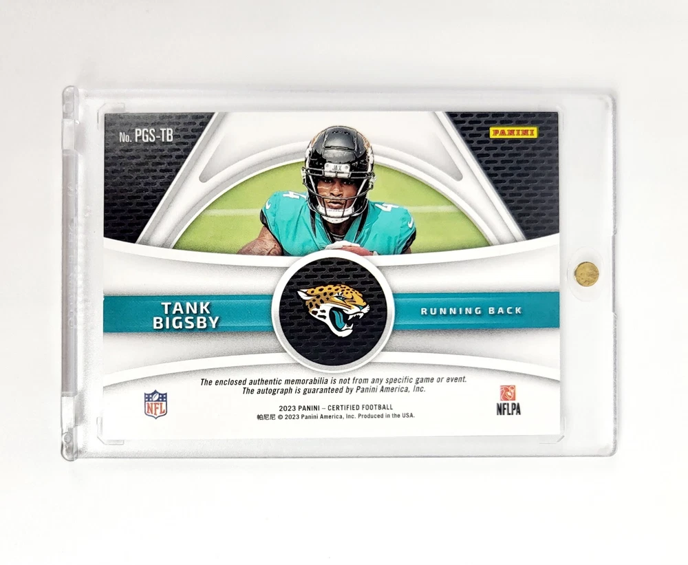 This rare and highly sought-after trading card features an autographed patch of Tank Bigsby, a rising star in the National Football League (NFL). The card is part of the 2023 Panini Certified set and is a limited edition piece, with only 149 ever produced. It is serial numbered and comes with a certificate of authenticity, ensuring its quality and rarity. The card also features a parallel/variety patch and is an exclusive rookie insert, making it a must-have for any collector or fan of the sport. Additionally, the card is a piece of the game, with a jersey patch and short print, making it an even more unique and valuable addition to any collection. One touch not included. Card will be well protected and shipped in toploader case.