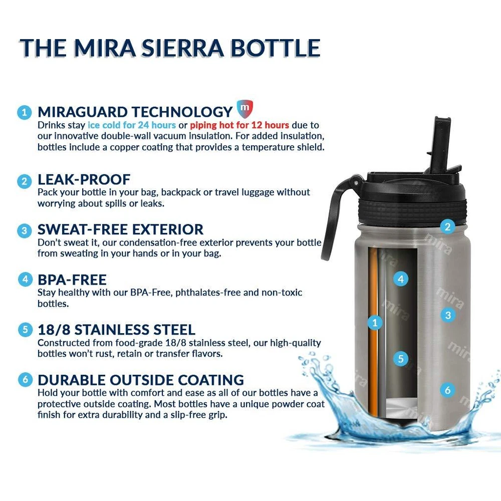 12 oz insulated, Stainless-Steel Water Bottle with Straw for easy and free sipping. Wide mouth opening for easy cleaning and filling ice. Leakproof when the nozzle is in the closed position Superior Double Wall Insulation keeps drinks cold for 24 hours or hot for 12 hours. Vibrant colors for all ages. Convenient carry loop for easy carrying. Cup holder friendly. Made from 18/8 food-grade stainless steel with a powder coat finish. Hand wash cup, dishwasher-safe lid. BPA-free materials for worry-free, sustainable hydration. Not recommended for hot or carbonated beverages