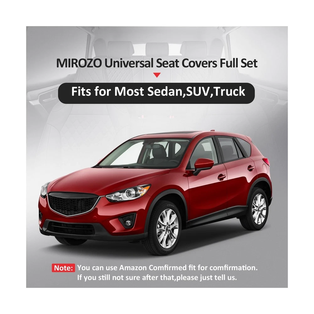 MIROZO Seat Covers Full Set,Car Seat Covers Black Car Seat Protector Waterproof Automotive Seat Covers fFront and Back Fit for Most Sedan, Truck and SUV for Elantra Sonata CRV Accord Chevy Equinox Description Features: [Universal Fit for Most Vehicles] Seat covers for car are designed to fit most vehicles, including SUVs, Sedans, Pickup Trucks, Hatchbacks, Crossovers, Crew Cabs, Vans, and EVs. Automotive seat covers provide a perfect fit and instantly refresh your car's interior. Pro Tip: Check your car model on the product page to ensure compatibility before purchase. [Premium Quality Material] Automotive seat covers black crafted from high-grade faux leather, these seat covers are breathable, waterproof, and sweat-absorbent. Car seat protector offer a soft, comfortable feel while keeping your seats protected and stylish. Perfect for ensuring a cozy ride for you and your family. [Airbag-Compatible Design] Safety first! Car seat Protector feature a detachable design with nearly hidden side straps, ensuring full compatibility with side airbags. car seat covers full set provide ample space for airbag deployment, keeping you safe without compromising style. [Smart Storage & Non-Slip Design] leather seat covers full set stay organized with front and back pockets, ideal for storing essentials like phones, keys, or snacks. The non-slip bottom keeps the covers securely in place, while the easy-to-clean material makes it a breeze to handle spills or pet messes. [Quick & Easy Installation] Installing your car seat covers is a breezejust 30 minutes or less! Each package includes clear instructions, and for extra help, weve got a step-by-step installation video. If you have any questions, our customer support team is just an email away. Were here to help 24/7! Product Details: Fit Type: Universal Fit Brand: MIROZO Color: Black Material: Faux Leather Auto Part Position: Front, Rear Special Feature: Dust Resistant, Waterproof, Fading Resistant, Stain Resistant,Easy to Clean Set Name: Full Set UPC Seat Cover Protection Level: High Seat Cover Placement: front_and_back Fit Type: Universal Fit Brand: MIROZO Color: Black Special Feature: Dust Resistant, Waterproof, Fading Resistant, Stain Resistant,Easy to Clean Set Name: Full Set UPC: 840342797127 Seat Cover Protection Level: High Seat Cover Placement: front_and_back Target Audience: Car Owners/Users,ages 20-55,Luxury & Premium Car Owners ,Customization & Style Seekers,families/pets Manufacturer: MIROZO Has Seat Belt Accessibility: Yes Automotive Fit Type: Universal Fit Item Weight: 13.2 pounds Product Dimensions: 25.2 x 21.26 x 6.3 inches Item model number: 170785-562 Manufacturer Part Number: 170785-562 Special Features: Dust Resistant, Waterproof, Fading Resistant, Stain Resistant,Easy to Clean Date First Available: June 21, 2021 Delivery We Do Not Ship Outside of the Continental US. Return Policy All items can be returned within 30 days of receipt. Seller will cover return shipping costs. Feedback We take our reputation seriously, we buy and sell online, so we understand the value of trust. If you are unsatisfied with your order, please contact us and we will work with you to resolve it to your satisfaction.
