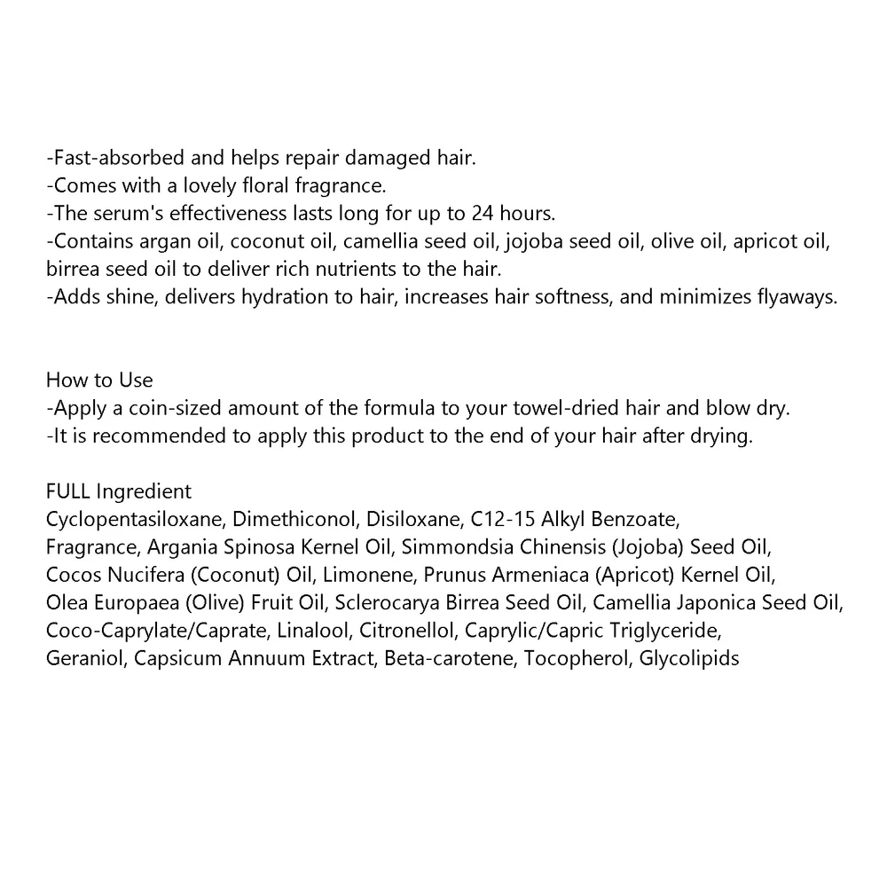 ★Thank you for looking★ ★We package and ship our products in thorough disinfection and quarantine.★ MISE EN SCENE Perfect Serum Original 2.7oz / 80ml Damaged Hair care K-Beauty Features -Fast-absorbed and helps repair damaged hair. -Comes with a lovely floral fragrance. -The serum's effectiveness lasts long for up to 24 hours. -Contains argan oil, coconut oil, camellia seed oil, jojoba seed oil, olive oil, apricot oil, birrea seed oil to deliver rich nutrients to the hair. -Adds shine, delivers hydration to hair, increases hair softness, and minimizes flyaways. HOW TO USE -Apply a coin-sized amount of the formula to your towel-dried hair and blow dry. -It is recommended to apply this product to the end of your hair after drying. Item Specification * Condition : 100 % Brand New * Skin type : All Skin Types * Capacity : 80ml / 2.7 fl.oz * Manufacturer : MISE EN SCENE * Country of Origin : Republic of KOREA All of our goods are original brand item with high quality. Shipping We ship worldwide. This item will be shipped to you from Korea, South. Please confirm your address is correct. We only ship to the address listed on eBay. Standard Shipping: Provide tracking number.(RINCOS),(K-Packet) Expedited Shipping : Faster number delivery, faster delivery. (FedEx)(DHL) Handling time : 3~4 business days Shipment method : International Air mail to world wide only STANDARD Shipping or Expedited Shipping Arrive time 7~15 Business Days U.S.A, Australia, Canada U.K 7~20 Business Days Europe, Asia 10~30 Business Days Mexico , Central and South America 15~30Business Days Brazil, South America, and other countries Return Polocy We carefully inspect the before shipment in case you found a defect on purchase, we will exchange or refund. If you received wrong item, please let us know to resolve problem. TAX & CUSTOMS Please Note: Import duties, taxes, and charges are not included in the item price or shipping cost. Please check with your country's customs office to determine what these additional costs will be prior to bidding or buying. Feedback If you are satisfied with our products,I hope you can leave me a good feedback. You are not very satisfactory, Please feel free to contact us. Contact Us If you have any question. Please feel free to contact us. We will try to reply within 24hours. We are always waiting your e-mail. ★Thank you for visiting.★
