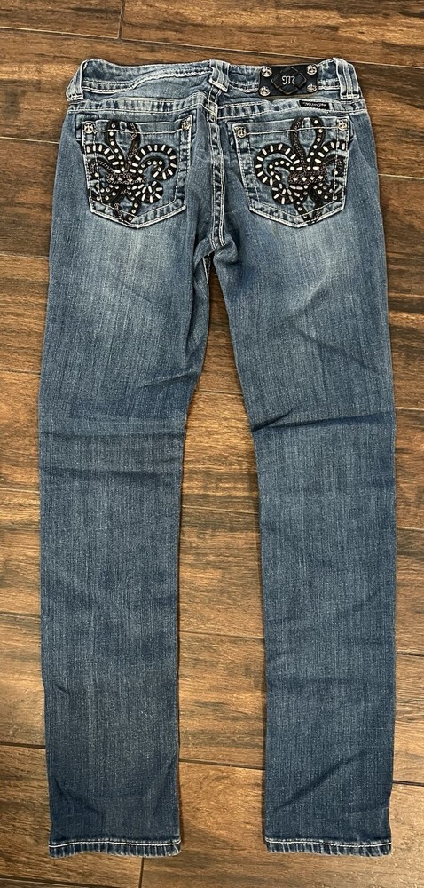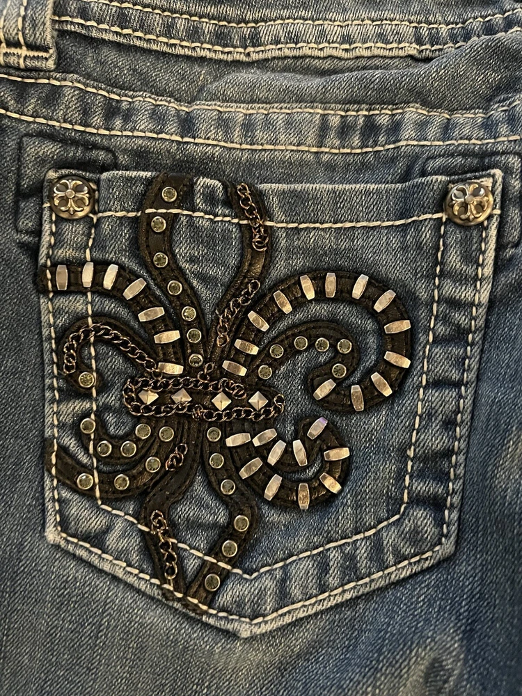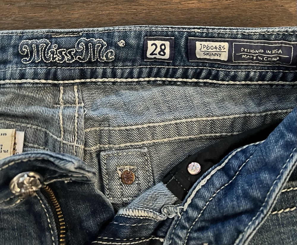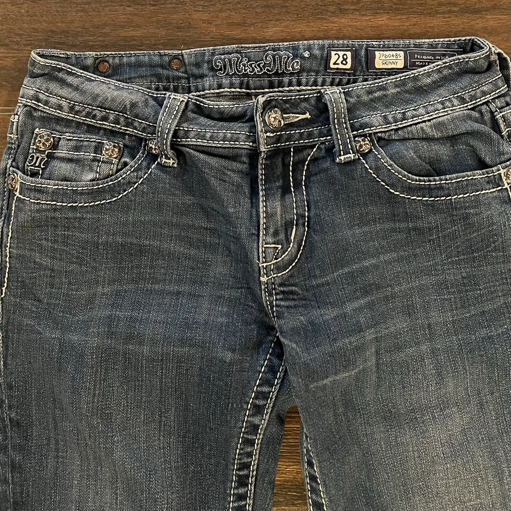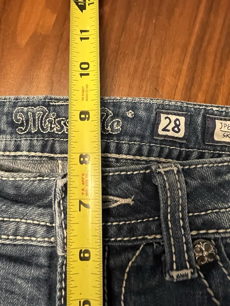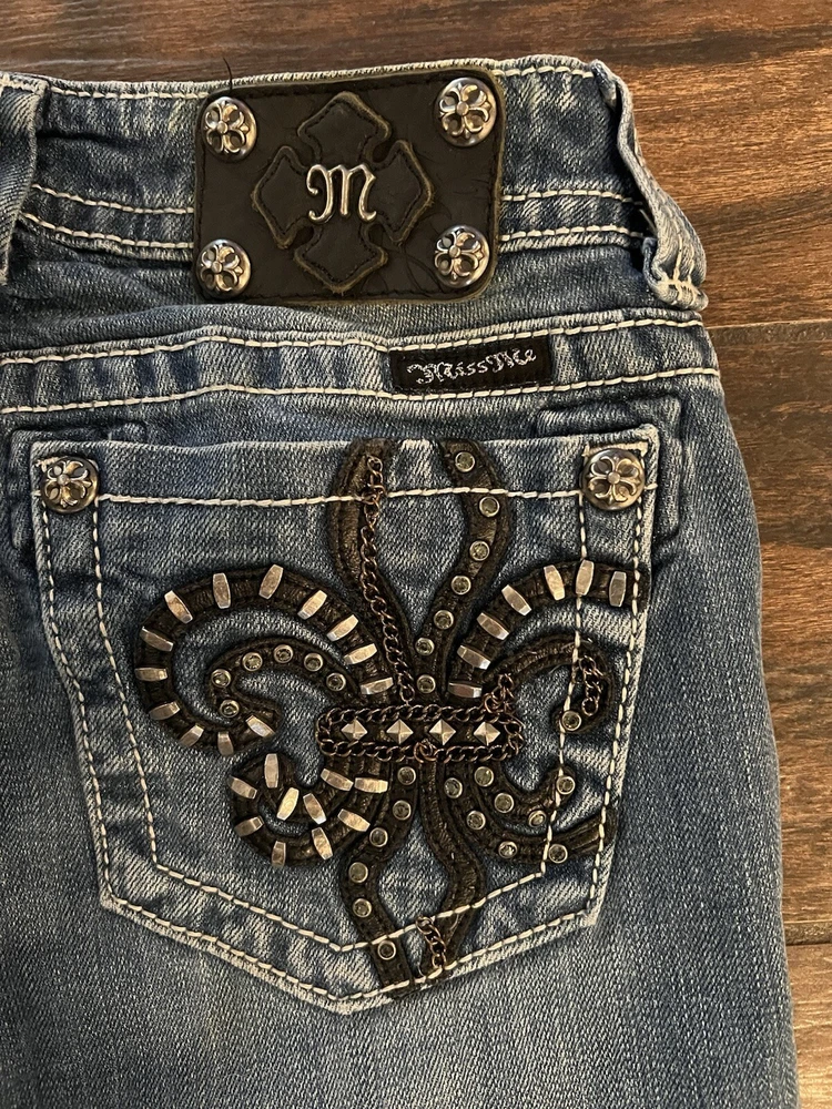 These Miss Me Skinny JP60485 jeans size 28 feature a solid pattern with embellished Fleur de Lis rear pockets and white stitching. The jeans have a mid-rise waist, a 5-pocket design with a coin pocket. Made of cotton/elastin fabric, they are machine washable and suitable for all seasons. The color is a medium blue wash.