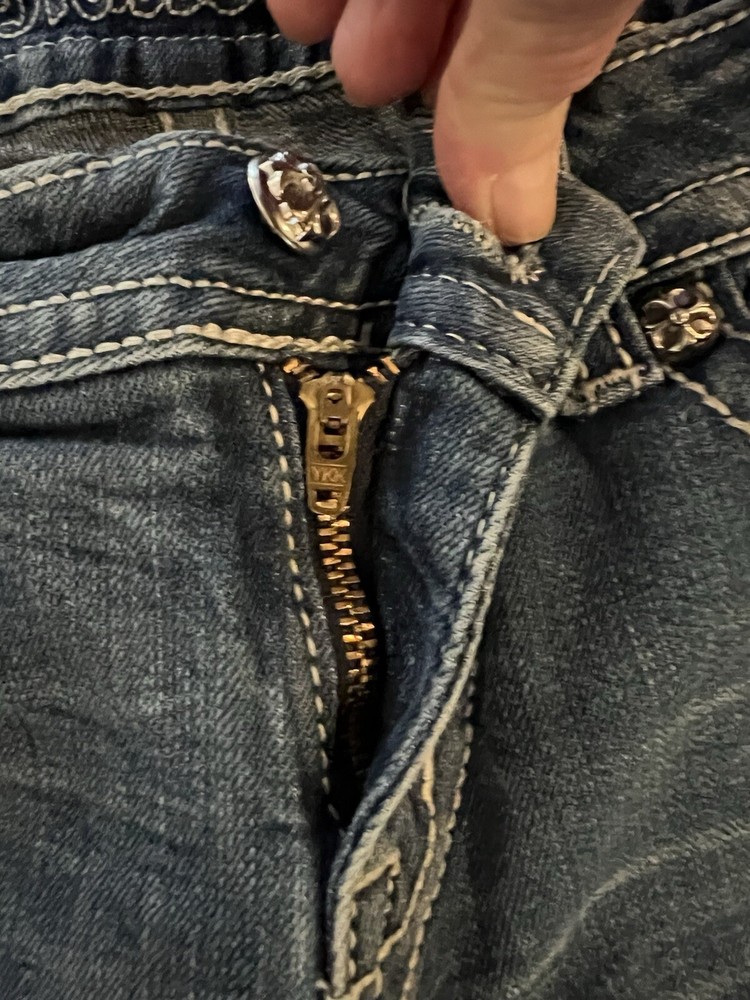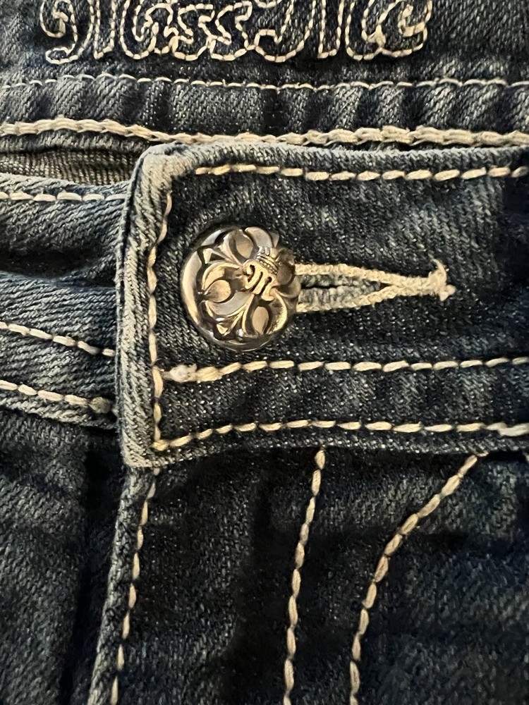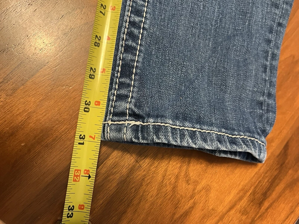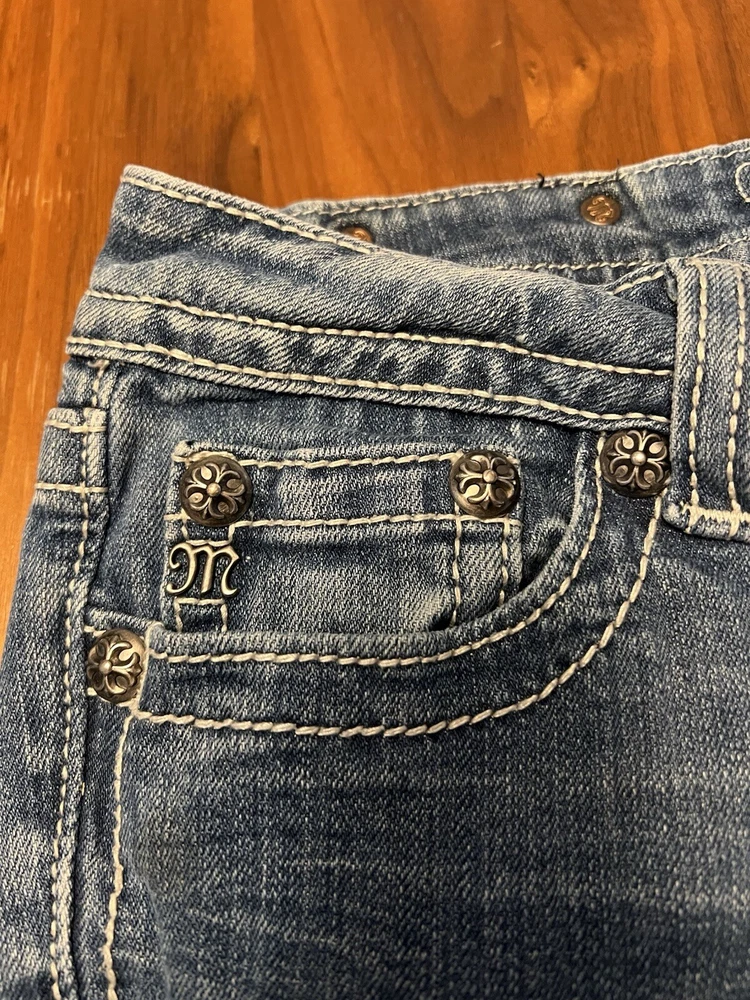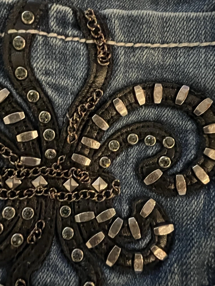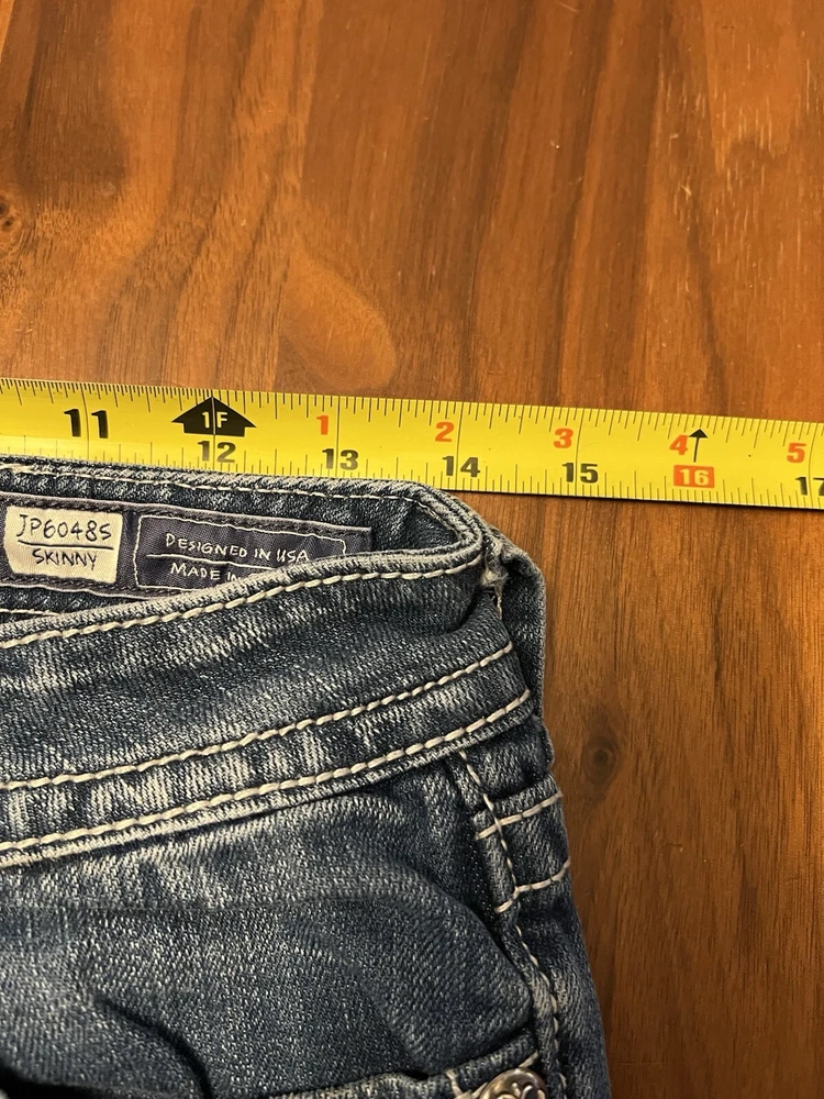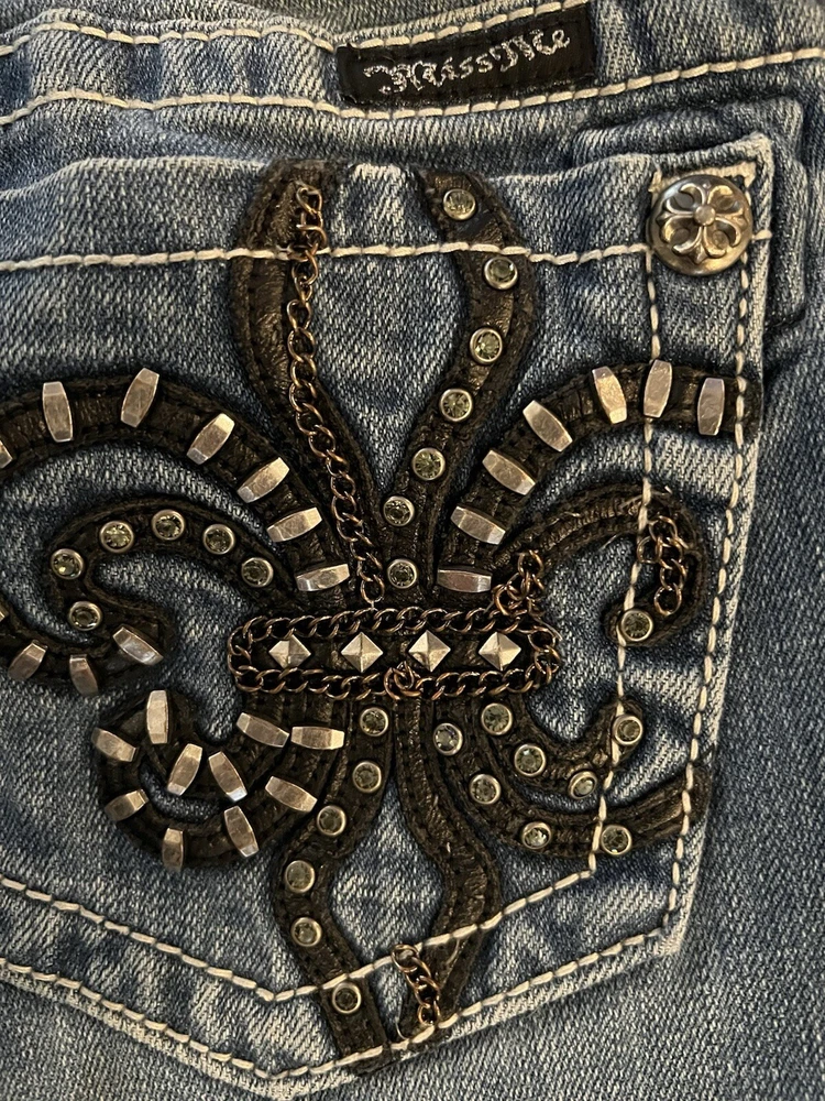These Miss Me Skinny JP60485 jeans size 28 feature a solid pattern with embellished Fleur de Lis rear pockets and white stitching. The jeans have a mid-rise waist, a 5-pocket design with a coin pocket. Made of cotton/elastin fabric, they are machine washable and suitable for all seasons. The color is a medium blue wash.
