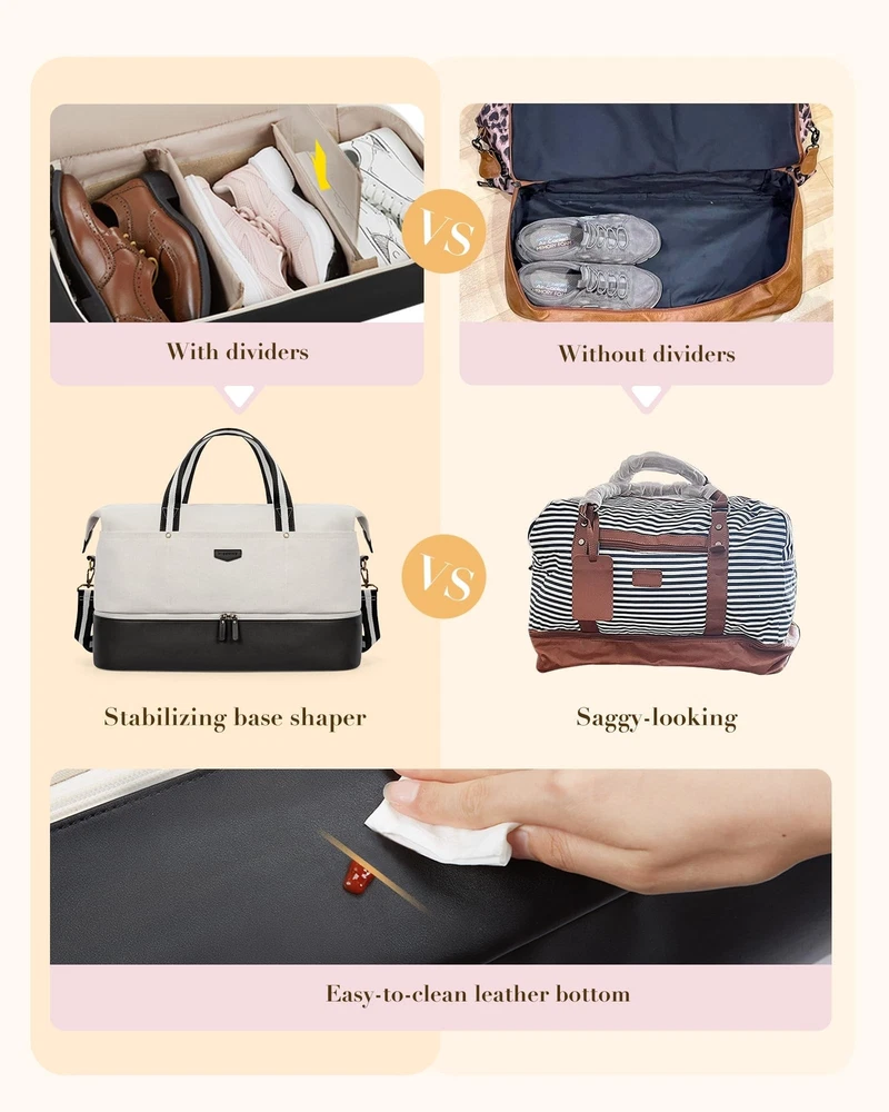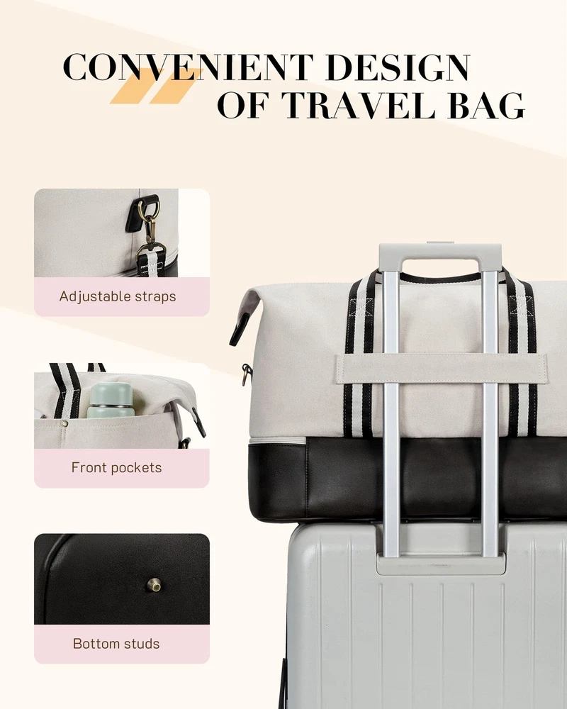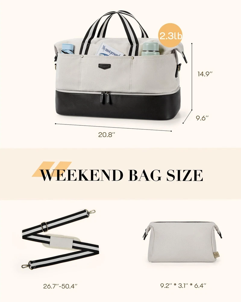 MISSNINE Weekender Bag for Women, Canvas Travel Duffle Bag Large Overnight bag Carry On Bag for Travel Gym Work with Leather Shoe Compartment, 2 Pcs Set Product Details Product Dimensions: 21 x 9.6 x 14 inches Item Weight: 2.97 pounds Manufacturer: Missnine Country of Origin: China Number of Compartments: 6 Different Compartments/PocketsThe weekender bag featuring multiple pockets and compartments for stuff organization. Large main compart fits 3-4 days worth of travel essentials; 3 front pockets to hold your smart phone, IDs or passport, come with a cute small bag for toiletries or other smaller items.Back side sleeve allows you to fit it in trolley case to free your hands.
