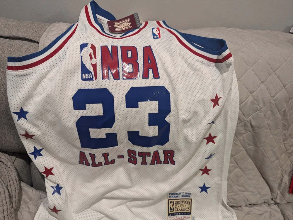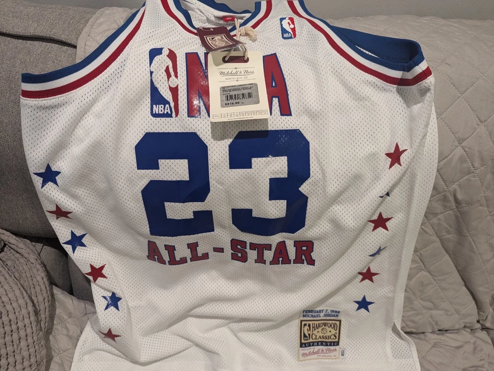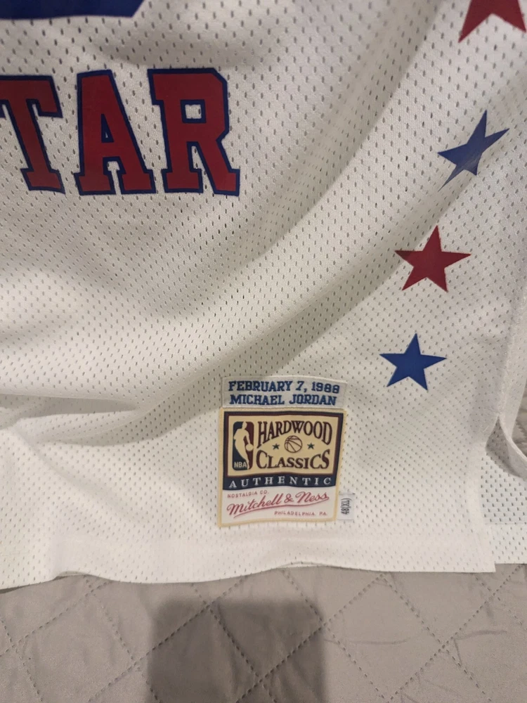 The Mitchell & Ness Authentic Michael Jordan 1988 All-Star Game jersey is a white men's size X large jersey featuring the iconic player Michael Jordan from the Chicago Bulls. This officially licensed NBA product is a throwback to the 1988 All-Star Game and is made by Mitchell & Ness, known for their high-quality retro sports apparel. The jersey is perfect for basketball fans looking to show their support for Michael Jordan and the Chicago Bulls during the All-Star Game event.
