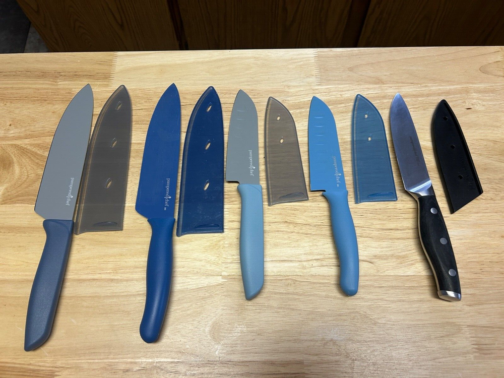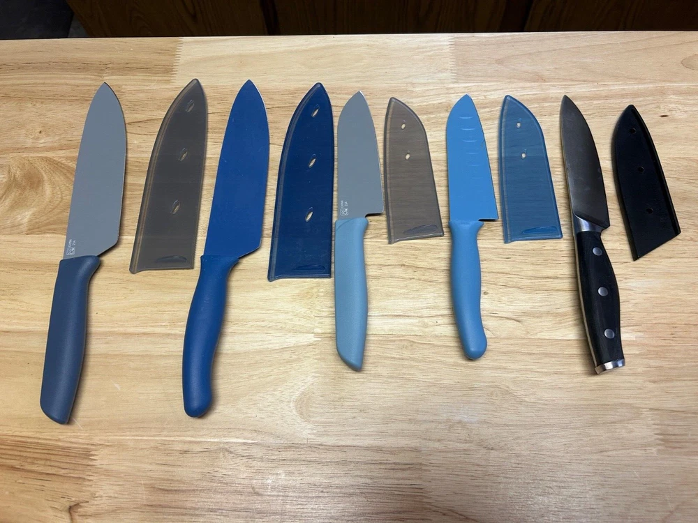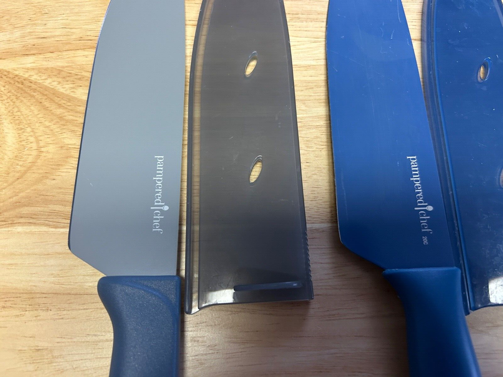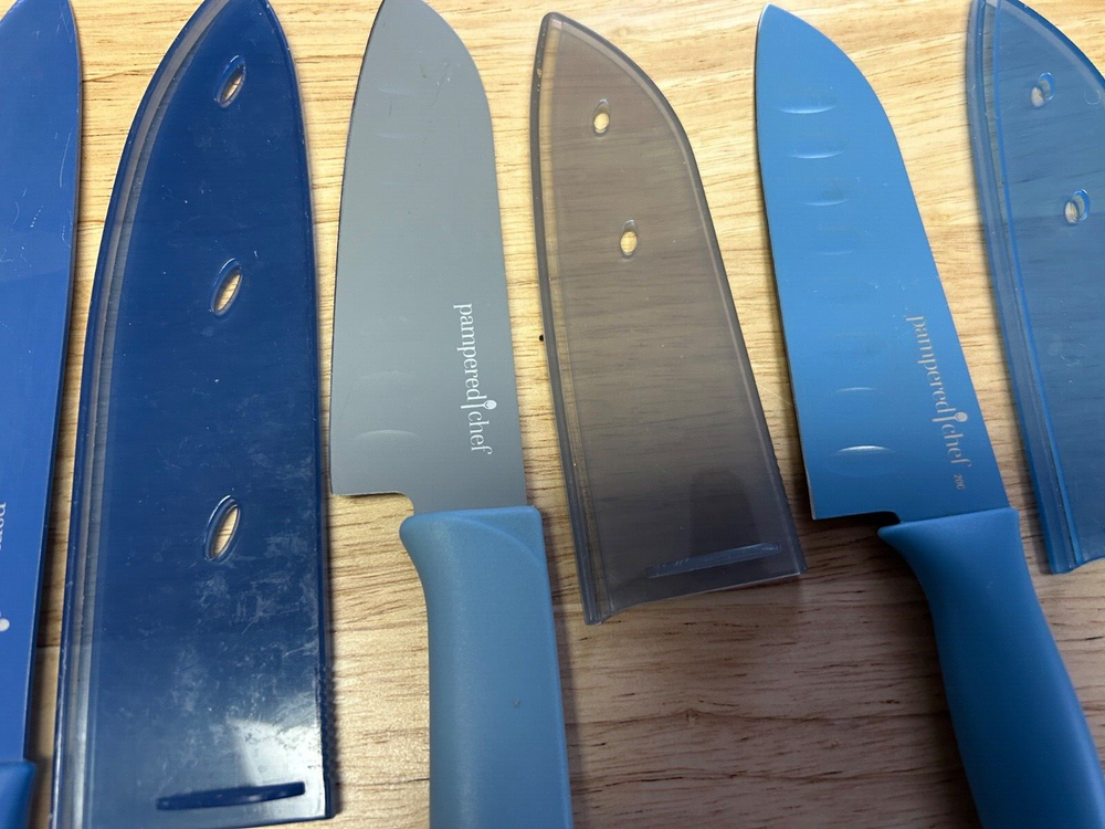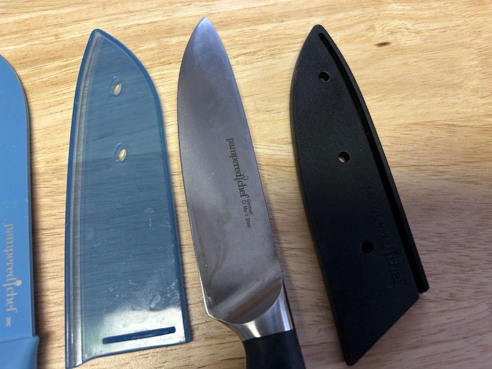 Explore the versatility and precision of the Pampered Chef brand with this mixed lot of 5 Santoku knives, each designed to cater to your diverse kitchen needs. Crafted from high-quality German steel, these knives promise lasting sharpness and effortless slicing, dicing, and chopping. The multicolored composite handles provide a comfortable, secure grip, making them suitable for universal food preparation tasks. The set includes a knife guard for added safety during use, and one knife features an elegant German wood handle, enhancing both its aesthetic appeal and functionality. With seven units in total, this set is a practical addition to any kitchen, ensuring you have the right tool for every culinary challenge. ’ LOT OF 5 PAMPERED CHEF KNIVES WITH GUARDS TWO ARE 7” 3 ARE 5” AND ONE OF THE THREE HAS A GERMAN WOODEN HANDLE IN GOOD CONDITION