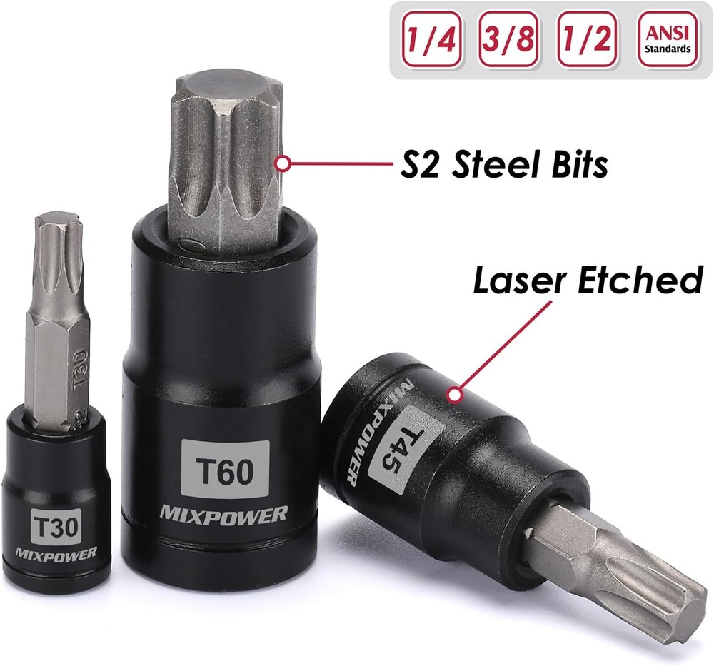 MIXPOWER 25 Piece Torx Bit and Socket Set, 13 Star Bits T8-T60,E4-E22(25PCS) Product Details Brand: MIXPOWER Material: Chrome Vanadium Steel, S2 Steel Drive System: Star, Torx Finish Type: Black phosphate finish Number of Pieces: 25 Manufacturer: MIXPOWER Part Number: MT078 Item Weight: 2.43 pounds Product Dimensions: 10.55 x 7.09 x 2.36 inches Item model number: MT078 Size: T8-T60,E4-E22(25PCS) Finish: Black phosphate finish Item Package Quantity: 1 Compatible Fastener Range: 0.25 inch Batteries Included?: No Batteries Required?: No Brand: MIXPOWER Material: Chrome Vanadium Steel, S2 Steel Drive System: Star, Torx Finish Type: Black phosphate finish Number of Pieces: 25 【Premium CR-V Steel】Made from drop forged and heat treated chrome vanadium steel (50BV30) with black phosphate finish. 【Set Includes】 13 Star Socket Bits T::1/4" Drive: T8, T10, T15, T20, T25, T27, T30; 3/8" Drive: T40, T45, T47, T50, T55, 1/2" Drive: T60. 12 Female E-Torx Sockets E: 1/4" Drive: E4, E5, E6, E7, E8; 3/8” Drive: E10, E12, E14, E16, E18, E20, 1/2” Drive: E22. 【S2 Alloy Steel Bit】Highest Quality Heat Treated S2 Alloy Steel Torx Bits, Drop-Forged to Help Prevent Wear-Outs and Improved Durability and Extra Torque. 【Laser Marking 】High-contrast size marking is permanently laser etched and easy to read, even in low light.