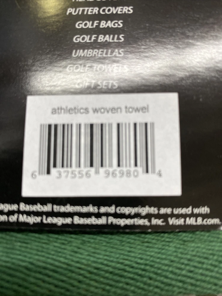 gtin13:Does not applyNon-Domestic Product:NoMPN:Does Not ApplyMaterial:CottonModified Item:NoType:Golfbag TowelCustom Bundle:NoFeatures:WovenBrand:MLBColor:GreenSet Includes:Sports TowelTheme:Athletics, Oakland A's, BaseballUPC:Does not applySport/Activity:GolfCountry/Region of Manufacture:United States
