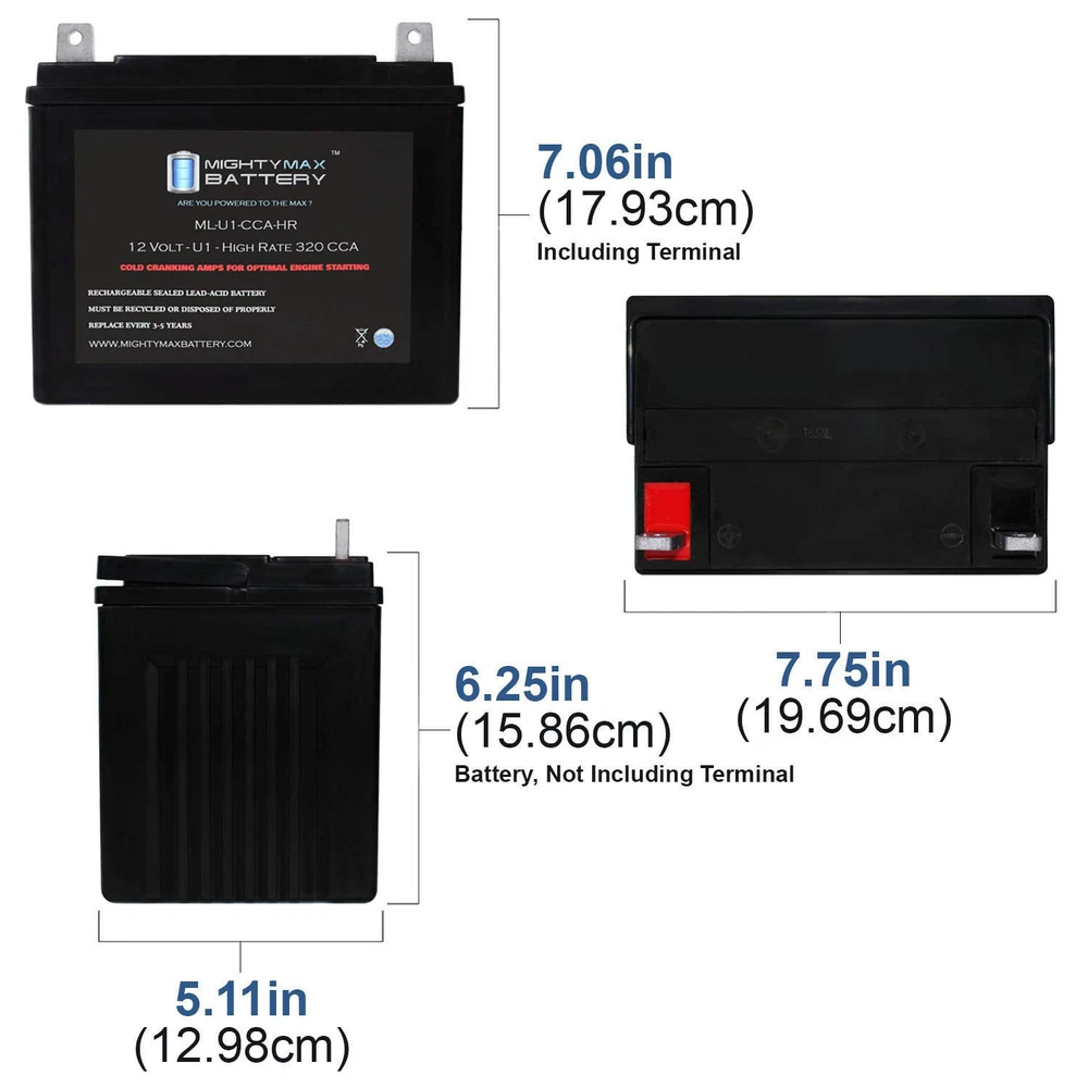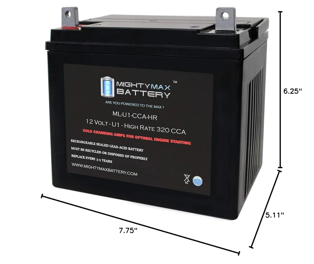 Menu Other Items Feedbacks About Us Contact Us Add To Favorites ML-U1-CCAHR 12V 320CCA Battery for Toro Timecutter Z5000 Lawn Mower ML-U1 is a 12V 320 Cold Cranking Amps (CCA) Sealed Lead Acid (SLA) Battery. Dimensions: 7.75 inches x 5.11 inches x 6.25 inches. Polarity: Positive on Left, Negative on Right. Listing is for the Battery and Screws only. No wire harness or mounting accessories included. SLA / AGM spill proof battery has a characteristic of high discharge rate, wide operating temperatures, long service life and deep discharge recover. Rechargeable battery that can be mounted in any position, resists shocks and vibration. Long lasting high performance in high and low temperatures. Full One Year Product Description Item Specification Item model number ML-U1-CCAHR974 Product Dimensions 5.11"D x 7.75"W x 6.25"H Country of Origin Thailand Vehicle Service Type Lawn Mower Voltage 12 Volts Battery Cell Composition Lead Acid Item Weight 14.1 Pounds Terminal Nut & Bolt Batteries 1 12V batteries required. (included) Dimensions Shipping Returns Additional Info Product Dimensions: 7.75 "h x 5.11 "h x 6.25 "h. Fast shipping is very important for us. Our standard shipping service is FREE. Your order will be shipped within 1-3 business days upon full payment received. Most items are delivered within 3-5 business days, however, please allow 3-10 business days. We are shipping only to USA. We only ship to the confirmed Paypal address. We reserve the right to cancel any order for any reason at any time. We are not responsible for undeliverable addresses. We offer a 30 day return policy from checkout winning date. Your satisfaction is guaranteed! If for any reason you are unhappy with your item, just return it within 30 days for a full refund, minus shipping cost. Please contact us prior to initiating a return so that we can issue you a refund authorization. Items defective upon receipt must be packaged in their retail packaging as if new and returned with a detailed description of the problem. Return shipping fees are not refundable. We reserve the right to decline any returns if the above guidelines are not followed. All of our items, unless otherwise stated, will only run on 120 volts. Please check to make sure your country complies with these specifications. If you have a problem or question regarding your transaction please contact us before leaving any type of feedback. We will work with you to resolve any problem you may have.