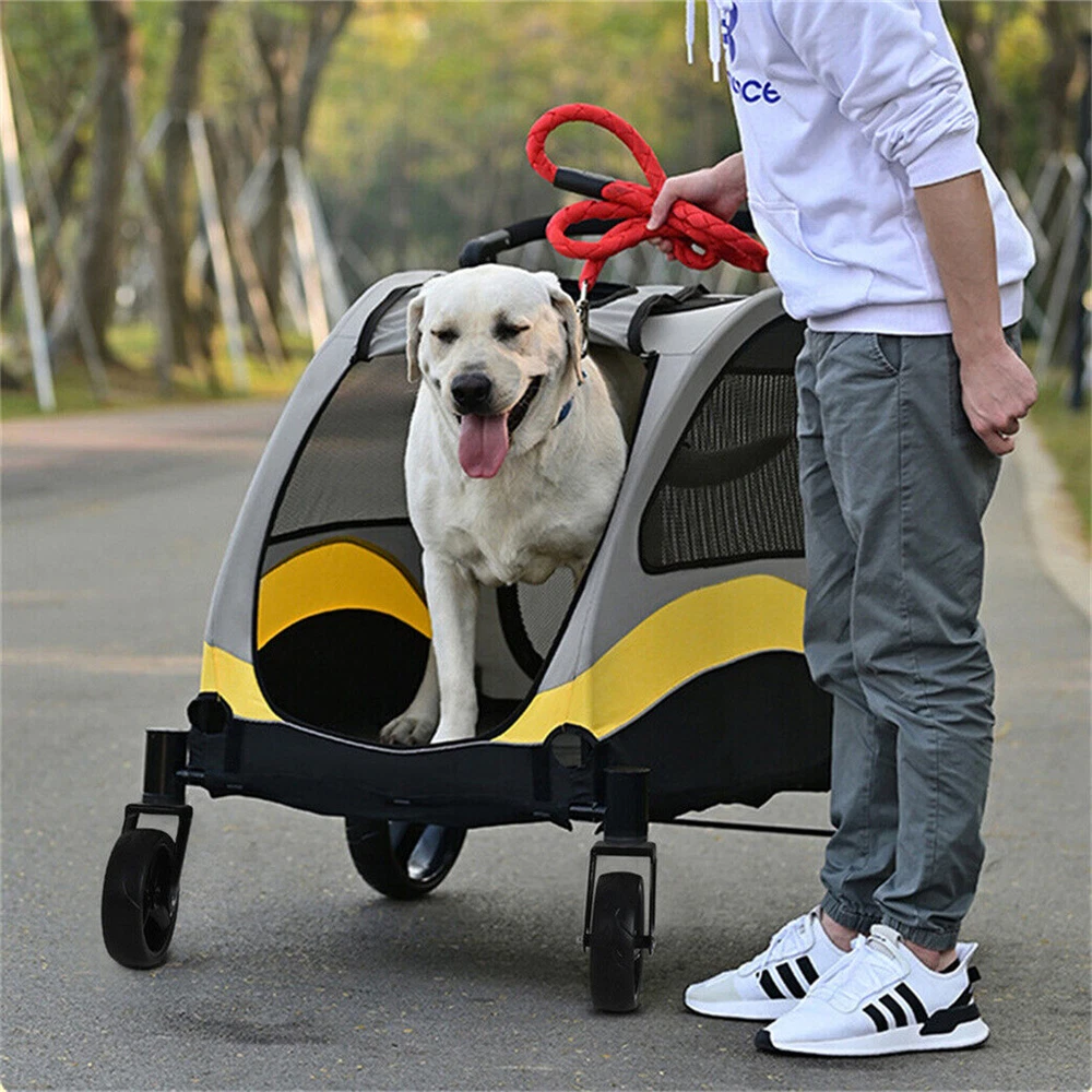 M/L/XL Large Dog Stroller Buggy Heavy Duty Pet Pram Doggy Pushchair Foldable US M/L/XL Large Dog Stroller Buggy Heavy Duty Pet Pram Doggy Pushchair Foldable US us seller, fast shipping. 【Functional Pet Stroller】 A pet stroller is perfect for injured, sick, paralyzed, rescued or elderly dogs with limited mobility, cats who suffer from anxiety and depression or love strolling around outdoors, it is a convenient accessory for owners can take them for walking or shopping 【Spacious Interior & Breathable】 The spacious interior and high weight-bearing ability make this pet stroller suitable for pushing one large dog or two small pets together. Breathable mesh cover for air flow, pets enjoy visibility via zippered panoramic windows and sunroof-style opening that allows them to stick their head out. 【Convenient Dog Stroller】 The zippered rear opening convenient for pets to go inside while they come out from the front openings. Spacious interior allows dog stay comfortably and move easily, the handle is covered with sponge foam to make it comfortable to grip and push, can be adjusted to 200°as per your stature 【Amazing 4 Wheels】 Comes 4 wheels, easy to maneuver and suitable for any kinds of road. The front wheels swivel 360 degrees, shock absorption, wear resistance. The rear wheels are lockable, brakes to prevent rolling accidentally, keep it parked safely wherever you want 【Safe & Stable Design】 Ideal for walking, shopping, hiking, picnics, busy parks or shopping areas. The stroller made with solid metal iron pipe for high strength and maximum stability, includes a safety collar hook inside to attach harness, prevent dogs running or out of control. Quick-folding mechanism that lets you fold conveniently and store it in the house or car truck Specifications: Feature: Foldable, Portable, Mobile, Large Material: 70% Iron Pipe + 20% 600D Oxford Cloth + 10% ABS Plastic Color: Multi-colored Net M: Net Weight: 6.41kg/ 14.13 lbs Weight Capacity: total 20kg/ 44 lbs Product Dimension: L * W * H 57x76x102cm/ 22.44x29.92x40.15 inch Folding Size: L * W * H total 57x76x23cm/ 22.44x29.92x9.05 inch Package Size: 71x51.5x15cm/ 27.9x20.3x5.9 inch Package Weight: 7.5kg/ 16.5 lbs L: Net Weight: 10.55kg/ 23.26 lbs Weight Capacity: 55kg Product Dimension: L * W * H 63x105x115.5cm/ 24.8x41.34x45.5 inch Folding Size: L * W * H 75.5x105x30cm/ 29.72x41.34x11.8 inch Package Size: 87x62.5x18cm/ 34.3x24.6x7.1 inch Package Weight: 12.15kg/ 26.8 lbs XL: Net Weight: 10kg/ 22 lbs Weight Capacity: 60kg Product Dimension: L * W * H 74x107x112cm/ 29x42.1x44.1 inch Folding Size: L * W * H total 74x107x33cm/ 29.1x42.1x13 inch Package Size: 90x75.5x16cm/ 35.4x29.7x6.3 inch Package Weight: 12.6kg/ 27.8 lbs Divider for two dogs : Net Weight: 10.2kg/ 22.5 lbs Weight Capacity: total 42kg/ 92.6 lbs Product Dimension: L * W * H 74x100x112cm/ 29x39.4x44.1 inch Folding Size: L * W * H 74x100x33cm/ 29x39.4x13 inch Package Size: 82x65x14.5cm/ 32.3x25.6x5.7 inch Package Weight: 11.7kg/ 25.8 lbs Package Included: 1 x Dog Stroller Pushchair 1 x Instruction Guide Note: * Please measure the body length of your pets before purchase. * Please make sure the size of stroller to fit into your door.