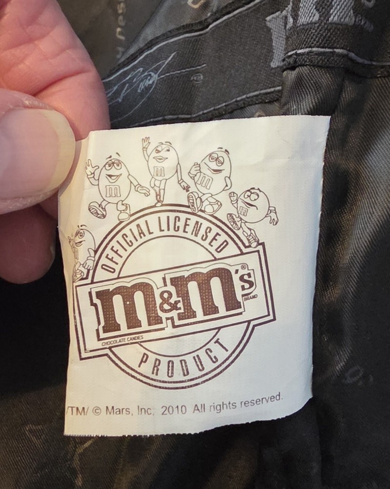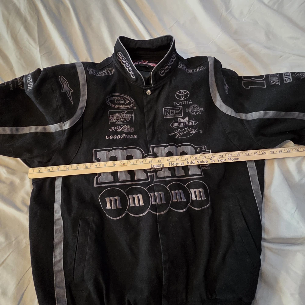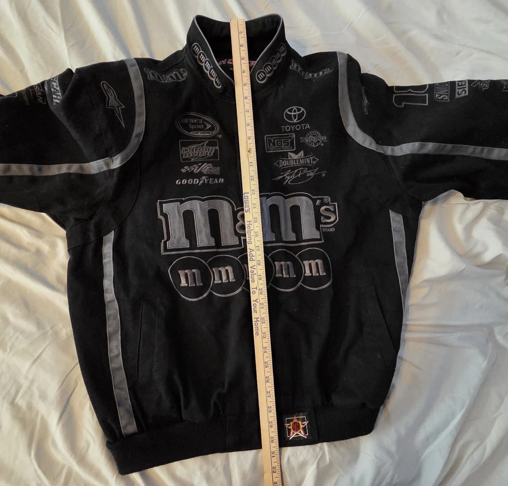The M&M Racing Jacket #18 in Black Vintage NASCAR design by JH Designs is a rare and highly sought-after collectible for fans of Kyle Busch and the Joe Gibbs Racing team. Made in China, this officially licensed jacket showcases the driver's number and sponsors in gray against black in a stylish and unique design. The large XXL size makes it perfect for male NASCAR enthusiasts looking to show their support for the sport and their favorite driver in a standout piece of fan apparel. Other sponsors: Interstate Batteries Doosan Infracore Food Lion Shewing Williams Goodyear Sprint Cub Series Toyota NOS Energy Drinks Doublemint gum Pedigree Dog Food Snickers Siemens Sunoco Gillette