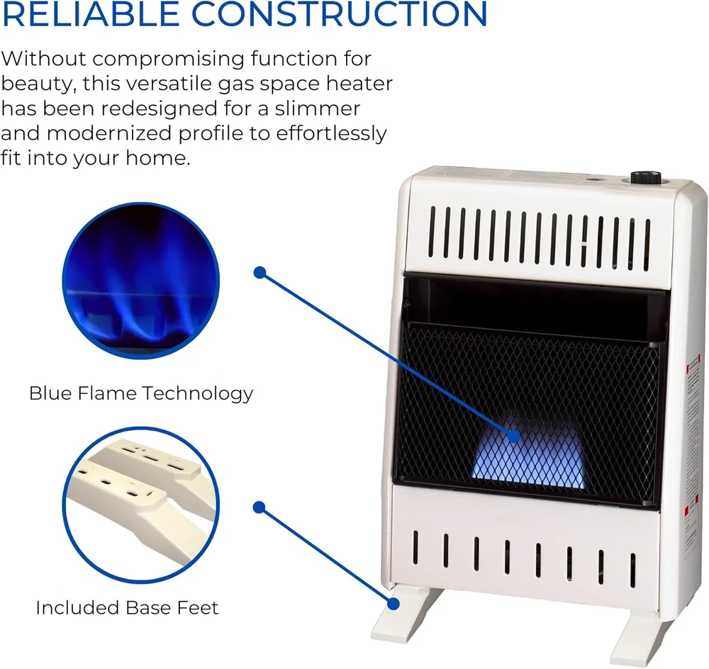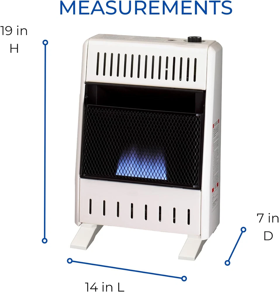 MN100TBA-B Ventless Natural Gas Blue Flame Space Heater with Thermostat Control TECHNOLOGY: This compact Blue Flame mini heater produces 10000 Maximum BTU using Natural Gas and heats up to 500 sq. ft. area; This is a great heater for office, bedroom, living room, and other residential use DEPENDABLE: Thermostat control on the heater offers High/Medium/Low Thermostat Control; Ideal for greater heat flow that could add a warm atmosphere as a small space heater STYLISH: Without compromising function for beauty, this versatile small heater has been redesigned for a slim & modern profile to effortlessly fit in your room; Mount on a wall with included hardware or place on a floor with Base Feet (Included) SAFE: Push button ignition with built-in pilot oxygen depletion sensor (ODS) immediately shuts down the garage heater if carbon monoxide or lack of oxygen is detected; ANSI Certified to ensure safety CONVENIENT: No electricity is required for this personal heater, making it perfect for power outages or any in-house emergencies; Includes Wall Mount and Base Feet ProCom Natural Gas Ventless Blue Flame Heater with Base Feet - 10,000 BTU, T-Stat Control - Model# MN100TBA-B 17.0 "h x 6.38 "h x 23.0 "h. Weight: 13.77 lb Item model number MN100TBA-B Style Natural Gas Assembly required No Number of pieces 1 Country of Origin USA Fuel Type Gas Room Type Bedroom, Home Office, Study Room Power Source Gas Powered Heating Method Gasoline Batteries required No Care instructions Hand Wash Burner type Radiant Heating Coverage 500 square_feet Form Factor Mat Heat Output 10000 British Thermal Units Included Components Ventless Blue Flame Heater with Base Feet Indoor/Outdoor Usage Indoor Item Weight 13.77 pounds Special Feature Overheat Protection Mounting Type Floor Mount Color White Recommended Uses For Product Office, Home Product Dimensions 6.38"D x 17"W x 23"H Size 10000 BTU