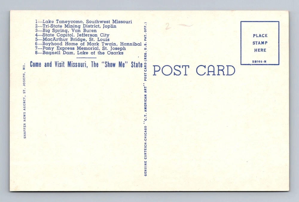 Era: Vintage City: Missouri Country/Region of Manufacture: Unknown Theme: Cities & Towns Material: Paper Original/Licensed Reprint: Original Type: Printed (Lithograph) Postage Condition: Unposted Subject: Cities & Towns Region: Missouri Unit of Sale: Single Unit Country: USA Size: Standard (5.5 x 3.5 in)