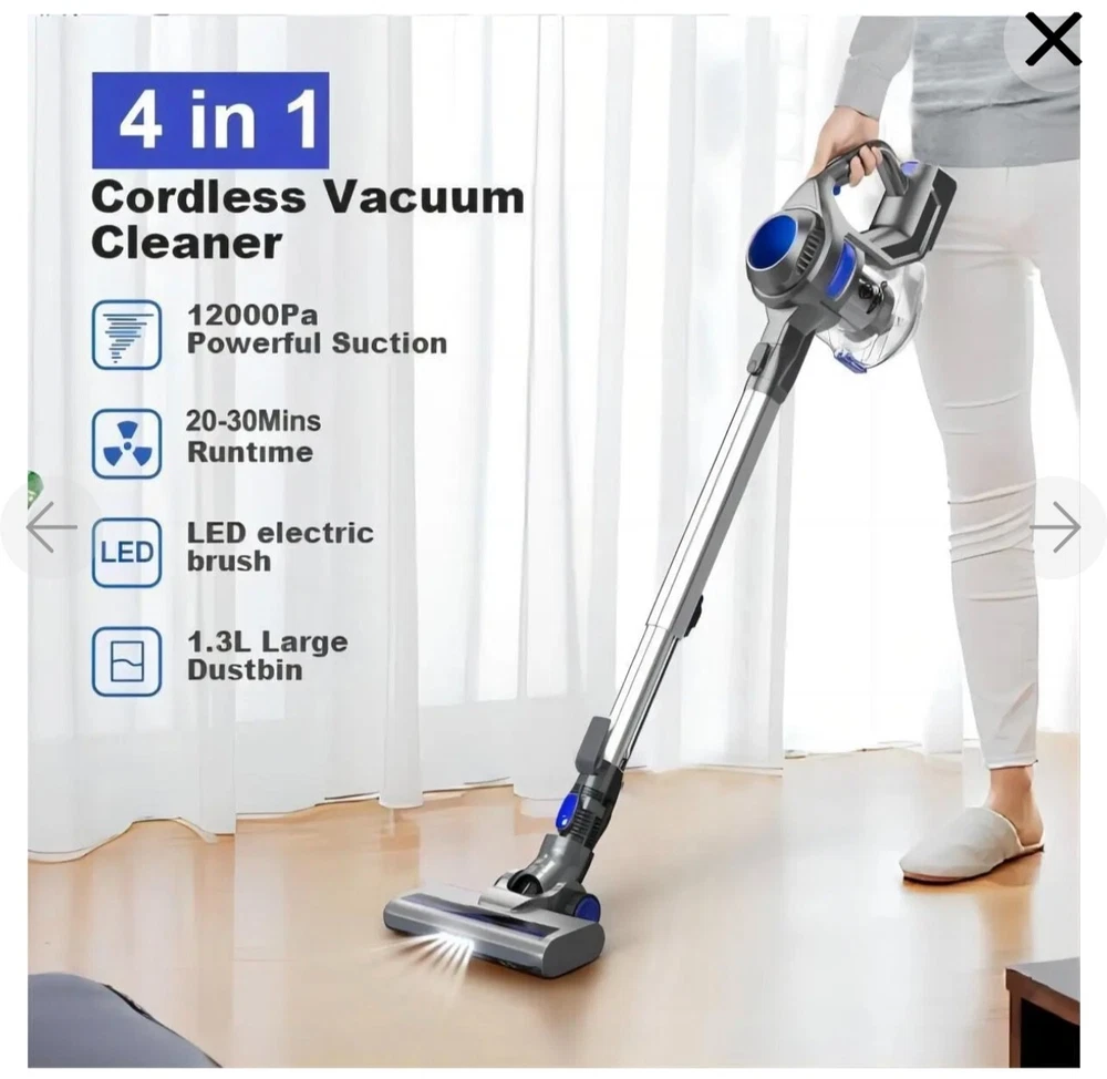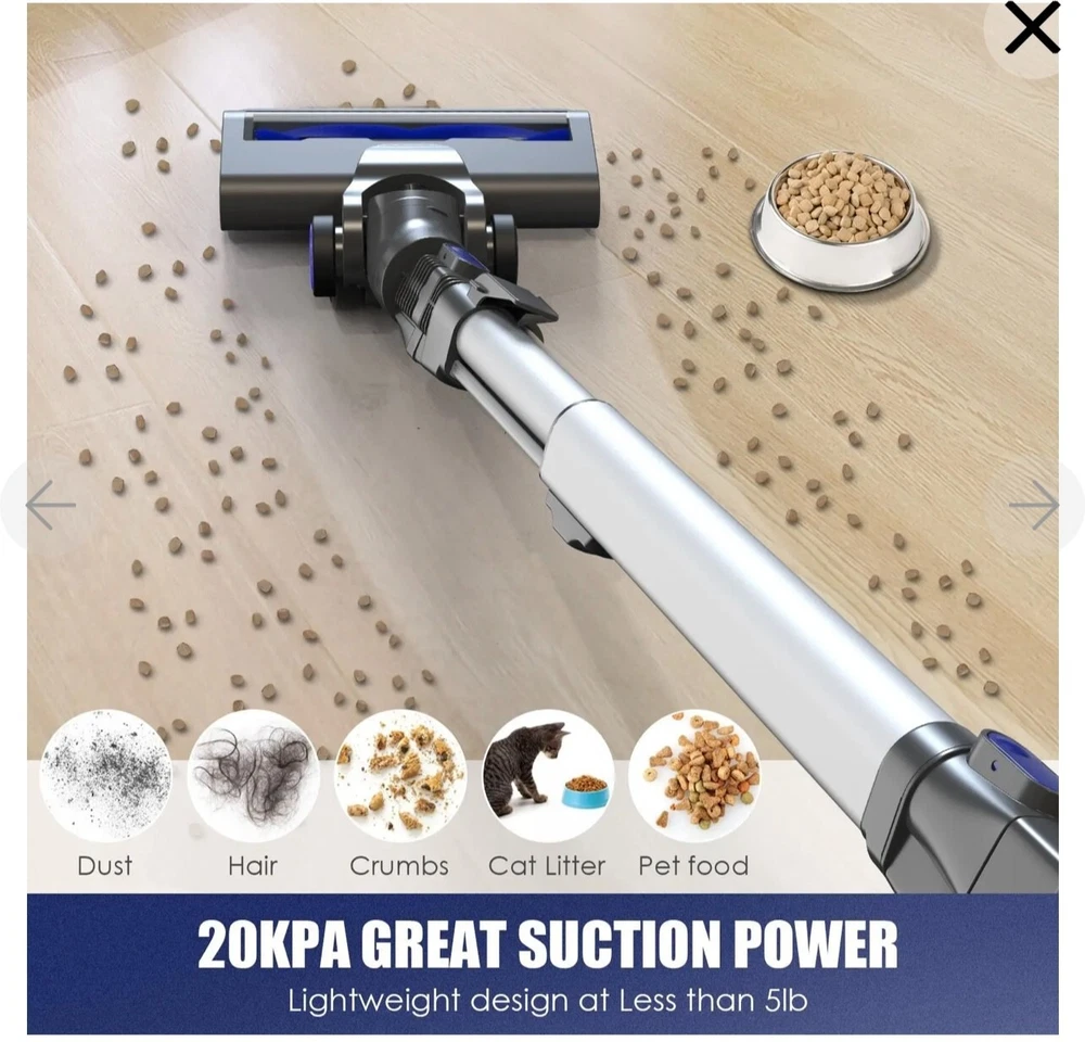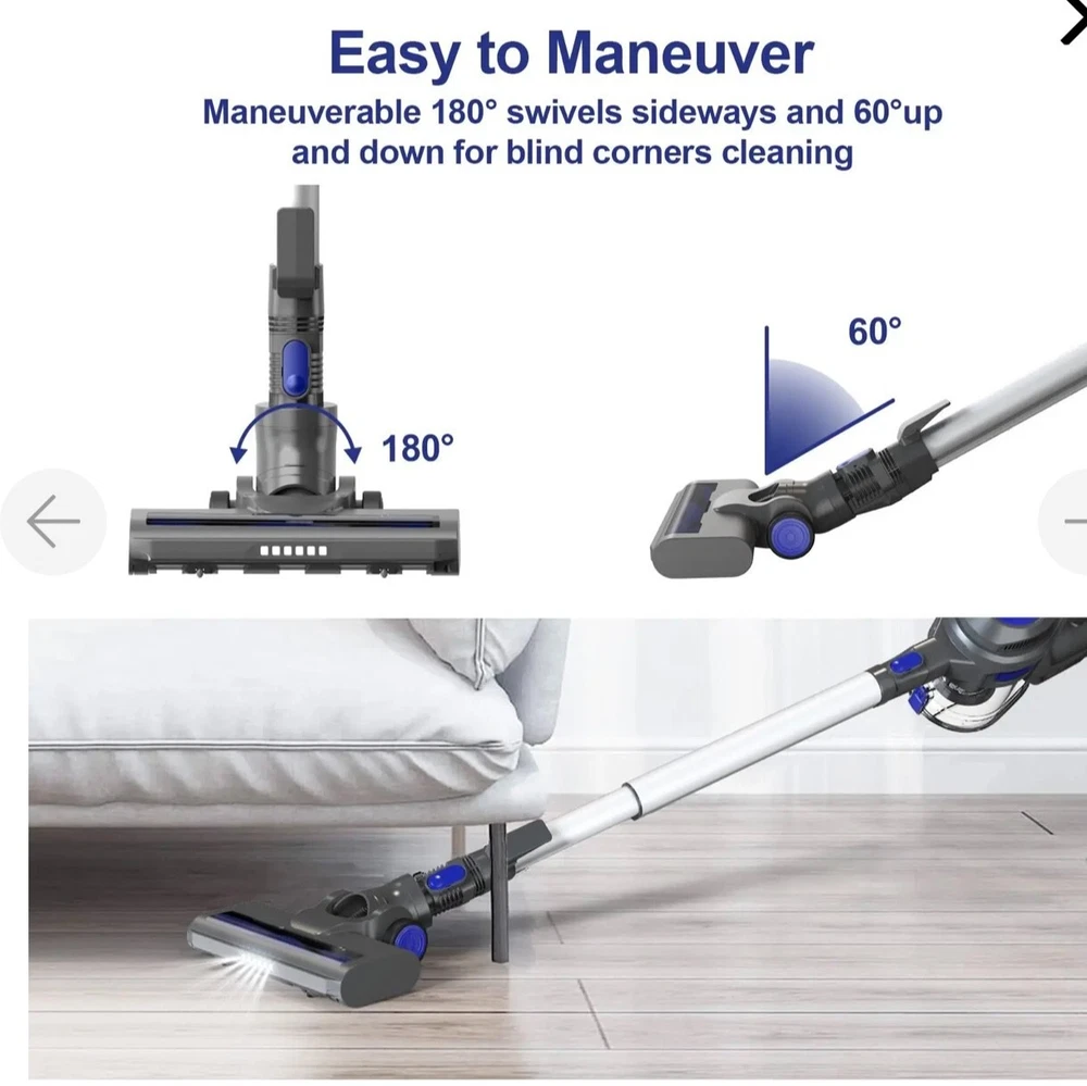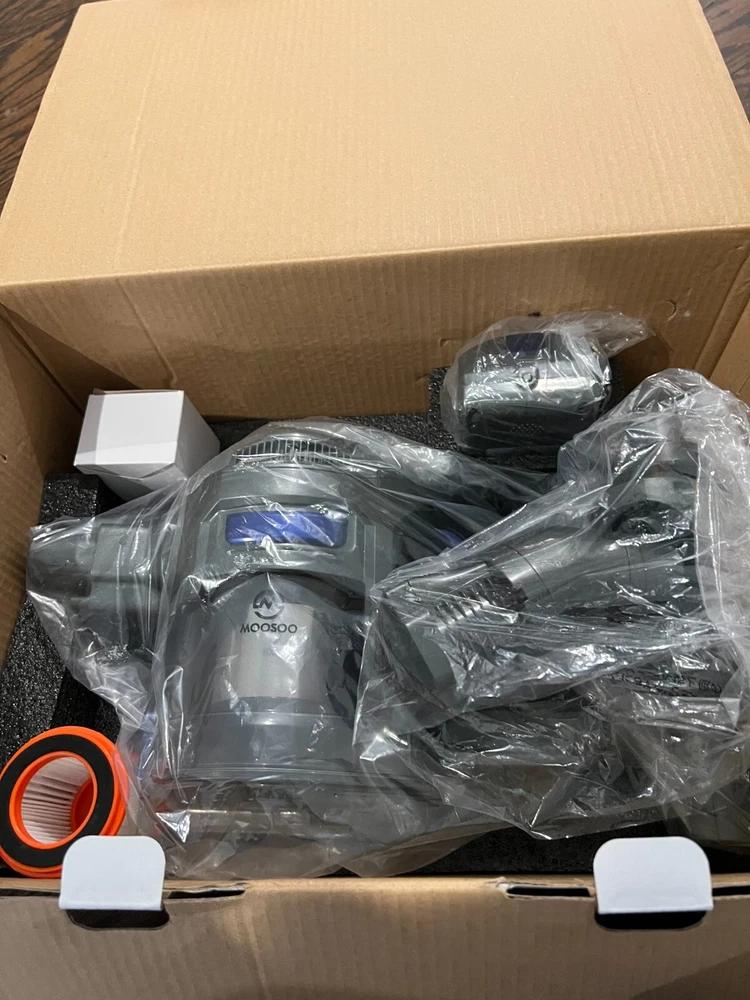 This is Open boxes item, but everything else are new inside the box. free shipping with usps Moosoo XL-618A: Cordless Vacuum 4-in-1 Lightweight Stick Vacuum Cleaner - Blue [Super Long-lasting Battery & Powerful Suction]: Outstanding 20-35mins CORDLESS running time ensures thorough cleaning all around the house. The upgrade version provides 120-watt powerful suction to meet every cleaning demands, picks up debris and dusts, crumbs and pet hairs in minute. It performs well on all kinds of hard floors, carpet, stairs and windowsills, sofa and bed, desk and curtain, etc.i [High-efficiency Cyclone + HEPA Filtration System]: It creates a high speed rotating airflow to remove particulates from air. Plus high-density HEPA which removes up to 99.99% of microscopic dust particles as small as 0.1 microns, this vacuum cleaner provides ultimate purified air and excellent cleaning experience for every users. HEPA is washable and recyclable [Convenient Cordless Using + Widely Applicable Two Modes]: Wireless design makes you away from the hassle of cord and still provide up to 10000PA powerful suction to complete a thorough cleaning. 2 adjustable modes adapt to different situations and allow full use of the battery [Lightweight Main Machine + Detachable Battery]: The main machine weights only 3.3lb which can be equipped with different attachments for different tasks. With an ergonomic handle, people can hold the machine to finish cleaning . 2200mAh large capacity battery can be full charged in 5 hours [What You Get]: MOOSOO vacuum cleaner*1; Motorized floor brush*1 (features Led light for dirt seeking); 2 in 1 dusting brush*1 (for both narrow gaps cleaning and wide variety of dry pick up tasks); light aluminum alloy tube. *1; AC power adapter *1; 2200mAh battery *1; wall bracket *1; cleaning tool *1; user manual