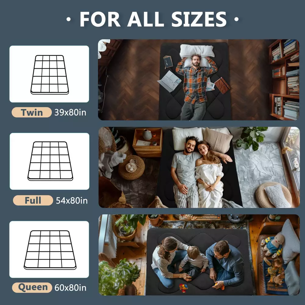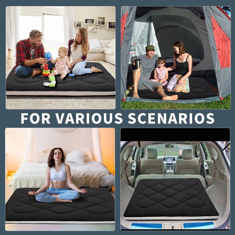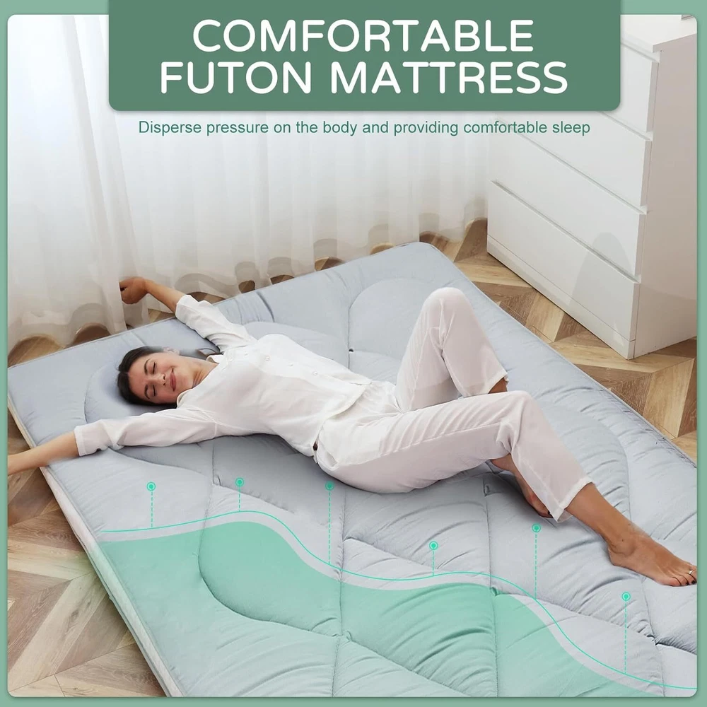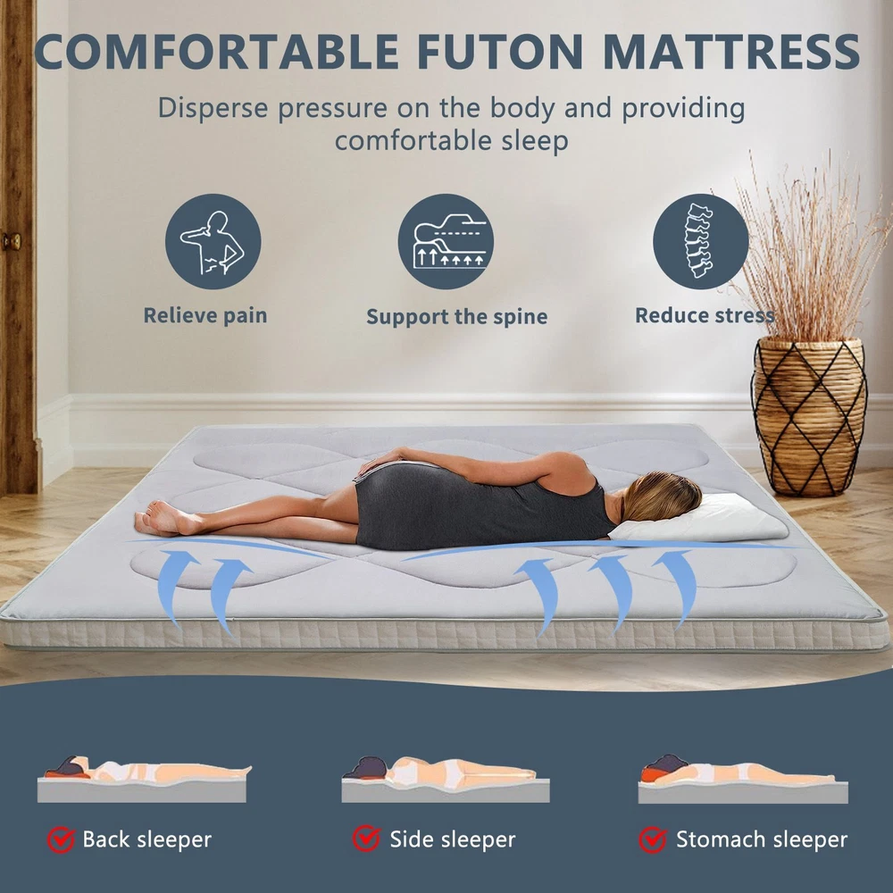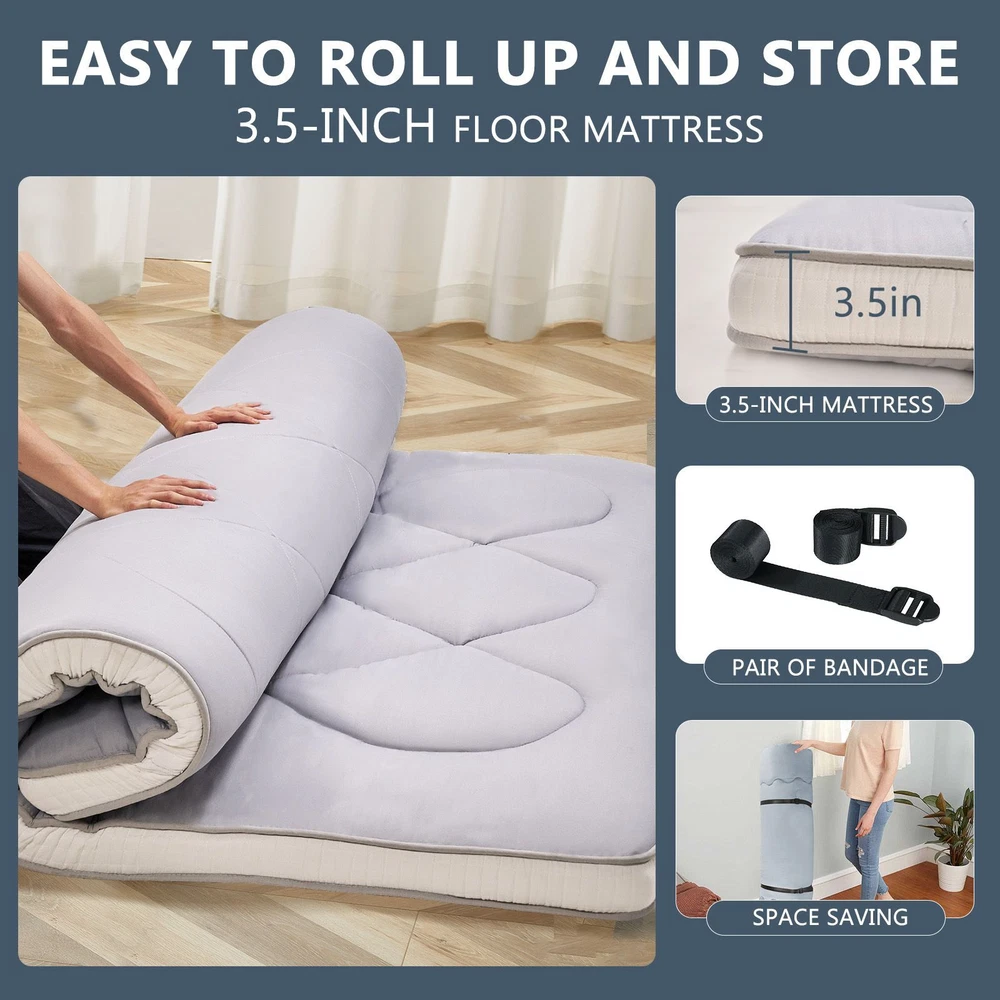UPGRADED JAPANESE FLOOR MATTRESS- Different from the old version of the floor mat with straight edge seam, our new tatami mattress added high density memory foam. The structure of the Futon Mattress is more stable and provides better support. Perfect for either directly as a floor bed or bed mattress topper; PREMIUM MATERIAL- Our Japanese Floor Mattress has a five-layer design that is skin-friendly, comfortable, and breathable. The combination of memory foam and additional padding filled in the mattress is not only soft, but also provides good support for your body, relieving your stress and making you extremely relaxed and comfortable; FINE WORKMANSHIP- The pattern is made very delicately and thoroughly but with strong, firm thread. The borders of the mattress are hemmed to make it more structured and intact. The floor mattress has three sizes: Twin/Full/Queen, meeting your different needs; MULTI-FUNCTIONAL MATTRESS- The mattress pad can be used indoors and outdoors, it could be used as a bedroom futon, tatami mat, sleeping floor mat, children's play mat, also could be guest mattress bed or camping tent mattress. It is excellent for both adults and children. You may take it with you everywhere you go in your car. Just enjoy your life with our futon mattress; WARM TIPS- Due to compressed package, there may be a lump in the middle of the mattress, please don't worry, it will disappears after the mattress is laid flat on the floor for a few days. Please dry the floor mattress frequently in the sun to keep it fluffy; Size and color Twin Size: 3.5" thick x 39" wide x 80" long;Gray or Black Full Size: 3.5 " thick x 54" wide x 80" long; Gray or Black Queen Size: 3.5 " thick x 60" wide x 80" long ; Gray or Black Feature A unique, minimalist approach to sleeping The Futon is originating in Japan, this soft, rollable Japanese mattress can easily be set up on the tatami mats on the floor to provide airy yet firm support. 5-Layer Futon Mattress These five-layer futons disperse pressure on the body making for comfortable sleep even if have back pain. Inside "Made in Japan" "MADE IN JAPAN" stands for the world-class manufacturing and factories behind the exceptional quality of our futons. A P