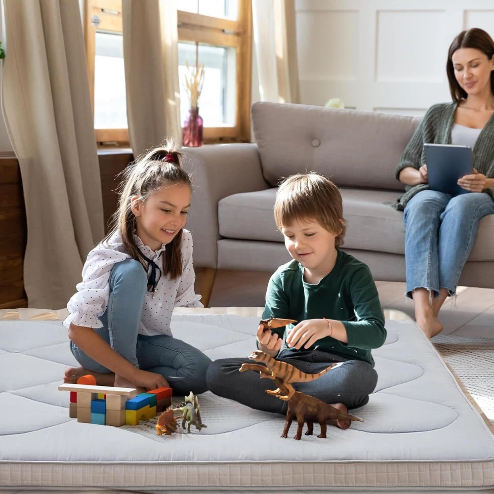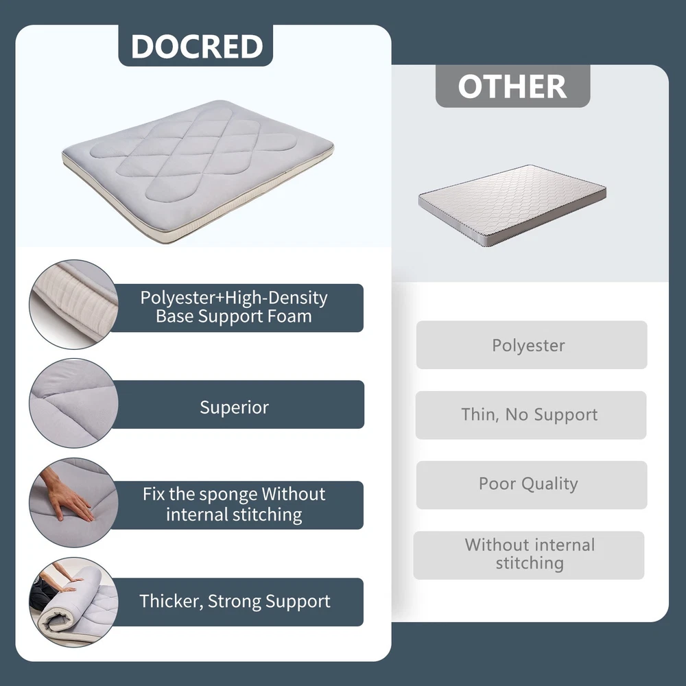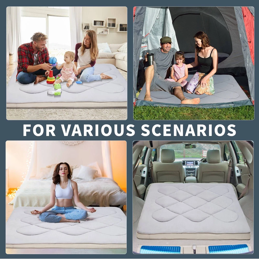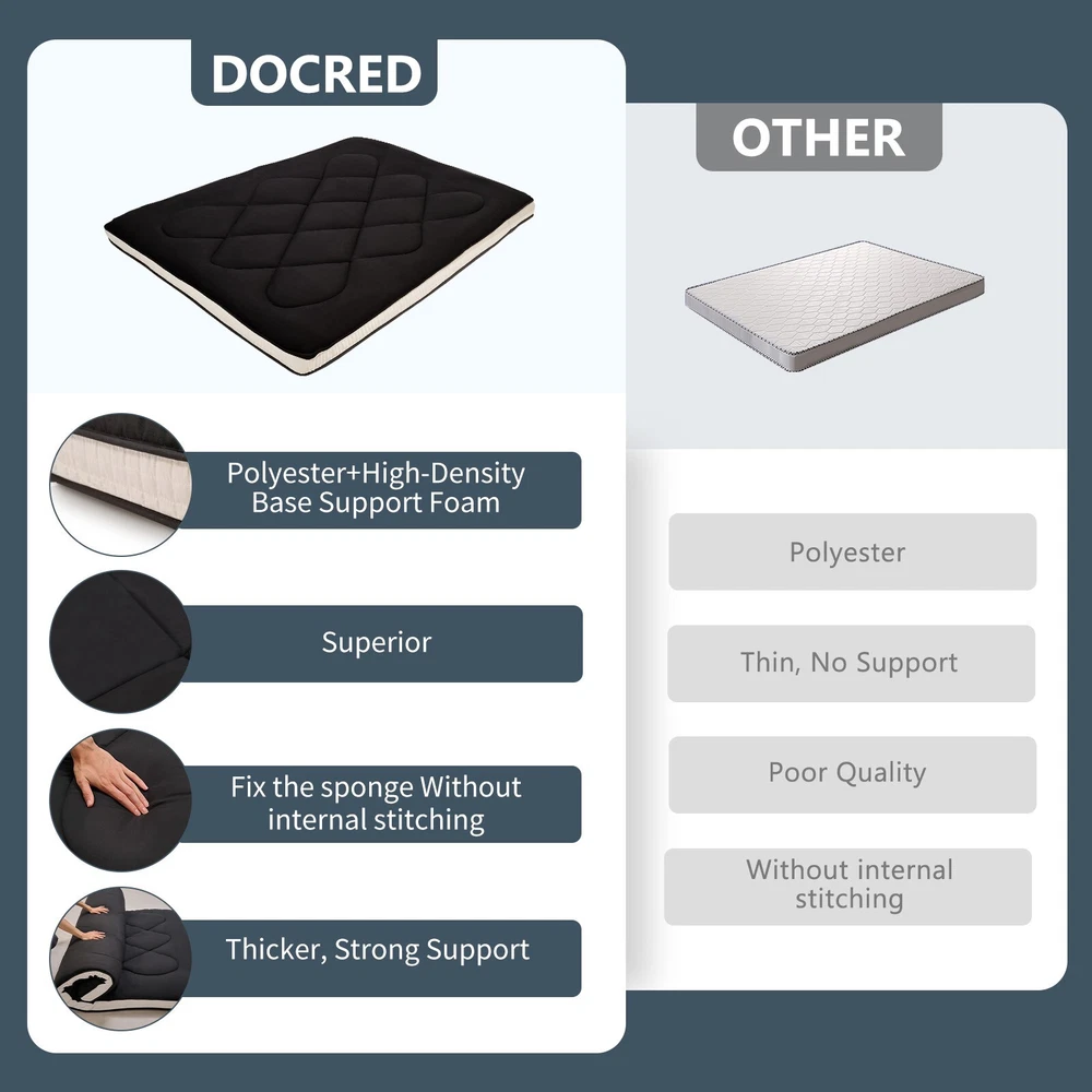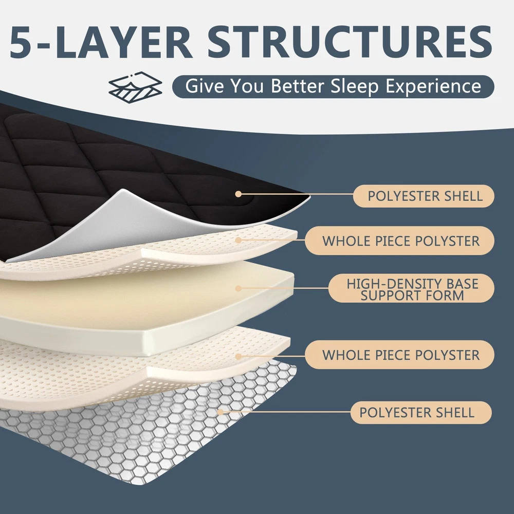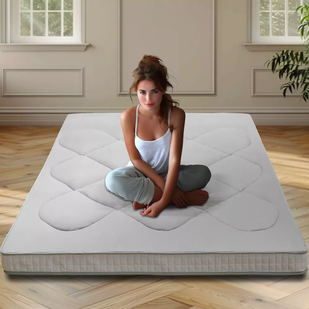 UPGRADED JAPANESE FLOOR MATTRESS- Different from the old version of the floor mat with straight edge seam, our new tatami mattress added high density memory foam. The structure of the Futon Mattress is more stable and provides better support. Perfect for either directly as a floor bed or bed mattress topper; PREMIUM MATERIAL- Our Japanese Floor Mattress has a five-layer design that is skin-friendly, comfortable, and breathable. The combination of memory foam and additional padding filled in the mattress is not only soft, but also provides good support for your body, relieving your stress and making you extremely relaxed and comfortable; FINE WORKMANSHIP- The pattern is made very delicately and thoroughly but with strong, firm thread. The borders of the mattress are hemmed to make it more structured and intact. The floor mattress has three sizes: Twin/Full/Queen, meeting your different needs; MULTI-FUNCTIONAL MATTRESS- The mattress pad can be used indoors and outdoors, it could be used as a bedroom futon, tatami mat, sleeping floor mat, children's play mat, also could be guest mattress bed or camping tent mattress. It is excellent for both adults and children. You may take it with you everywhere you go in your car. Just enjoy your life with our futon mattress; WARM TIPS- Due to compressed package, there may be a lump in the middle of the mattress, please don't worry, it will disappears after the mattress is laid flat on the floor for a few days. Please dry the floor mattress frequently in the sun to keep it fluffy; Size and color Twin Size: 3.5" thick x 39" wide x 80" long;Gray or Black Full Size: 3.5 " thick x 54" wide x 80" long; Gray or Black Queen Size: 3.5 " thick x 60" wide x 80" long ; Gray or Black Feature A unique, minimalist approach to sleeping The Futon is originating in Japan, this soft, rollable Japanese mattress can easily be set up on the tatami mats on the floor to provide airy yet firm support. 5-Layer Futon Mattress These five-layer futons disperse pressure on the body making for comfortable sleep even if have back pain. Inside "Made in Japan" "MADE IN JAPAN" stands for the world-class manufacturing and factories behind the exceptional quality of our futons. A P