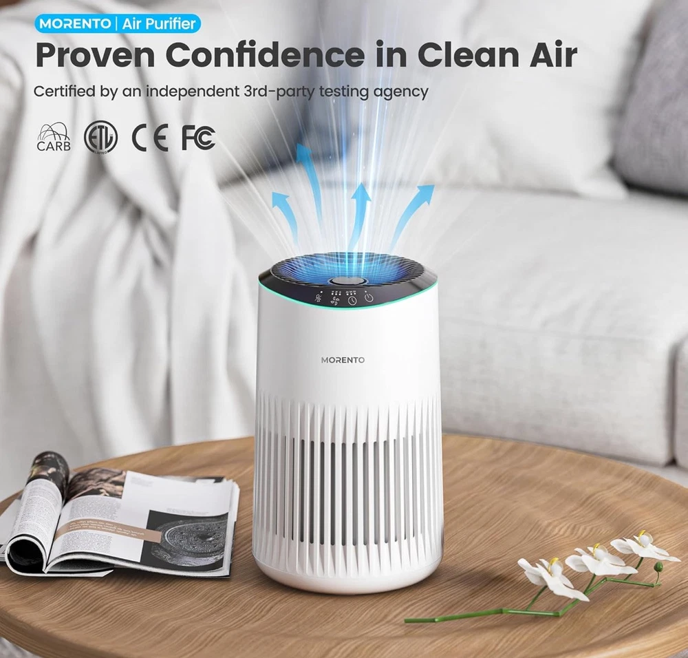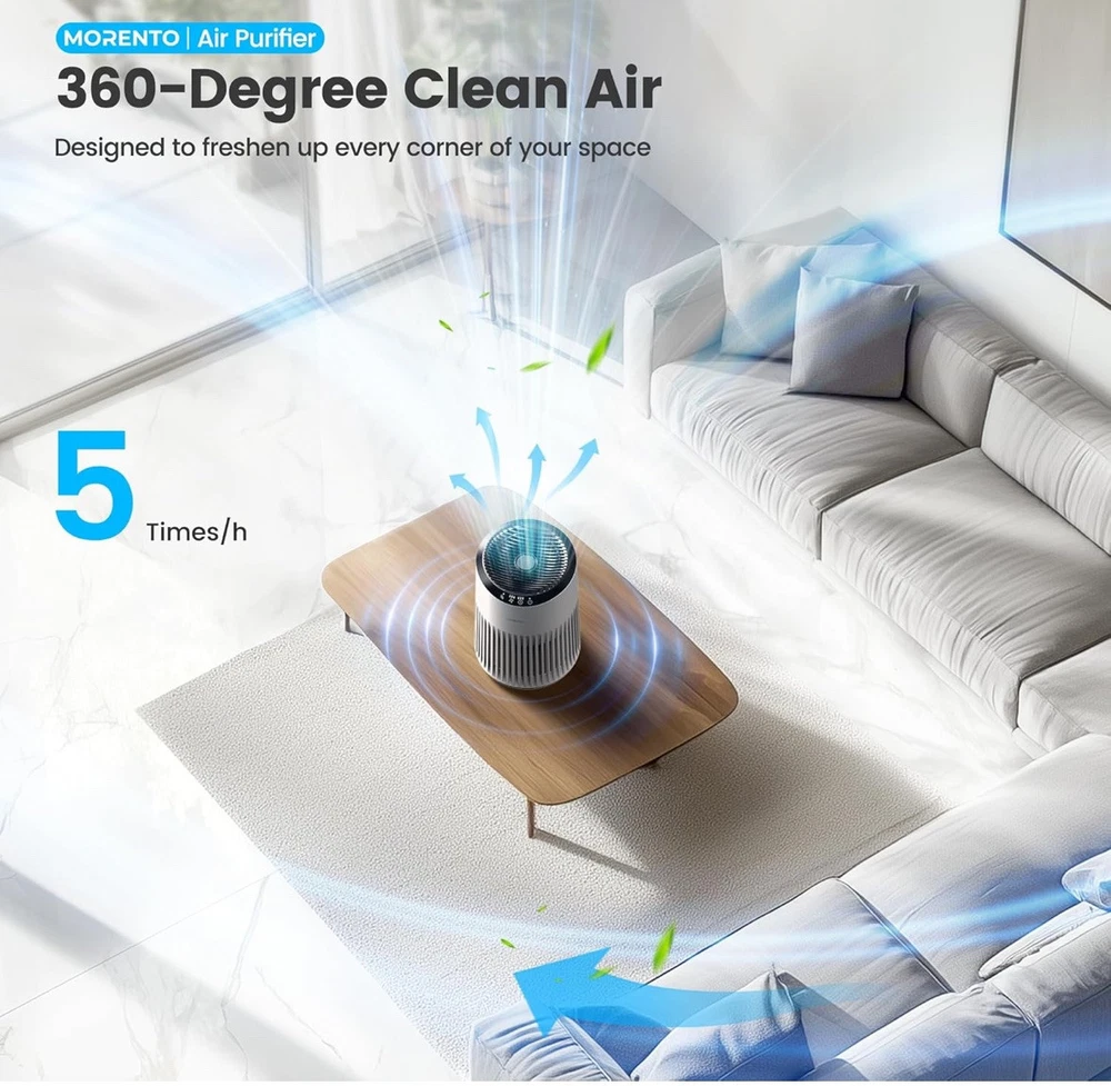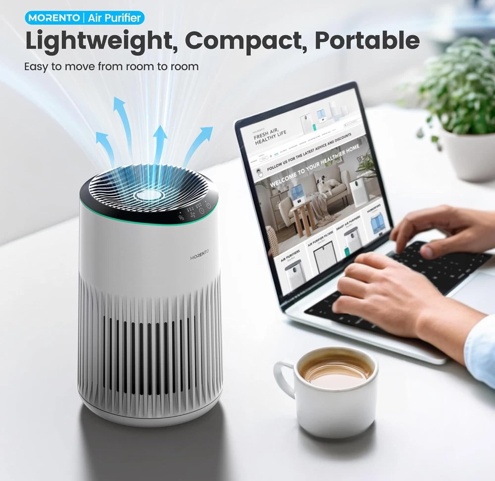 Color White Brand MORENTO Product Dimensions 6.38"D x 6.92"W x 10.98"H Power Source dc Item Weight 1.13 Kilograms Control Method Touch Experience the Breath of Fresh Air: Our air purifiers for home is equipped with a cutting-edge original filter designed to sweep away impurities with ease. It's the effectively filter out particles like smoke, pollen, and dust. Plus, the specialized pet dander filter is your new best friend for trapping pet hair and neutralizing pesky odors. Upgrade your indoor air quality and safeguard your family's respiratory health In 22dB Serenity: The air purifier not only cleans your air but also enhances your room's ambiance with a built-in blue ambient light. Simply switch to sleep mode and let the gentle glow fade away after three seconds. With an ultra-quiet operation at just 22dB, you'll drift off to dreamland in a peaceful, light-free environment that's perfect for a restful night's sleep Invigorate Your Space with Scents: Experience the luxury of fresh and fragrant air right. Simply add 4-5 drops of your favorite essential oil to the dedicated aromatherapy pad on top of your air purifier. In no time, the scent you love will blend with the purified air, filling the room with a healthy, comforting atmosphere and a delightful aroma that promotes relaxation and well-being Personalized Clean Air Control: The hepa air purifiers for home comes with 2 adjustable fan speeds, labeled 1F and 2F, allowing you to tailor the air purification to your environment's needs. Choose the lower speed for subtle air cleaning or the higher speed for rapid purification. Plus, with the convenience of a built-in timer, you can set the air purifier to turn off after 2, 5, or 8 hours, perfect for when you're asleep or away from home All-Encompassing 360-degree Clean Air: Our air purifiers for bedroom is engineered with a 360-degree air intake system for thorough, uniform air purification, no matter where you place it. It's versatile enough for bedrooms, dorms, apartments, offices, kitchens, and basements. Plus, with the sleek and portable design of the air purifier, you can effortlessly transport it from room to room, ensuring a breath of fresh air wherever you need it Proven Performance for Your Peace of Mind: The MORENTO MR2566 air purifier has been rigorously tested and certified by an independent 3rd testing agency. It's designed to effectively absorb a wide range of air particles, ensuring your breathing space is as clean as can be. Simply switch on this high-efficiency unit and immerse yourself in a constant stream of fresh, comfortable air Keep Your Air Purifier at Peak Performance: You'll know it's time to freshen up your air purifier when the ""Filter"" button starts to glow red after 2000 hours of use. Just hold down the ""Filter"" button for 5 seconds to reset the system. For the best results, we advise replacing your filter every 3 to 6 months. Make sure to stick with authenticity by using the official "MORENTO" filters – look for ASIN: B0DCY8L196 or ASIN: B0DD428PZG The Thoughtful Present: This compact and versatile air purifiers for home pets is not just great for your home; it's an ultimate present for friends and family. It's designed to fit any gift-giving occasion, such as Christmas gifts, birthday gifts, housewarming gifts, etc. Please Note: MORENTO MR2566 air purifier comes with an adapter, which is placed inside the filter of the air purifier