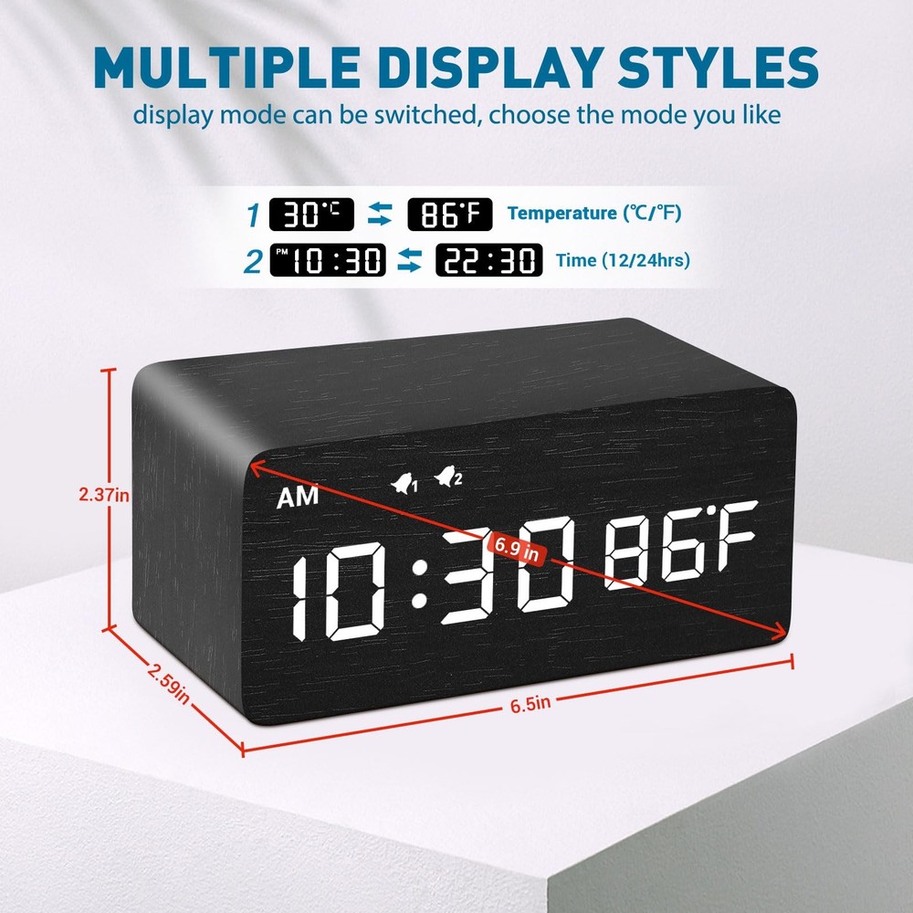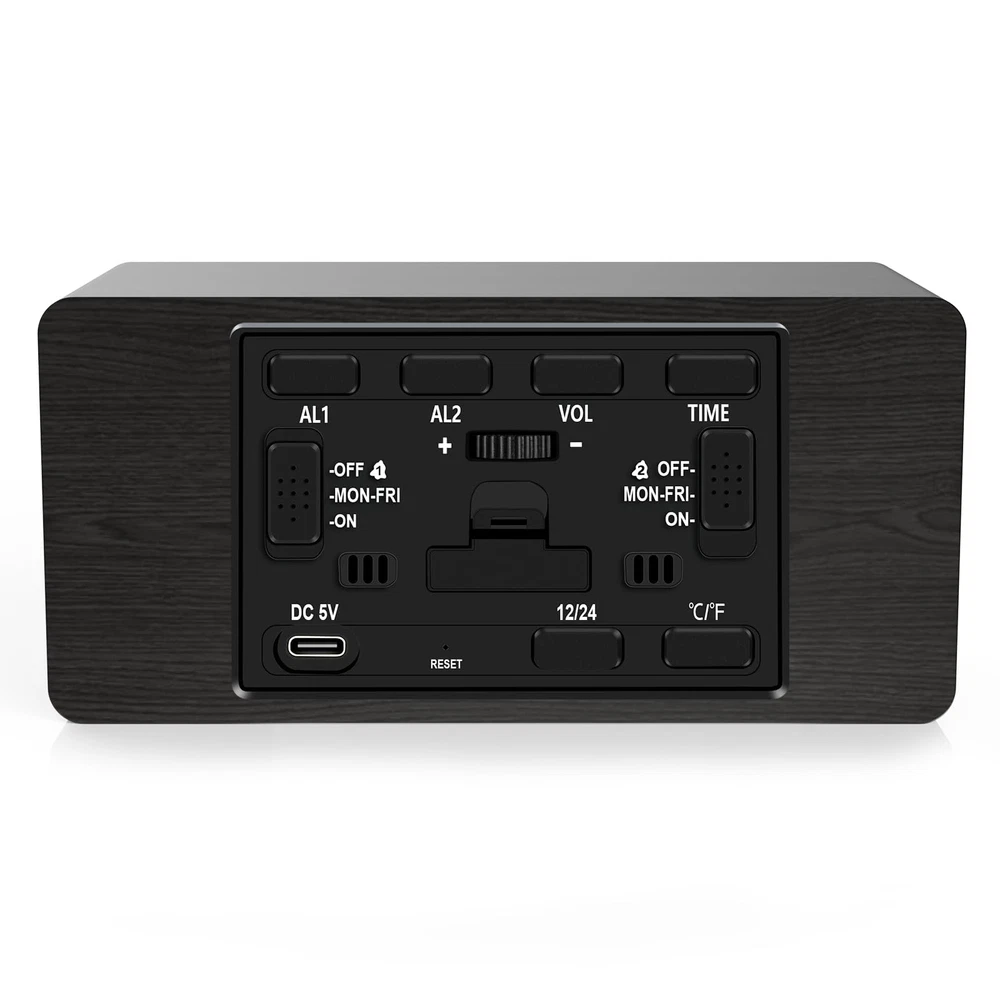 MOSITO Wooden Digital Alarm Clock with Temperature Display and Wireless Charging ⏰【Stable Wireless Charging Station】- This wireless charging alarm clock supports wireless charging for universal cellphones in a stable and efficient way without overheating. It is very convenient and saves space, keeping your bedside table tidy. ⏰【5 Level Brightness Adjustable alarm clock】- Compared with the alarm clocks on the market that only have three levels of brightness adjustment, this wooden alarm clock is upgraded to 5-level dimming. Customers can adjust the brightness to 5 percentile(0, 20%, 40%, 60%, 80%, 100%), which solves the problem of too bright display at night and helps you fall asleep better. ⏰【Dual Alarm with Snooze Function】- It has dual alarms, and each alarm clock has 3 working modes: off, everyday alarm, weekday alarm. The alarm volume is 5 levels customizable from very low for light sleepers to extra loud for heavy sleppers adults. The alarm lasts for 2 minutes, and the snooze function helps you easily get an extra 5 minutes of sleep. ⏰【Stylish Wood Grain Surface】- This exquisite digital alarm clock is made of high-quality wood and has a stylish design. It is not only a clock, but also a perfect decoration for your home. You can put it anywhere in your room, on your bedside nightstand or living room table. The stylish appearance and multiple functions make it suitable as a gift for your family or friends. ⏰【Reliable After-sale Service】- We offer 1-year free repleacment service and lifetime after-sale support, if there is any quality problem with Fomobest wooden digital alarm clock, please contact us, 7x24 hours professional after-sale service will provide you with 100% satisfied solution!