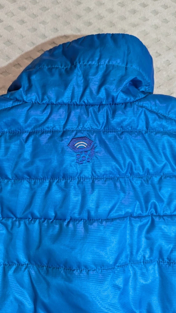 Mountain Hardwear puffer jacket men's size large. I found this jacket second hand. Measurements are; collar seam to bottom 28 inches, underarm to underarm 24 inches, underarm to cuff 23 inches, sleeve length 35.5 inches (measured mid collar out shoulder to end of cuff).