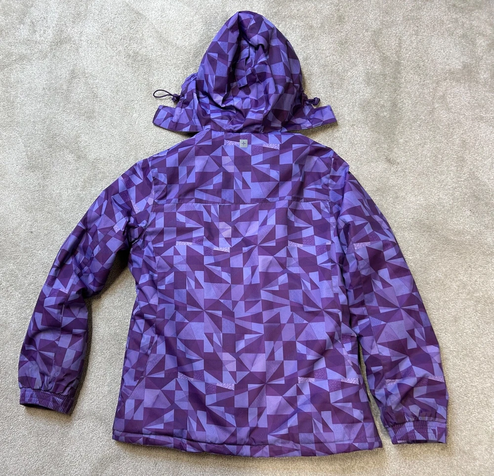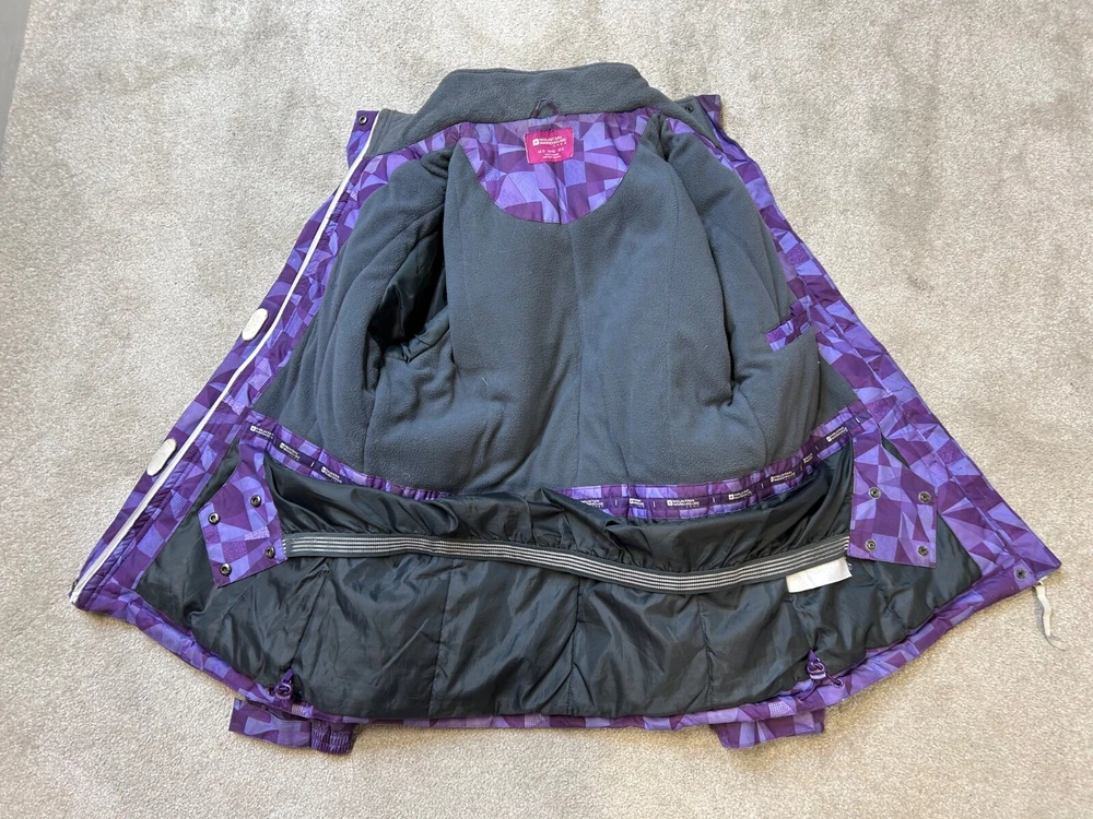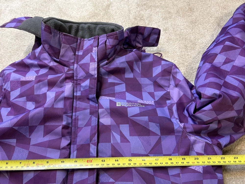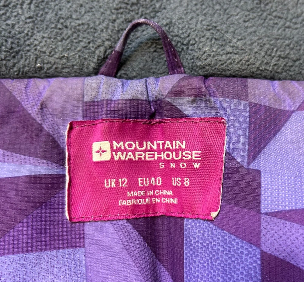 Ladies Purple printed padded hooded jacket from MOUNTAIN WAREHOUSE High neck full zip fastening Fully lined & padded Front zipped pockets Hood Please note: There are a few scuffs around the pocket and cuffs Material: 100% polyester Lining& wadding : 100% polyester Label size: UK 12 Garment measures: Pit to pit: 22" Pit to hem: 17" Neck to hem: 28" Pit to cuff: 20" Stock ref: 3581 / 03124