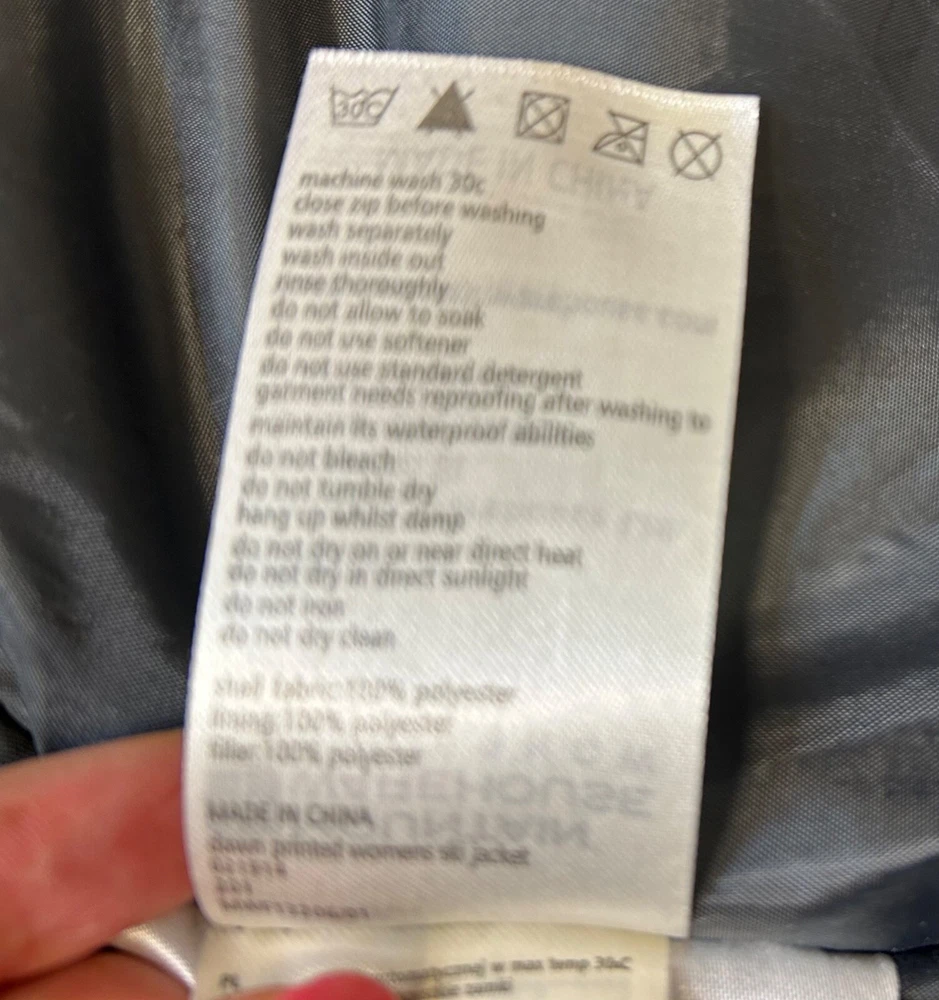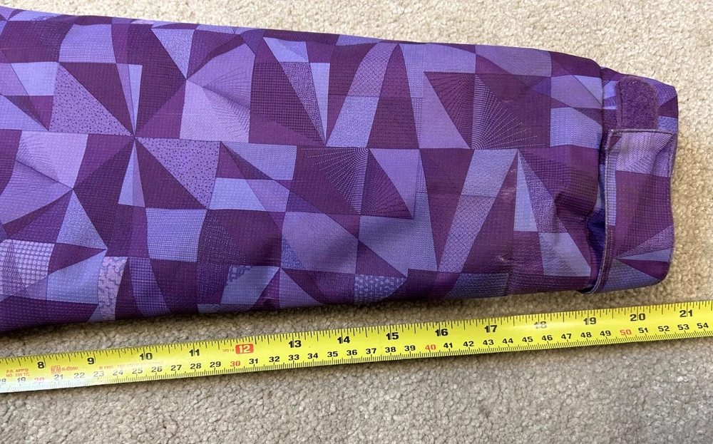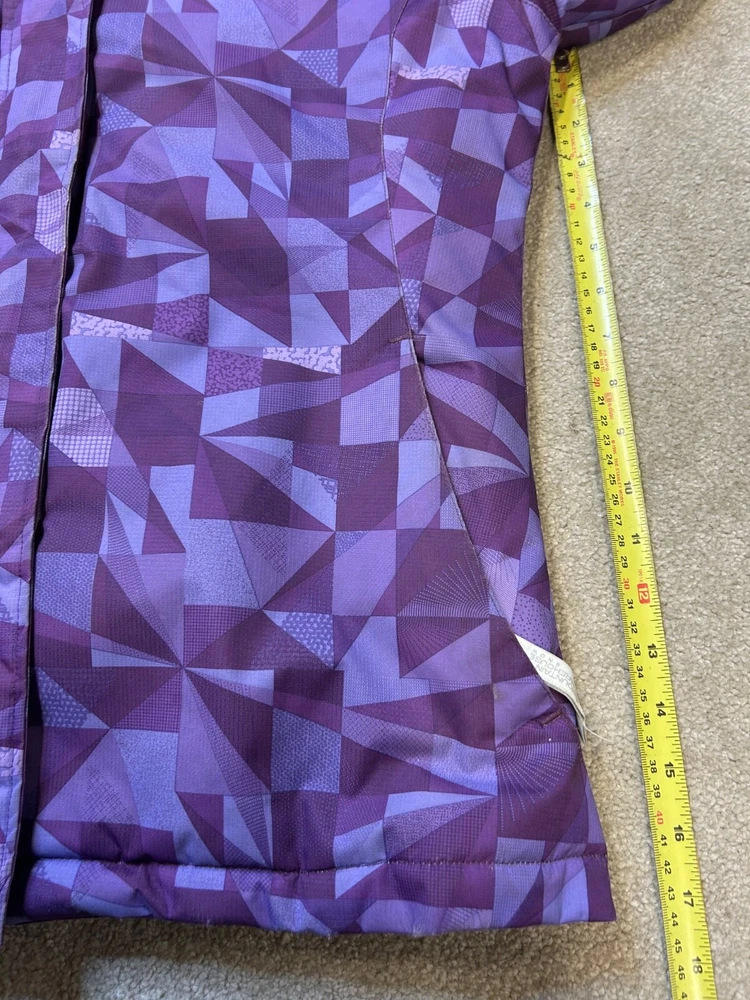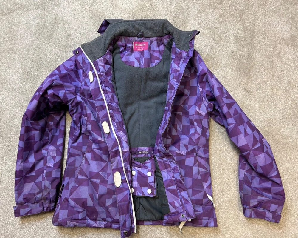 Ladies Purple printed padded hooded jacket from MOUNTAIN WAREHOUSE High neck full zip fastening Fully lined & padded Front zipped pockets Hood Please note: There are a few scuffs around the pocket and cuffs Material: 100% polyester Lining& wadding : 100% polyester Label size: UK 12 Garment measures: Pit to pit: 22" Pit to hem: 17" Neck to hem: 28" Pit to cuff: 20" Stock ref: 3581 / 03124
