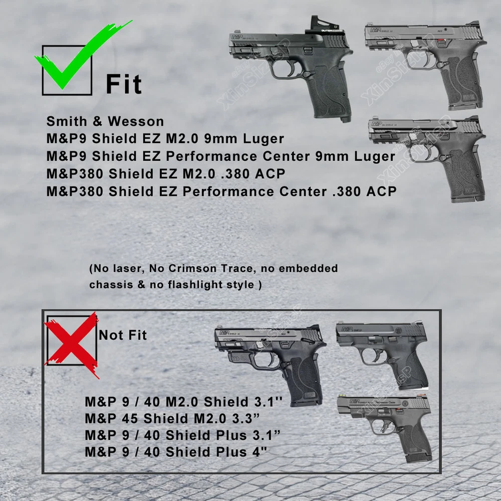 High Quality Military & Police Grade Polymer OWB Holster Specially Designed For Fast Draw During Duty Or Shooting Competition. Tactical Holster fit Smith & Wesson Holster fit Smith & Wesson M&P9 Shield EZ M2.0 9mm Luger Smith & Wesson M&P9 Shield EZ Performance Center 9mm Luger Smith & Wesson M&P380 Shield EZ M2.0 .380 ACP Smith & Wesson M&P380 Shield EZ Performance Center .380 ACP Not fit: M&P9 Shield EZ M2.0 with Crimson Trace Red Laserguard 3.68" M&P9 Shield 3.1" M&P9 Shield Plus 3.1" M&P9 M2.0 Shield 3.1" Barrel M&P9 Shield Plus 4" Barrel M&P40 Shield 3.1" M&P40 Shield Plus 3.1" M&P40 M2.0 Shield 3.1" Barrel M&P40 Shield Plus 4" Barrel M&P45 Shield 3.3" M&P45 Shield Plus 3.3" M&P45 M2.0 Shield 3.3" Barrel (It perfect fit the gun with Optic Mount Mini Sight above on the end of the barrel, But without laser and no embedded chassis, and no flashlight style ) Materials & Durable Made of durable high-tech polymer materials - Stronger than leather will wear out, the polymer holster will not wear out and get flimsy. High S afety Q uick release button (Level II retention) , An audible click lock system ensures knowing when your weapon is securely holstered A djustable E asily set your paddle cant 0-60 degrees according to your preference with the Allen key Ease And Comfort Easy on / Easy off- No need to undo your belt every time you wear your holster.Sweat-proof- Protect your weapon from salty perspiration and not absorb sweat.Adapt to every environment In the Package: · 1*Holster with Paddle Attachment · 1*Allen Key Shipping: Ships same day or next except Sundays and Holidays ! Free shipping! Ship by USPS First Class Package. 100% MONEY BACK GUARANTEE. Any question please be free to contact with us .Thanks!