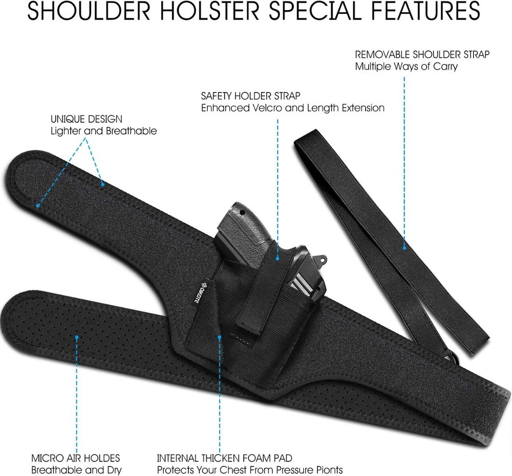 Product Description ULTIMATE UNIVERSAL SHOULDER HOLSTER THE QUALITY Concealed Carry Shoulder Holster has solved the comfort issue with a new breathable perforated neoprene base that lays softly against the body. At the same time we use the new narrow edge design, This allows you comfort for extended periods. FITS FOR MEN AND WOMEN shoulder gun holster fits for women and men. UNIVERSAL shoulder holster accommodates nearly every small subcompact, compact, mid-size and even full size pistols and revolvers on the market. SIZE Available in two sizes; Size 39": Suitable for 32-37 inch chest, Size 45": Suitable for 38-43 inch chest. FITS Fit Glock 17 22 19 23 Glock 26 27 29 42 43 and Glock 34 Glock 35, S&W M&P Shield 9mm M&P Bodyguard 380 M&P9 M2.0 M&P40 M2.0 S&W SD9, Sig Sauer P226 P229 P238 P938 P365, P220 P320, P210 SP2022 Sig LEGION and Sig 1911, Beratta 92X PX4 APX 92G, Springfield XD XD-M XD-S XD-E 911 and 1911 SERIES, Taurus 92 G2c G2s G3 TH40 TH9 TX22, Walther PPK 380 CCP Creed PPS PPQ, Ruger LCP, EC9s LC9s LC380, SR1911, Kimber solo Kimber Micro 9, Kel-Tec P-11, Hi Point 9mm Heckler and Koch P30SK, Kahr PM9, FNS-9 Compact, Subcompact and Full sizes THE WARRANTY The holster is fully refundable if you are not satisfied within 90 days. FEATURES Patented Design in USA Waist Carry Or Underarm Carry Holster Allows for Both Left-handed or Right-Handed Draw Universal Fit For Nearly Any Type of Firearm Conceal Easily With Low Profile, No-Print Design Premium Neoprene PACKAGE INCLUDES: 1 x Holster 1 x Strap
