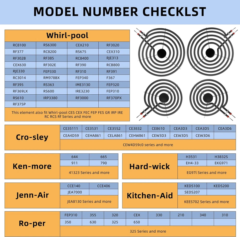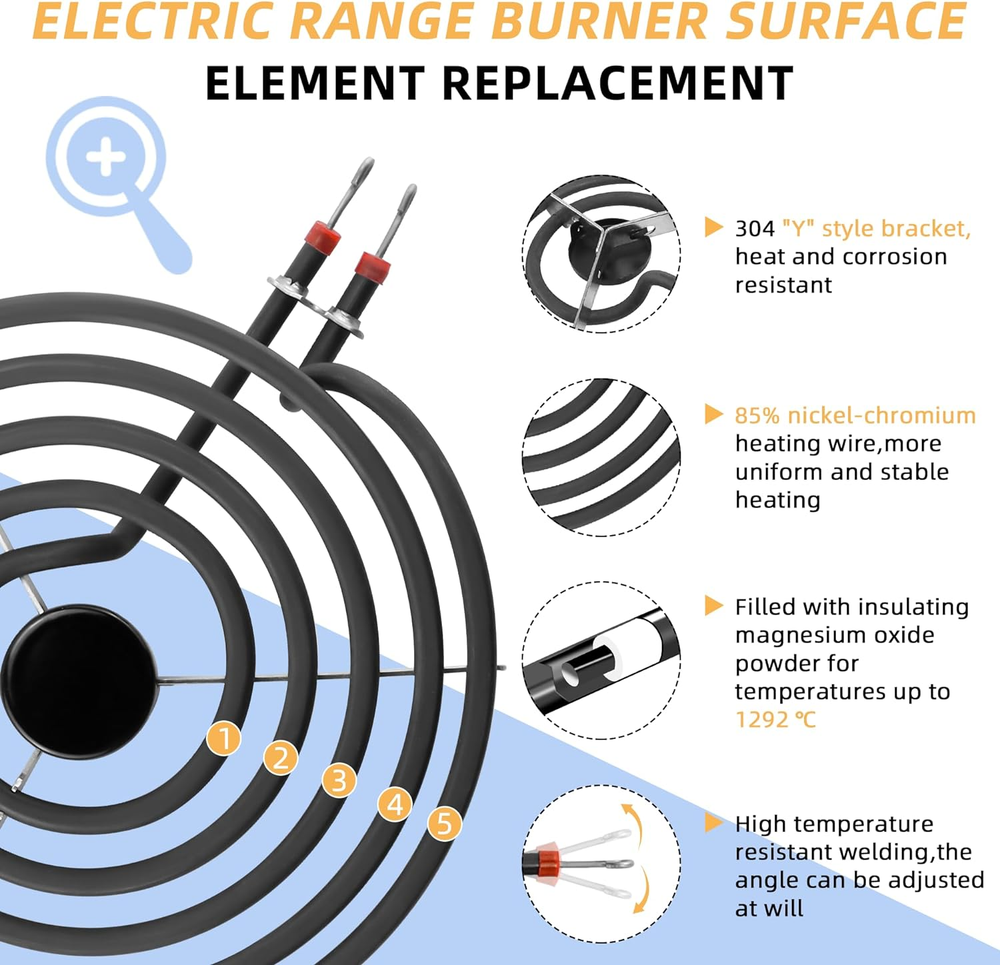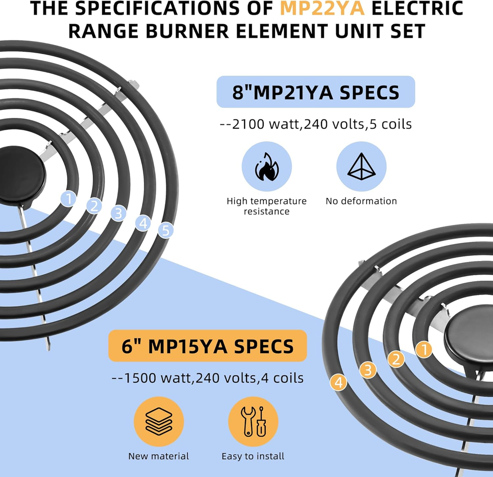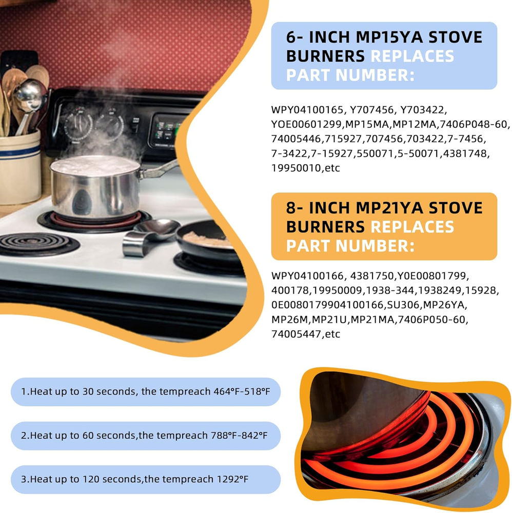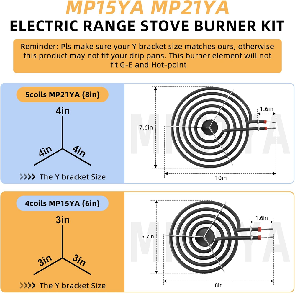 Store New Arrivals Add to Favorite View Feedback Contact MP22YA Electric Range Stove Burner Element Set (4 Pack)-Include 2 X MP15YA 6" & 2 X MP21YA 8" Stove Burner for Ken-More May-Tag Hard-Wick Whirl-Pool Electric Range Stoves by Description Item model number MP22YA Part Number MP22YA Batteries Required? No Finish Metal Color Black Material Metal tube Item Weight 3.16 pounds Shape Round Voltage 230 Volts Usage Stainless steel electric heating tube is an electrical component that converts electrical energy into heat energy. Because of its low price, convenient use, convenient installation and no pollution, it is widely used in various heating occasions. The service life of stainless steel electric heating tube is very long, and the general design The service life is more than 10,000 hours. Special Features The stainless steel electric heating tube is made by placing electric heating elements in the metal tube, and filling the gap with crystalline magnesium oxide powder with good heat resistance, thermal conductivity and insulating properties, which is processed by other processes. It has the characteristics of simple structure, high mechanical strength, high thermal efficiency, safety and reliability, easy installation and long service life. Is Discontinued By Manufacturer No Package Dimensions 11.18 x 8.7 x 4.61 inches Included Components Electric Range Burner Element Unit Set - Include 2 pcs MP15YA 6" and 2 pcs MP21YA 8" Stainless steel, nickel-chromium, iron-chromium alloy Imported 【Replace Number】This stove burner set fits for most ranges. (Reminder: It does not fit for GE and Hotpoint. If you select the wrong burner set, it will not fit your stove.) Electric stove burners replace 660532, 316439801, AP4502986, 77001106, ERS46Y15, Y04000034, 5303310283, WB30T10089, S46Y15, 5304431014, 484783, SU204, TS5W8221, 404099, Y04000033, S58Y21, 9761347, 12001231 etc. If you are not sure if it is suitable, and we will check for you 【Warm Tips】The new stove burner set has a protective coating on it to protect the surface. On first use, the protective coating will evaporate with the high temperature and there may be a little smoke, this is normal as this is caused by the protective coating of the new burner element. Don't worry, just keep using it. Easy to install, saving time and money. Please disconnect the power when repairing 【Parts Information】Stove Burner MP22YA Electric Range Burner Element Unit Set include 2 x MP15YA Electric Stove Range Surface Burner 6" 1500W 230V 4-Turns & 2 x MP21YA Electric Range Burner Element 8" 2100W 230V 5-Turns. Newly upgraded nickel chrome cooktop burners for quick heat up. During use, the temperature rises rapidly without deformation, and the temperature can reach up to 1300 degrees Celsius 【Premium】Our stove burner set is completely designed with non-polluting, safe and long-lasting materials. MP22YA electric stove coil set has small resistance temperature coefficient, high resistivity, and is not easy to deform and embrittle at high temperature. Extends the service life of your range stove. Range burner element has a "Y" style bracket. The multiple turns of the coil can provide higher cooking performance, resulting in better heating performance 【Buy With Confidence】If you are not satisfied with the electric range burner, ! We will show you our sincere attitude and satisfactory solution. Answering customer questions in a timely manner is always our aim Product Description 6 Inch Stove Top Surface Burner Element: This Part PD00002540 (WP660532) replaces these parts: 3319 AP6010189 PS11743366 EAP11743366258897 308378 308381 309191 309192 309249 309250 309251 309334 313964 313967 313968 561103 660528 660529 WPY04100165 Y707456 Y703422 Y0E00601299 MP15MA MP12MA 7406P048-60 74005446 715927 707456 703422 7-7456 7-3422 7-15927 550071 5-50071 4381748 19950010 15927 0E00601299 04100165 Y04100165 1242501 AP6024130 PS11757480 EAP11757480 PD00003241 8 Inch Stove Top Surface Burner Element: This Part PD00002540 (WP660533) replaces these parts: 3289 AP6010190 PS11743367 EAP11743367 241419 241420 241598 241743 244013 244032 244063 244064 244147 256702 256703 256704 256705 256706 256707 WPY04100166 4381750 Y0E00801799 400178 19950009 1938-344 1938-249 15928 0E00801799 04100166 SU306 MP26YA MP26M MP21U MP21MA 7406P050-60 74005447 715928 715928 707457 707457 7-7457 7-15928 550072 550072 5-50072 Y04100166 AP6024131 PS11757481 EAP11757481 1242502 PD00003012 ABOUT US We offer the best prices around on high quality products. Our E-store includes media such as books, movies, music and games while offering electronics, toys, sporting apparel, clothing, tools, general home, garden items and more. SHIPPING We are always working hard to ensure your package arrives as soon as possible. Please understand that some factors like weather, high postal traffic, and the performance of shipping companies are outside of our control. We offer free shipping to the lower 48 states and ship within 2 business days of payment, usually sooner. We do not accept P.O. Boxes. Please provide a physical address. For shipping outside of the continental USA, we only use eBay's Global Shipping Program.The item is shipped to KY and then sent to the rest of the world. International customers are responsible for all duties and taxes. Continue to check out in order to calculate costs for shipping the item to your country. Messages regarding eBay's Global Shipping Program MUST be directed at eBay EXCLUSIVELY. RETURNS We offer a 30-Day Return Policy on items which you are not completely satisfied with. You have the option for a full-refund or an exchange of the item. No returns are available on items shipped outside of the USA. PAYMENT We accept PayPal. CONTACT US This page content is yet to come Please ad us to your favorite seller and visit again later Thank You CUSTOMER SATISFACTION We try our very best to make sure every customer is completely satisfied. If there's a problem, message us! We're