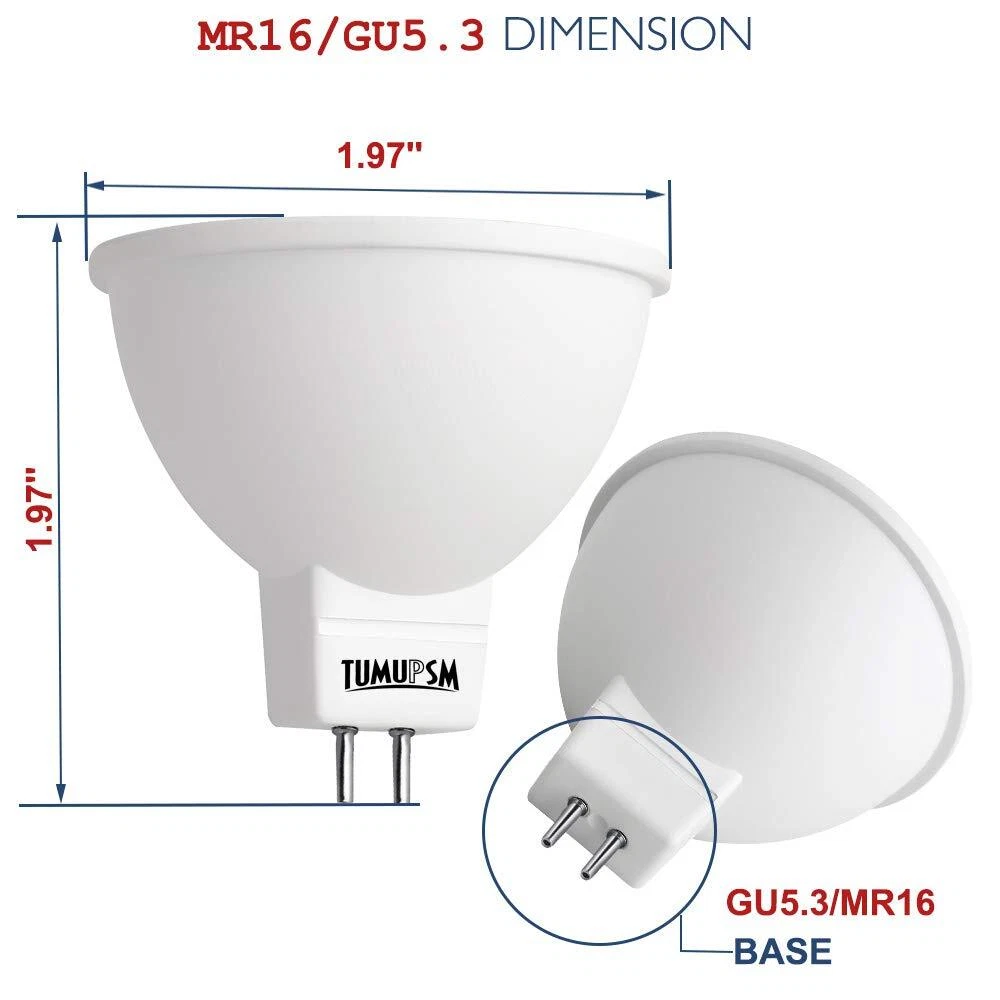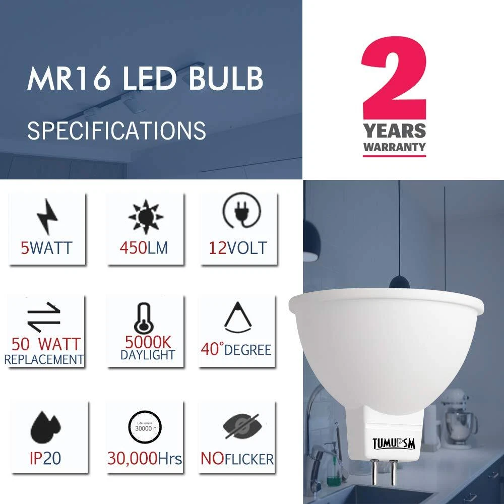 MR16 LED Light Bulbs 12V AC/DC, Non-Dimmable, 5000K Daylight White, Bipin Base, 40 Degree Narrow Flood Beam Angle, GU5.3 LED Spot Light Pack of 6 Features and specifications instant on mr16 led light bulbs 500lm 5000K bright daylight white color shock and vibration proof 50Watt mr16 Halogen bulb Equivalent, led bulbs good colour rendering CRI>80 High lumen efficiency over 100lm/w Average life of 30,000 hours 2 Years . (or is available,us directly through if you have questions or problems.) Applications Widely applied in indoor outdoor lighting like track lighting, can lighting, recessed lighting, landscape lighting. ideal for use in living room, bedroom, kitchen, hotels, restaurants, shops and offices. Caution 1.Turn off the power supply before installing the 12v mr16 led bulb. 2.Do not use in Enclosed fixtures, as this will shorten the lifespan of 12v led mr16 bulb. 3.IP Rating of the mr16 12v led flood is IP20, not waterproof, if you want to use outdoors, please use the mr16 led 12v spot light bulb in a place or a lighting fixture that can prevent the bulb from water. 4.Do not open the led mr16 light bulbs, as this will void the . If any problems happen during the , please us directly on . 5.To make better use of the mr16 gu5.3 led bulb, please keep it away from direct sunlight and wet or high temperature environment. 6.The 50w mr16 led spotlight could not be used as light and it has to be used in voltage AC/DC12V. The mr16 led bulbs are not dimmable, please do not use them with dimmer switches. NON-DIMMABLE- 5w AC/DC 12v 50w mr16 led light bulbs, non-dimmable, please do not use with dimmer switch, as this may cause flicker or noise. ENERGY SAVING- the mr16 led bulb 12v has 500 lumens output, equivalent to the light of a traditional mr16 halogen bulb 50w, saving over 90% on electricity bill, better use as outdoor led landscape light bulbs, track lighting bulbs, recessed lighting bulbs. BRIGHT & VIVID COLOR- Bright daylight white colour (5000K), high color rending(CRI>80), makes the color of mr16 gu5.3 led bulb more vivid, natural and soft. EASY INSTALLATION- standard mr16 gu10 shape gu5.3 bipin base, the 12v led mr16 bulb is easy to install, just plug and play.(The mr16 spot light is not waterproof, please keep it away from water for outdoor usage.) WIDE APPLICATION- contain no mercury or any UV/IR light, No flicker, No noise, outstanding heat dissipation, the mr16 12v led flood is safe for use in living room, bedroom, kitchen, museum, office, shops and stores.
