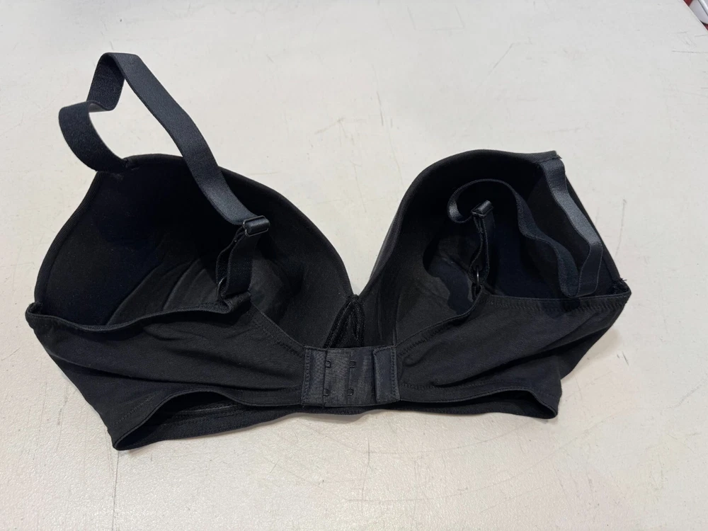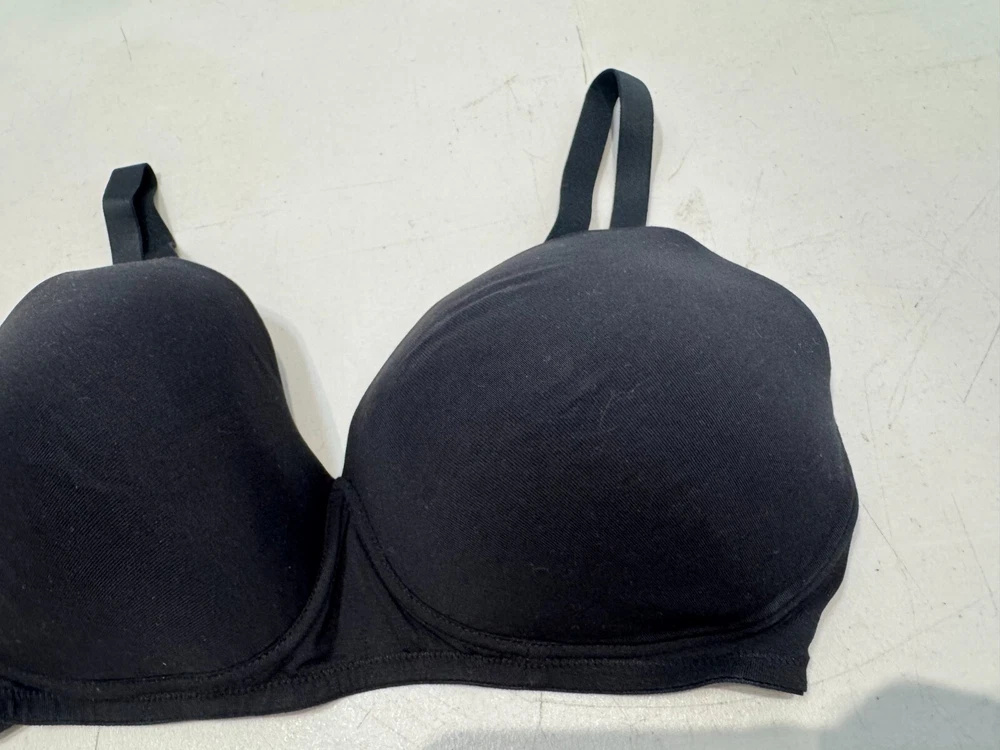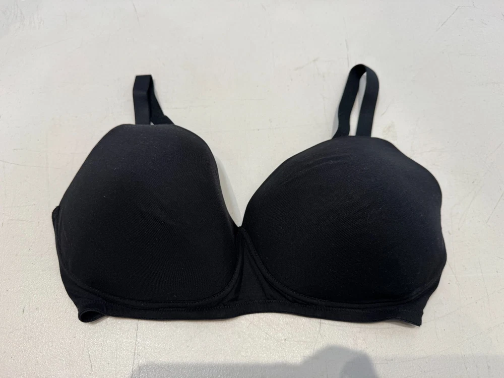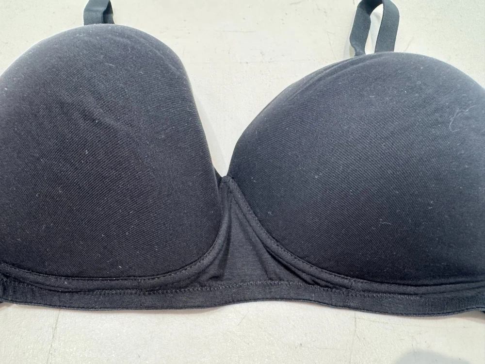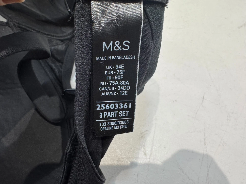 This is a Marks and Spencer black balconette bra in size 34E, designed with underwired support and padded cups for comfort. The bra features a hook & eye closure, bra straps, and a seamless design for a smooth fit. It is a wire-free style, suitable for everyday wear, with an opaque finish. Made in Vietnam, this regular-sized bra is a stylish and practical addition to any woman's lingerie collection.
