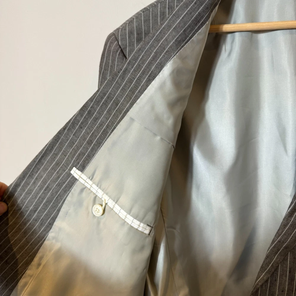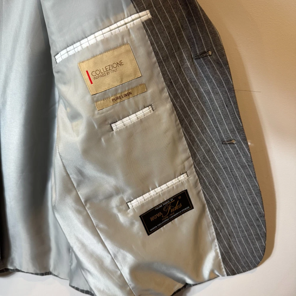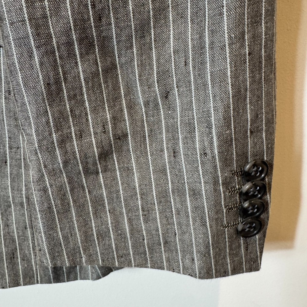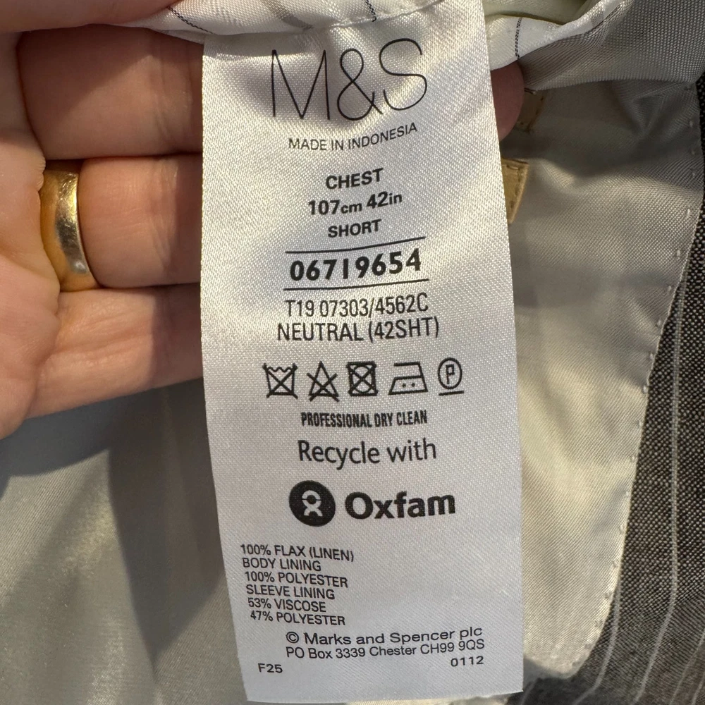 M&S Collezione Pure Linen Pinstripe Blazer Size 42 Short Smart grey/brown pinstripe blazer from the M&S Collezione range, crafted from pure linen using Italian fabric by Nova Fides (Prato, Italy). Lightweight and breathable — ideal for spring and summer events, weddings or smart casual styling. 📏 Size Labelled: 42 Short (42SHT) Approx measurements: Pit to pit: ~20–21 inches Length: ~30-31 inches (Please compare with a similar jacket for best fit.) 🧵 Fabric Outer: 100% Linen (Flax) Body Lining: 100% Polyester Sleeve Lining: 53% Viscose / 47% Polyester 🔎 Details Single breasted Pinstripe pattern Rear vent Button cuff detail Fully lined Italian woven fabric ✨ Condition Very good pre-owned condition. No major rips or structural damage. Light natural linen creasing (normal for fabric).