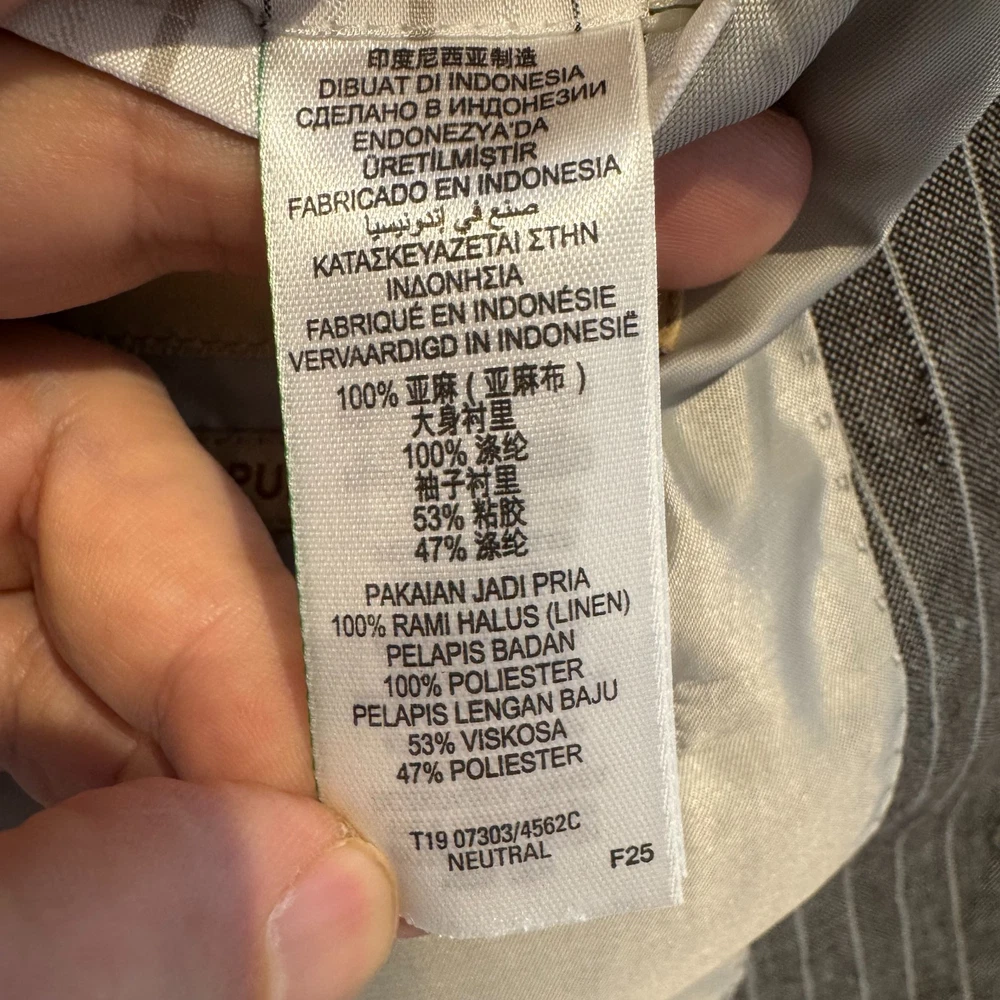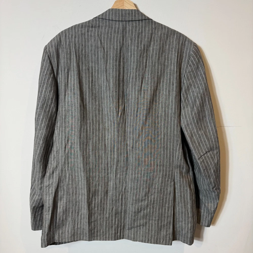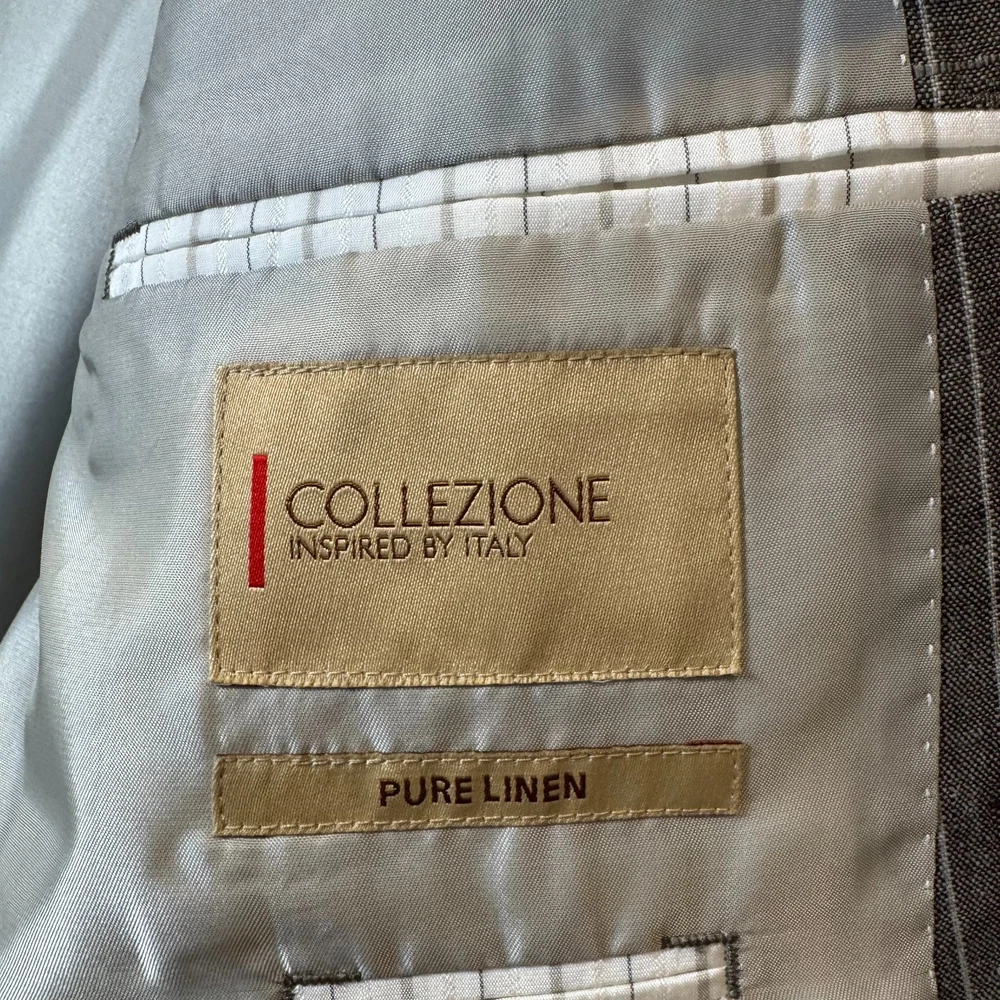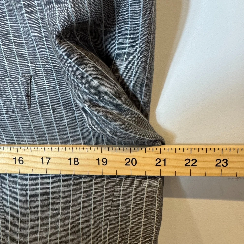 M&S Collezione Pure Linen Pinstripe Blazer Size 42 Short Smart grey/brown pinstripe blazer from the M&S Collezione range, crafted from pure linen using Italian fabric by Nova Fides (Prato, Italy). Lightweight and breathable — ideal for spring and summer events, weddings or smart casual styling. 📏 Size Labelled: 42 Short (42SHT) Approx measurements: Pit to pit: ~20–21 inches Length: ~30-31 inches (Please compare with a similar jacket for best fit.) 🧵 Fabric Outer: 100% Linen (Flax) Body Lining: 100% Polyester Sleeve Lining: 53% Viscose / 47% Polyester 🔎 Details Single breasted Pinstripe pattern Rear vent Button cuff detail Fully lined Italian woven fabric ✨ Condition Very good pre-owned condition. No major rips or structural damage. Light natural linen creasing (normal for fabric).