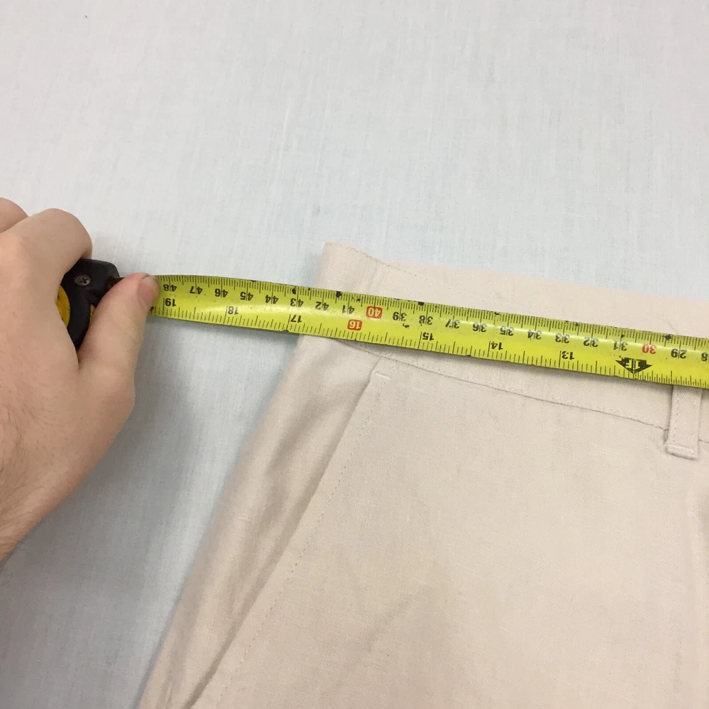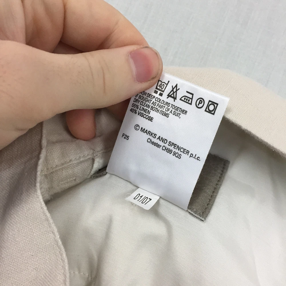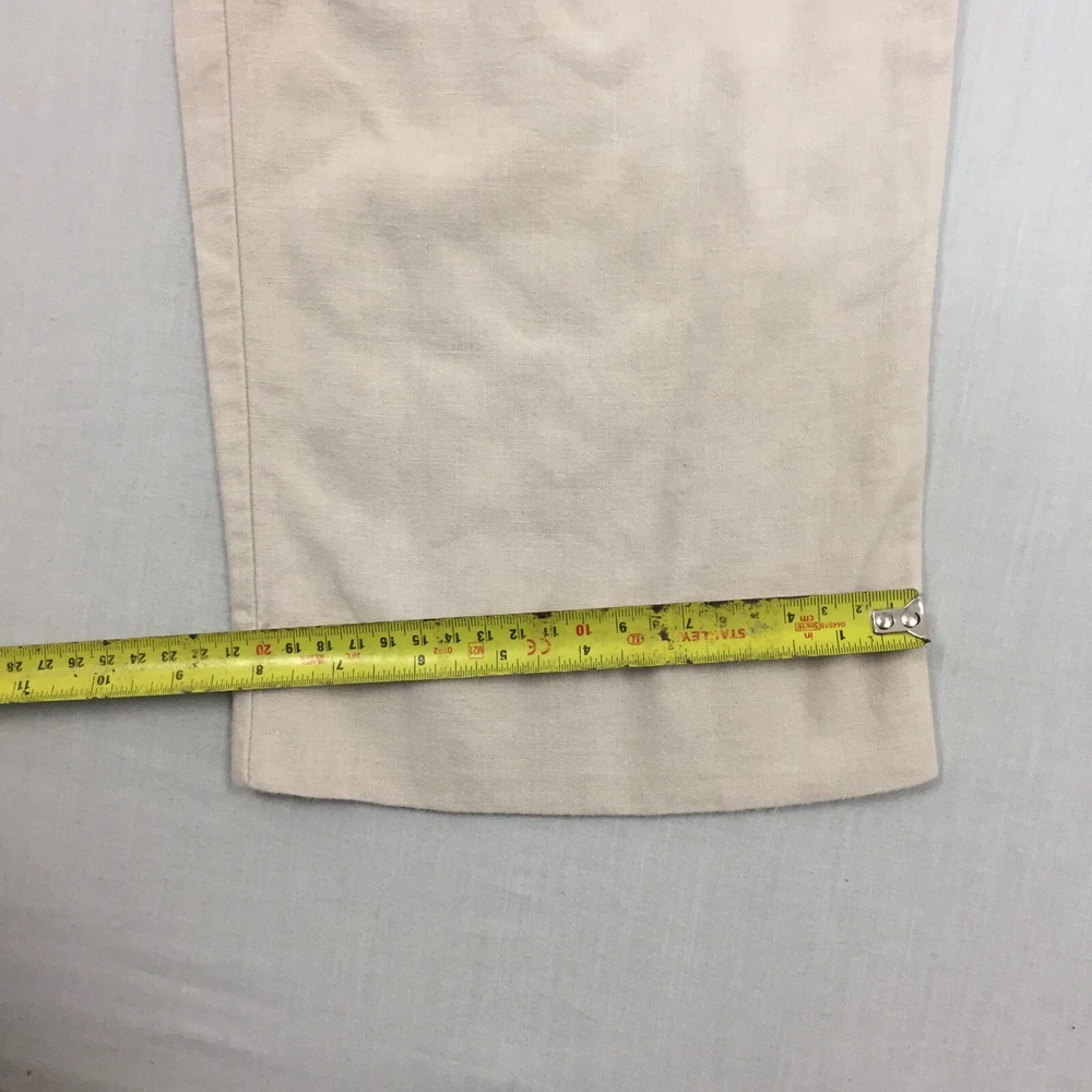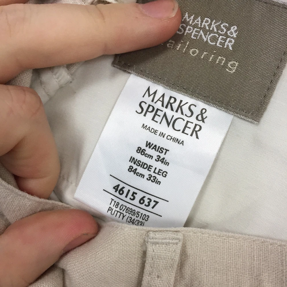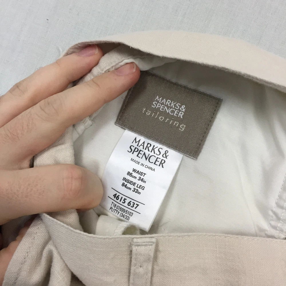 Inside Leg: 33 in Size: 34 Pattern: No Pattern Style: Chino Occasion: Business, Casual, Travel Closure: Button Personalise: No Pocket Type: Coin Pocket Season: Autumn, Spring, Summer, Winter Department: Men Material: Linen Brand: Marks and Spencer Handmade: No Size Type: Regular Rise: Mid (10-12 in) Seller Notes: “Good used condition, check below for full description & photos.” Vintage: No Fit: Regular Country/Region of Manufacture: Unknown Type: Trousers Leg Style: Straight Garment Care: Machine Washable Accents: Button Fabric Type: Canvas Colour: Beige Waist Size: 34 in