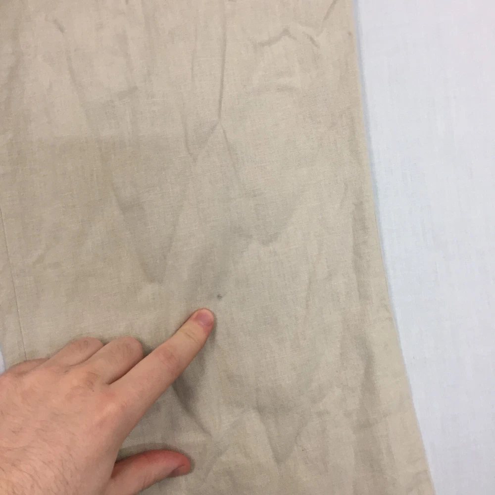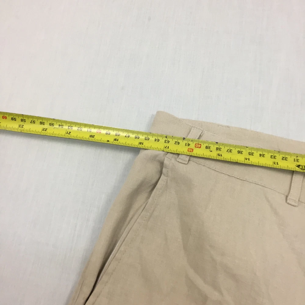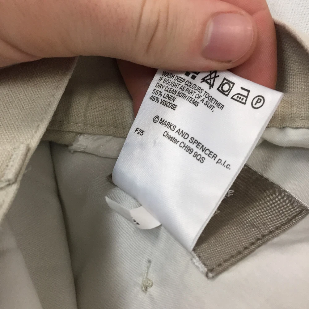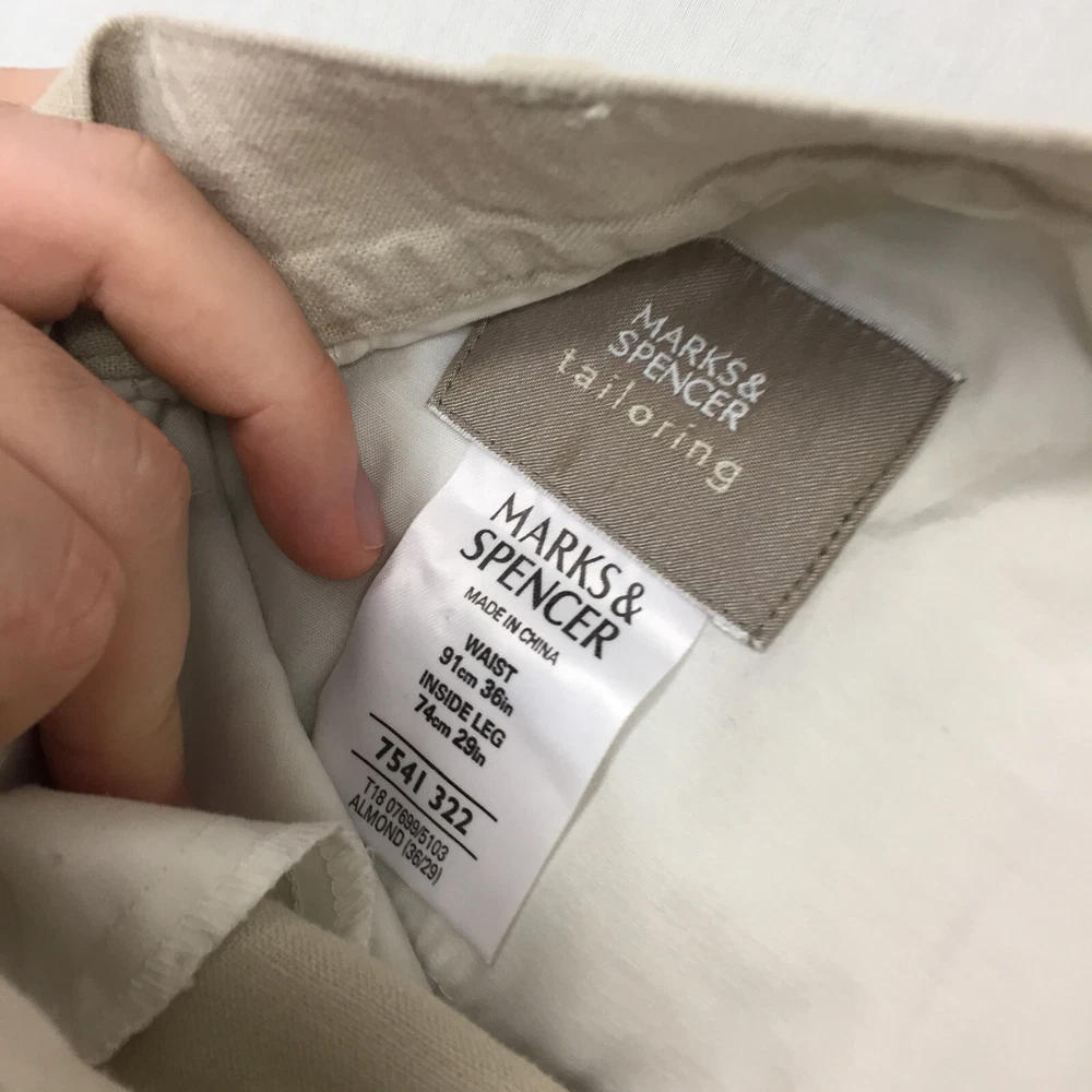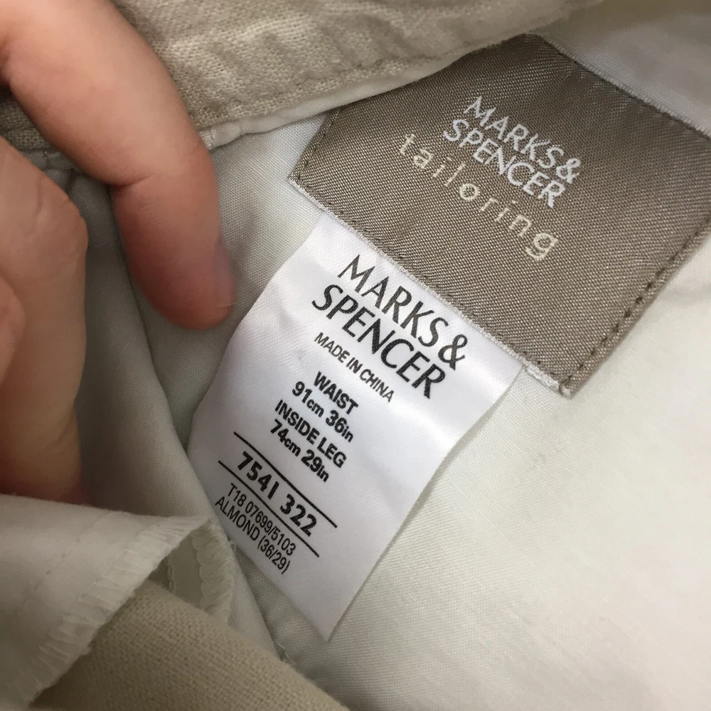 Inside Leg: 29 in Size: 36 Garment Care: Machine Washable Department: Men Pocket Type: Coin Pocket Closure: Button Waist Size: 36 in Rise: Mid (10-12 in) Vintage: No Accents: Button Season: Autumn, Spring, Summer, Winter Seller Notes: “Mark on the front. check below for full description & photos.” Leg Style: Straight Handmade: No Brand: Marks and Spencer Style: Chino Colour: Beige Pattern: No Pattern Country/Region of Manufacture: Unknown Fit: Regular Fabric Type: Canvas Type: Trousers Size Type: Regular Occasion: Business, Casual, Travel Personalise: No Material: Linen