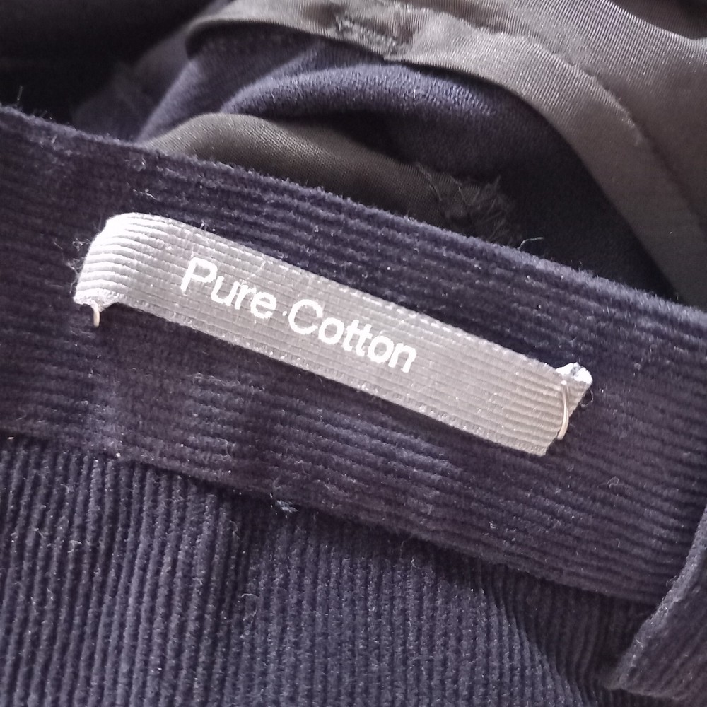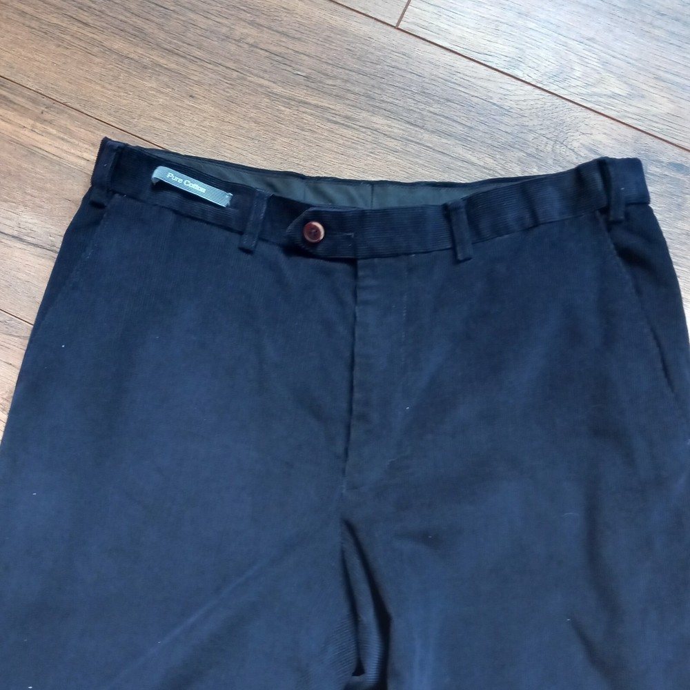 Dont think these were actually ever worn but the tags are removed - cotton label still on the front. Dark blue fine cord trousers in classic design from M&S Man. Measures 16" across waist, 30" long inside leg. 100% cotton.