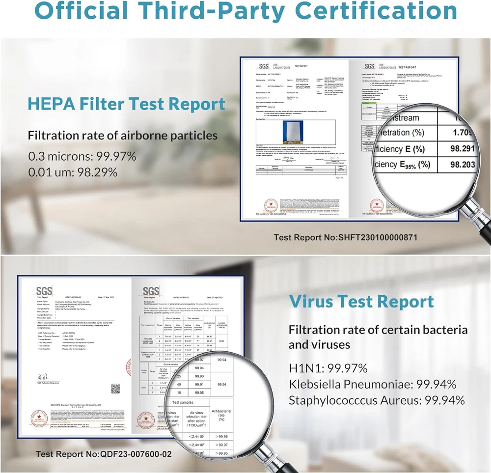 NOTE: Please Order Membrane Solutions Genuine MSA3 Air Filters, Non Official Brand Filters Can't Start The Purifier. Our Genuine officially designated filters keep your MSA3/MSA3S air purifier at its best working efficiency and extend the machine serving life Powerful Performance: MSA3 air purifier for home large room remove 99.97% of pet dander, dust, pollen, smoke, odor, mold, etc. Effectively improving indoor air quality and relieving pet allergies, coughing, sneezing, chronic allergies, and seasonal allergies. Suitable for any room or enclosed spaces such as living rooms, kitchens, bedrooms, offices, restaurants, hotels, and labs Upgraded 3-STAGE HEPA Filter: MSA3 Air Purifiers for large room features a 3-stage filtration design: Pre-Filter, H13 TRUE HEPA Filter, and Activated Carbon Filter (The upgraded filter has added OdallerPure technology to optimize the structure and content of activated carbon, and the odor removal effect is greatly improved.) Efficiency Filtration: MSA3 Air Purifier uses an H13 True HEPA PP electrostatic electret melt-blown filter. Filters out 99.97% of particles as small as 0.01 microns and air pollution PM 2.5 (particulate matter). Helps to relieve common allergies like sneezing, coughing, and irritated eyes Air Purifier for Large Room: MSA3 home air purifier is designed for large room. Max coverage is up to 1590ft², Customers will notice the difference within 10 minutes of using the MSA3 Air Filter Low-Noise Operation: Air purifier whole house runs at a very low noise level (22dB) when in sleep mode, the quiet HEPA air purifier cleans the air without noise pollution. Enjoy a peaceful, sweet dream and clean air with low-noise air purifier Safe and Reliable: 100% Ozone Free Air Cleaner. Certified to ETL, FCC, CE, and RoHS PROTECT YOUR AIR PURIFIER: Our Genuine officially designated filters keep your MSA3/MSA3S air purifier at its best working efficiency. Filter safety protection design can protect the safety of air purifiers when the filter is installed incorrectly. Unauthorized replacement filters are not tested or verified performance at HEPA standard, meanwhile, unofficial filters are unreliable and may damage the air purifier NEW Model MSA3S: If you need a smart air purifier, MSA3 air purifier that caters to your needs. With advanced air quality monitoring, Alexa and APP Control, it's the perfect for quickly cleaning a wide range of contaminants including pet dander, smoke, and bad smells. Breathe cleaner air and enjoy the convenience of effortless control with the MSA3S Product Description 1 0.01μm HEPA Report 2 H1N1 Test Report 3 Ammonia Test Report