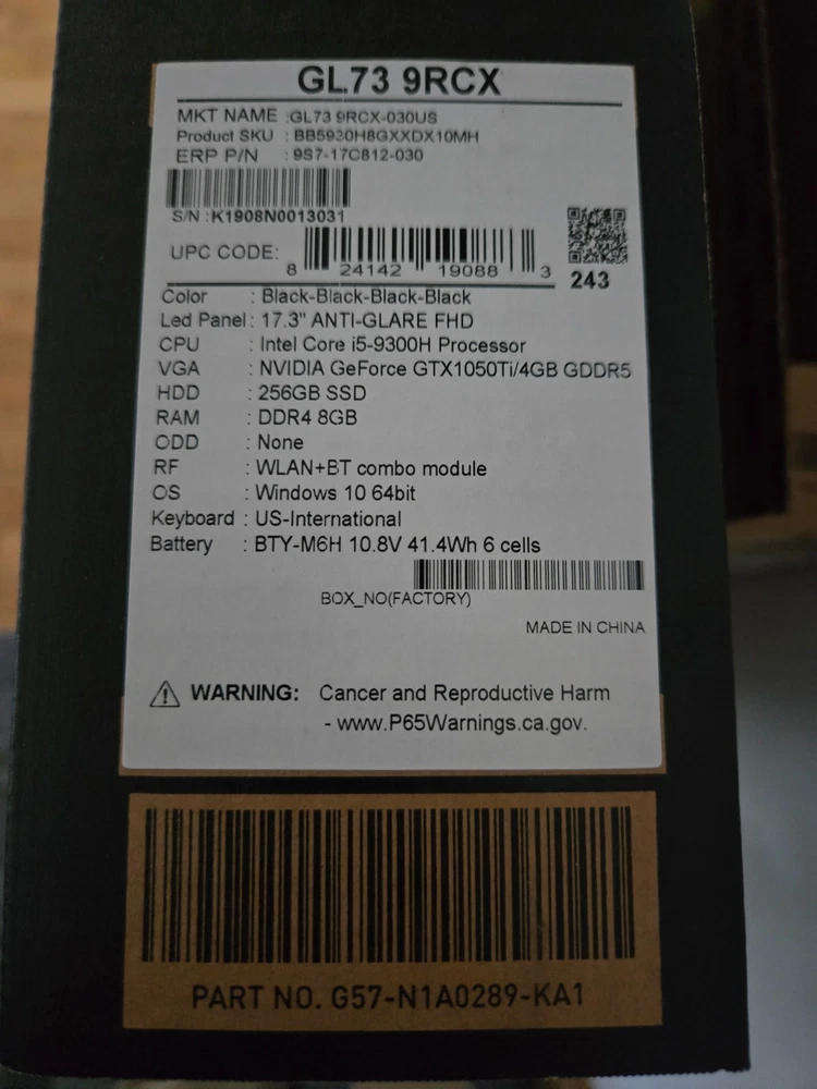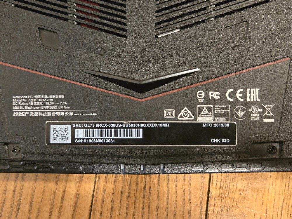Used MSI Gaming Laptop MSI Model GL73 9RCX 30 Condition is good, only minor wear on some of the most used keys (see photo) Comes with charger and original product box/shipping box! Purchased new approximately 5 years ago. Specifications: Intel Core i5-9300H 2.40 GHz Nvidia GeForce GTX 1050 Ti 8 GB RAM 256 GB SSD Screen size 17.3" Color: Black Backlit keyboard (red) Windows 10 Handles most well-optimized games well. It ran Dark Souls 3 and Elden Ring on Medium-high setting without issue. Ran Warhammer 40K Space Marine 2 on Low-Medium settings, with passable performance.