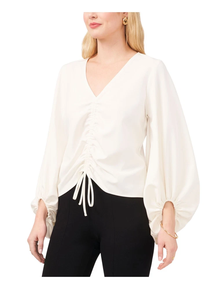 Love this blouse! The soft polyester fabric feels great, and the peasant sleeves with tie detail add such a cute boho touch. The V-neck is flattering, and the ruching gives it a stylish fit. Even with a minor blemish, it's a steal compared to the original price—washes well too! Perfect for petites looking for a feminine, comfy top.