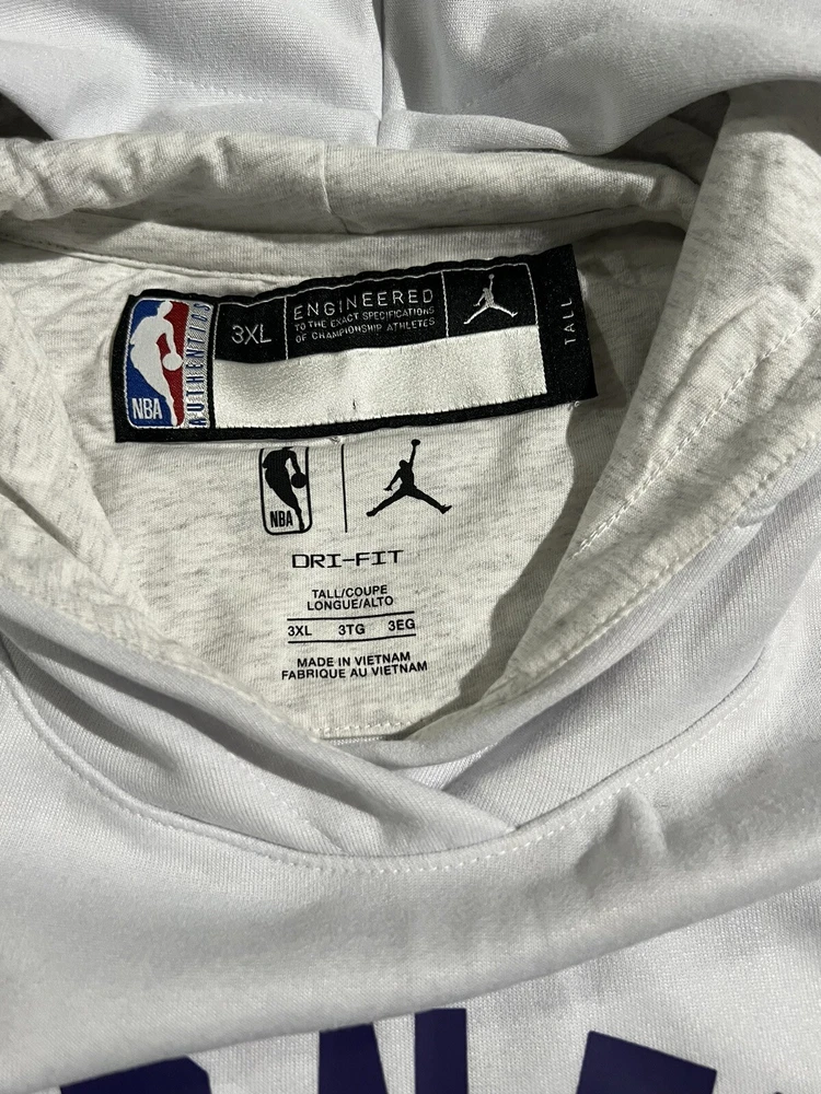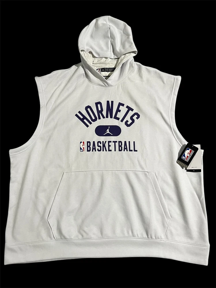 The Nike Charlotte Hornets Player Issue Sleeveless Hoodie in Men's 3XL-Tall is an officially licensed NBA apparel item designed for basketball fans. This ivory-colored hoodie features the Charlotte Hornets team logo and is made by Nike, a reputable sports brand. The sleeveless design is ideal for layering over a t-shirt during games or workouts, and the 3XL-Tall size provides a comfortable fit for larger individuals. This hoodie is part of the NBA collection and is suitable for supporting the Charlotte Hornets during the regular season.