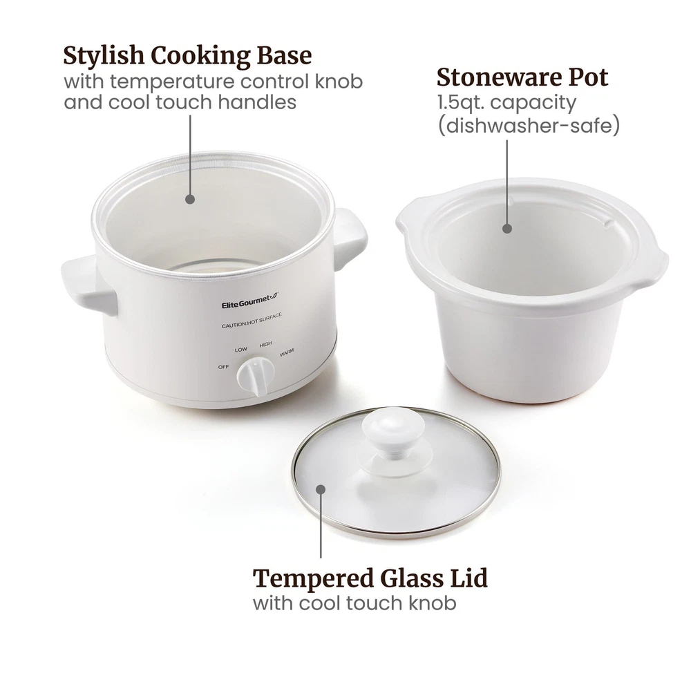 The 1.5Qt. Mini Slow Cooker is perfect for cooking and serving small -pot meals and appetizers such as soups, stews, meatballs, dippings, and sauces. It's a great kickoff for a fondue party or where everyone prepares their favorite dip in their 1.5Qt. Mini Slow Cooker. This versatile little appliance can be a single person's best companion as well the all-star at your next Superbowl party. It features low and high temperature settings, a keep-warm setting allowing you to keep your meal hot and fresh before it’s served and an attractive white finish. It includes a removable inner stoneware pot that’s easy to clean, a tempered glass lid with metal rim for easy viewing of cooking cycle and cool-touch handles and knob for safe handling. PERSONAL 1.5 QUART slow cooker makes cooking fork-tender roasts and poultry a breeze. Cool-touch handles and knob protect hands and allow you to safely transport your slow cooker. ADJUSTABLE SETTINGS with versatile Low / High / Keep Warm settings, gives you ultimate control of meal preparation. Simply set it and forget it while you continue on with your busy day, entertain guests or prepare other dishes. FAST, EASY CLEAN-UP with our dishwasher-safe clear tempered glass lid and removable oval stoneware pot. The exterior heating base can be wiped clean with a damp cloth to maintain its pristine appearance. SLEEK WHITE FINISH for a clean and stylish design that pairs with any kitchen. Intertek LISTED for your safety, 120 Watts, 1 YEAR LIMITED and U.S. based customer support team means you can buy with confidence.