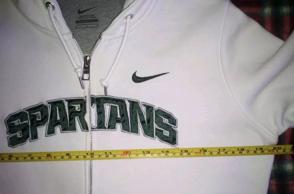 Show off your team spirit with this officially licensed Nike Michigan State Spartans hoodie. The white and green color combination is perfect for game day or everyday wear. The full zip sweatshirt features embroidered details of the team's logo and name, making it a must-have for any fan. Made from high-quality materials, this sweatshirt is perfect for football season and has a capacity of unknown size. It's a great addition to any fan's collection. Get yours today and show everyone that you are a true Michigan State Spartans fan.