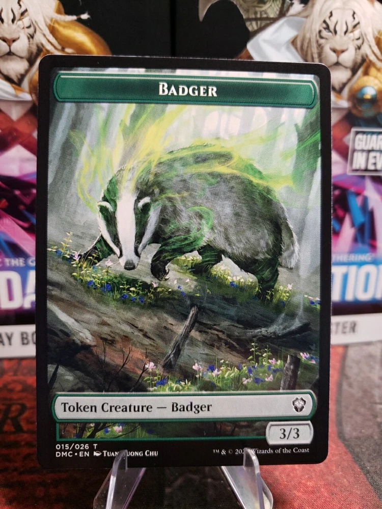 Delve into the world of Magic: The Gathering with the Badger Token card from the Commander: Dominaria United set. This token card, featuring a tenacious badger, is a fantastic addition for players looking to enhance their deck with a touch of green power. With an attack and defense of 3, this creature is ready to contribute to your strategic gameplay. The card boasts a regular finish and is printed in English, making it accessible for players aged 13 and up. Illustrated by Tuan Duong Chu, the card's artwork adds to the visual appeal of this standard-sized collectible. Manufactured by Wizards of the Coast in 2022, this token card is a must-have for enthusiasts and collectors alike, adding to the richness of your gaming experience.