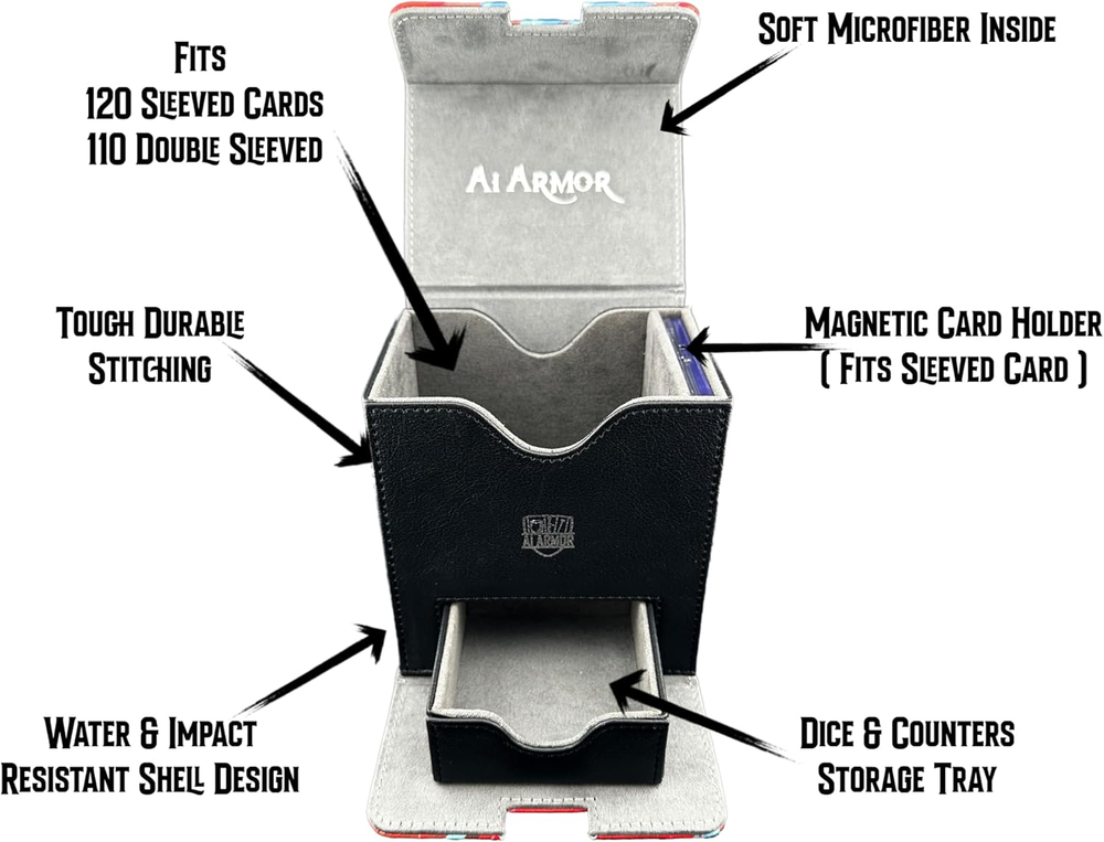 ✅ Fits 120 Sleeved, 110 Double Sleeved ✅ Magnetic Card Holder For Commander (Fit's Sleeved Card) ✅ Storage Tray For Dice & Counters ✅ Hand Made ✅ High Quality Faux Leather ✅ Premium Stithcing, Tough & Durable ✅ Soft Microfiber Inside ✅ Impact & Water Resistant ✅ Compatible with Magic The Gathering and Pokemon & Lorcana Cards. These boxes are not created by Magic The Gathering, Pokemon or Disney. Product Description Ai Armor Deck Boxes The video showcases the product in use. The video guides you through product setup. The video compares multiple products. The video shows the product being unpacked. Ai Armor Exclusive Mana/Guild Deck Boxes Brand New 2024/25 Launch Features: Our deck boxes feature premium soft leather, with a slight texture so they grip well, intricate durable stitching that matches the color. Water & Impact resistant with a soft microfiber inside. Every box comes with a magnetic card holder that will fit a sleeved card to prevent scratches! Large Capacity Fits 120 Sleeved & 110 Double Sleeved Magnetic Holder Fits Sleeved Card An Ai Armor exclusive! Other magnetic holders will NOT fit a sleeved card. Premium Quality Materials Slighty Textured Leather for Ultimate Grip Durable Color Matched Stithcing Matching Mana Sleeves! Matching Mana Sleeves! Matching Sleeves! Matte Back Acid & PVC Free Matching Sleeves! Matte Back Acid & PVC Free Matching Sleeves! Matte Back Acid & PVC Free Matching Sleeves! Matte Back Acid & PVC Free Blue Black White Black White White Red Green Green Black