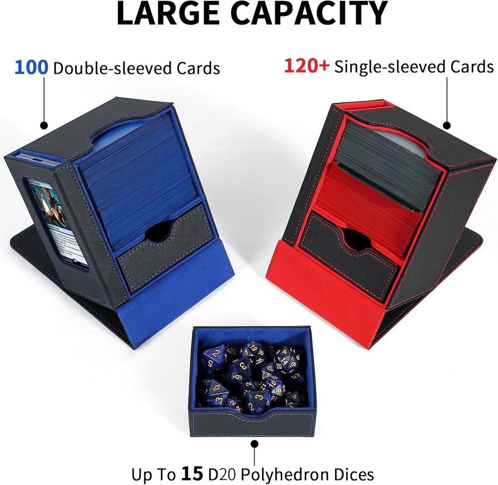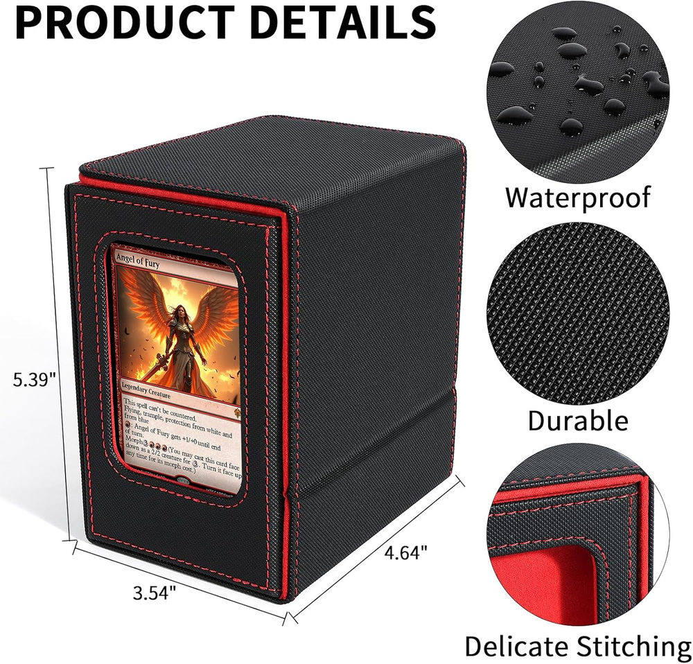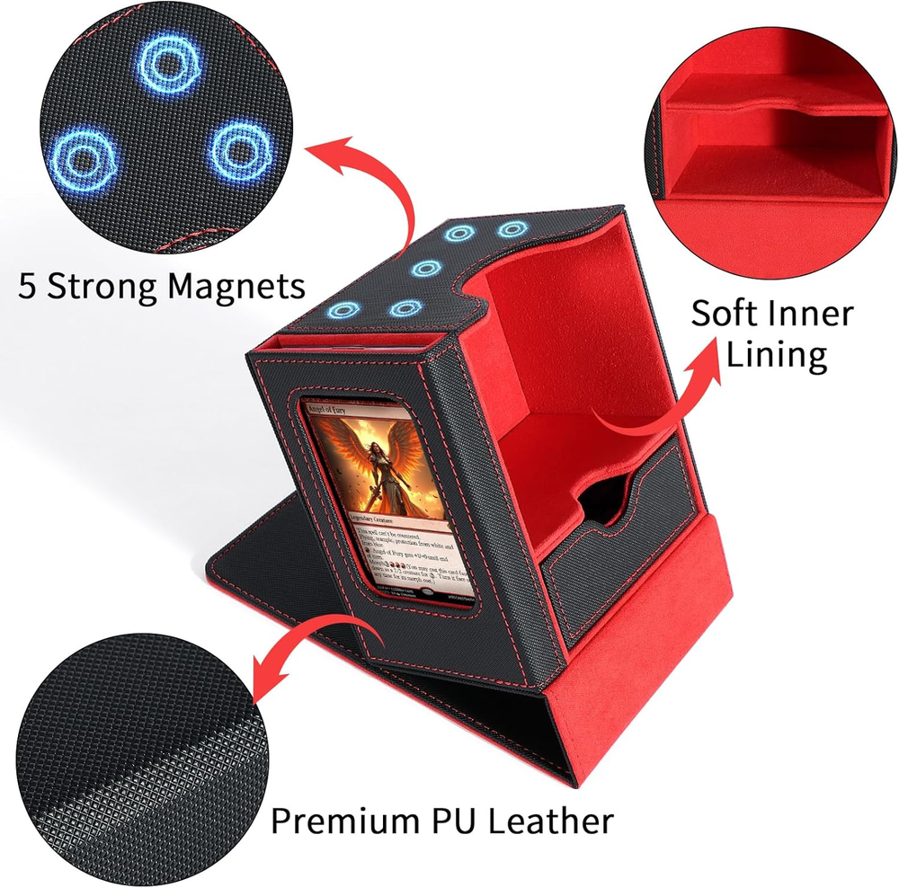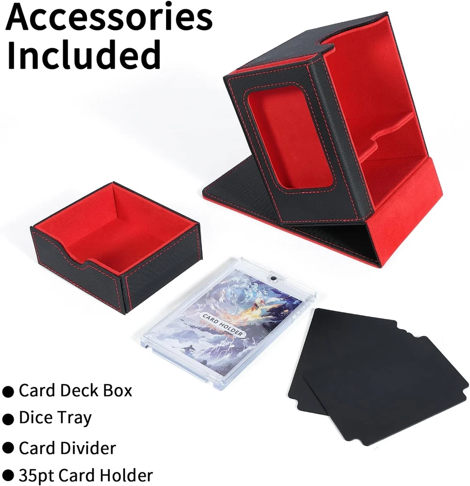 [Tailored for Commander Players] Specifically designed for Commander (EDH) players, this innovative mtg deck box offers exceptional protection and display for your Commander deck. The dedicated card holder securely stores your Commander card and proudly displays it in a separate slot. Additionally, the side window allows for quick identification, making it easy to find the deck you need [Versatile & Practical] This is not just a commander deck box; it also functions as a deck stand. The lid of the box doubles as a support, featuring a U-shaped opening that allows for easy card retrieval during gameplay. Whether for preparation or intense sessions, it offers ultimate convenience and security [Large Capacity] This card deck box can hold up to 100 double-sleeved cards or over 120 single-sleeved cards. It also includes a large dice tray that can store up to 15 D20 polyhedral dice, keeping your cards and accessories organized and easily accessible, providing an all-in-one solution for your needs [Robust Protection] The mtg deck box is crafted from high-quality PU leather for superior shock protection. Its soft microfiber lining prevents card scratches, and multiple strong magnets ensure the box stays securely closed, even during transport, keeping your deck safe and intact [Bonus Inclusions] Each MTG commander deck box comes with 2 card dividers, 1 dice tray, and 35pt card holder. Whether you're an MTG, PTCG, or other TCG enthusiast, this deck box is the perfect choice for storing and protecting your precious cards Product Description