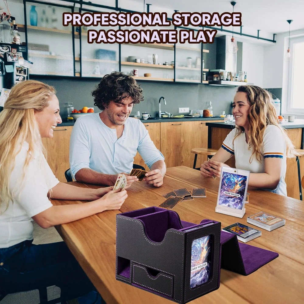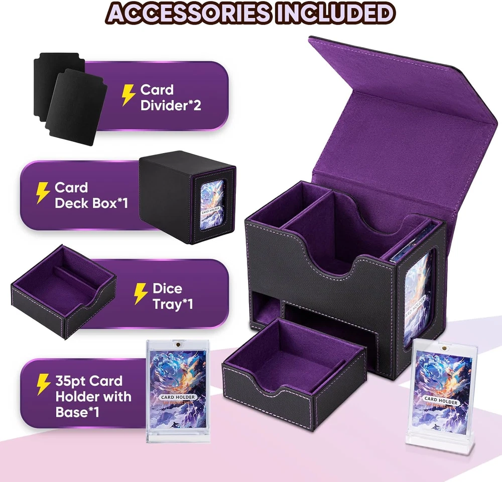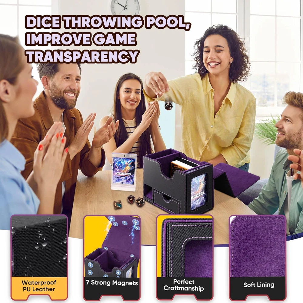 Why Choose Us? Designed with the commander EDH player in mind, our innovative commander deck box is a perfect fit for your commander deck. Keep your commander card safe in the included 35pt card holder, which comes with a card brick to prevent it from accidentally getting mixed into your deck. Show your commander proudly in the dedicated slot provided, or stand your commander on the table with card holder with base, which is convenient for the game. Compact Design with Enhanced Functionality: Smaller size, but maximize space and functionality. Measuring 4x3.15x2.8 inches internally, this deck box can fits 100 double-sleeved cards or more than 120 single-sleeved cards, making it perfect for players who need a lightweight and portable solution for their card carrying needs. It also includes a dice tray and dice pool, making it easy to incorporate into your gameplay without sacrificing card storage space. Integrated Dice Tray and Pool for Transparent Gameplay: Our mtg deck box comes with a built-in dice tray and dice pool, the large dice tray can accommodate up to 50 dice (14mm), the dice pool ensuring that all players can clearly see the dice rolls, adding a layer of transparency and fairness to your MTG games. This design also conserves space and adds an element of fun to your gaming time! (NOTE: Dice are not included) Durable Material and Secure Magnetic Closure: Crafted from high-quality, durable materials - the surface is made of PU leather which is scratch-resistant and waterproof, this trading card storage box shields your cards from damage. Equipped with 7 strong magnets which is more than other product, keep it securely closed during transport, ensuring your cards are well protected. Innovative Storage Solutions: The commander card slot enables swift inspection of your deck box contents without opening the card box. Ideal for MTG, PTCG, or any other TCG enthusiasts, this card storage has 2 card dividers, a magnetic card brick, and a card brick stand, which simplifies the organization and bringing portability, which is the top choice for any trading card enthusiast. It also a great gift for card gamers and collectors. Product Description