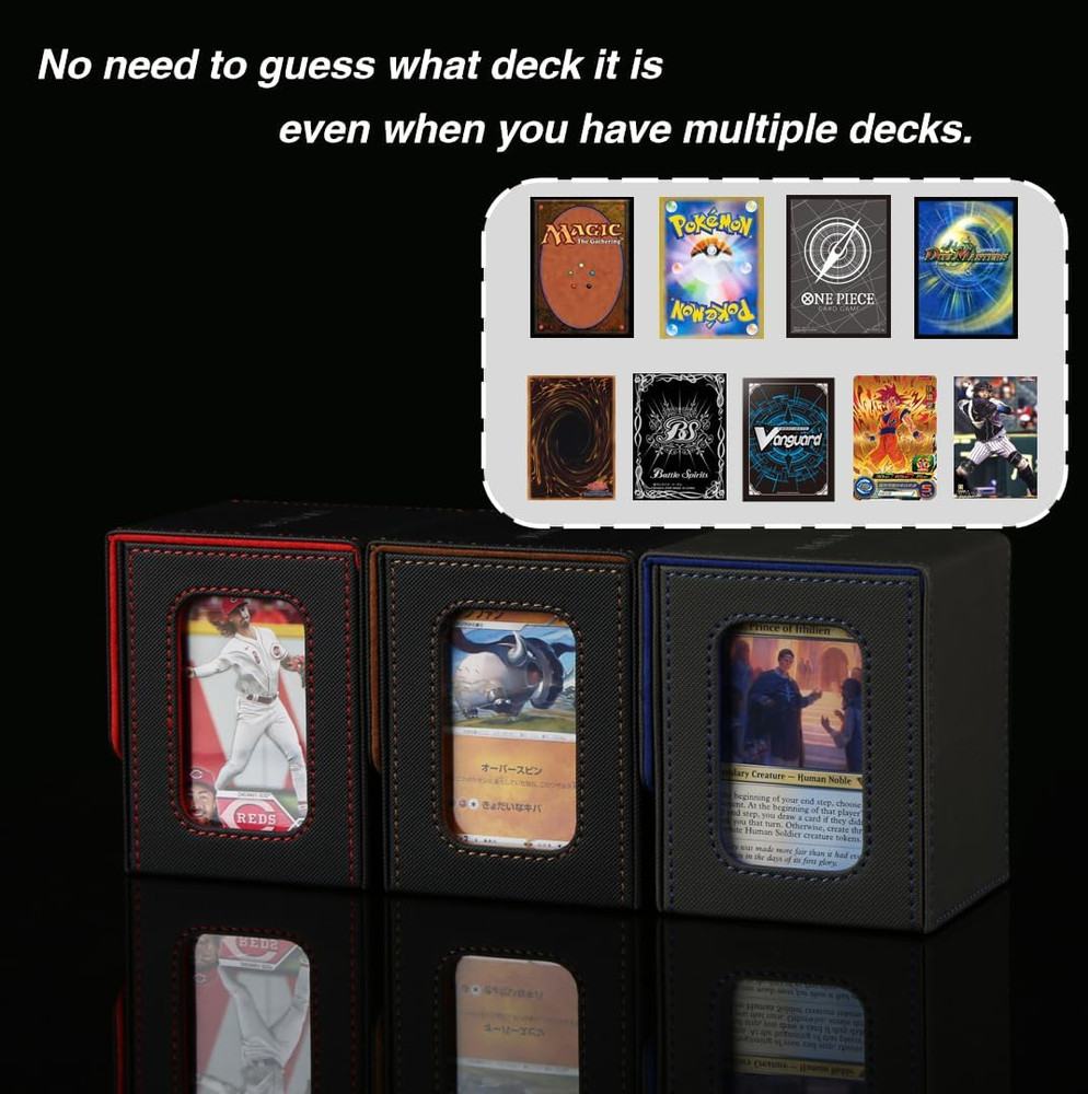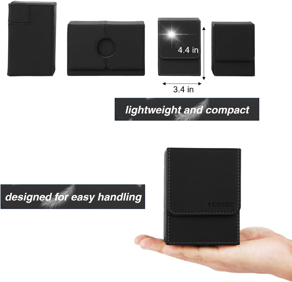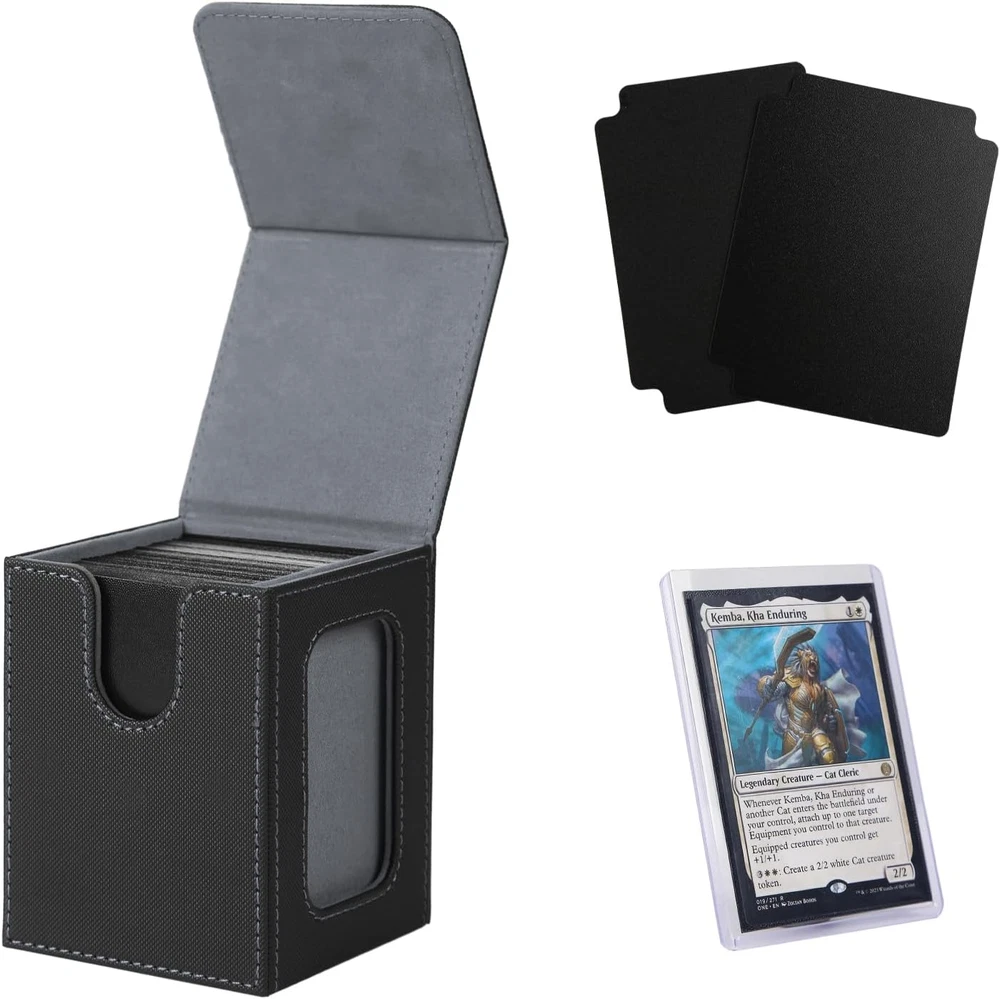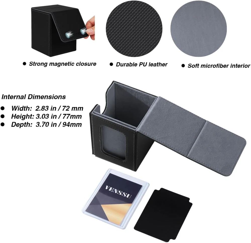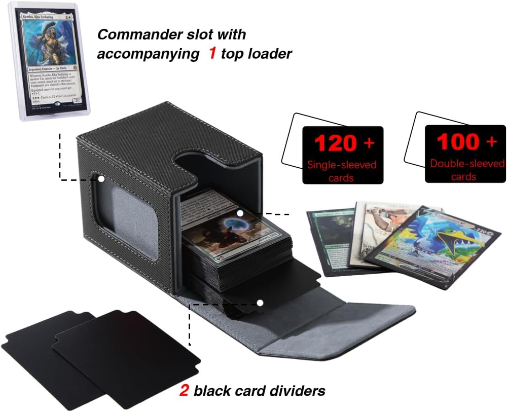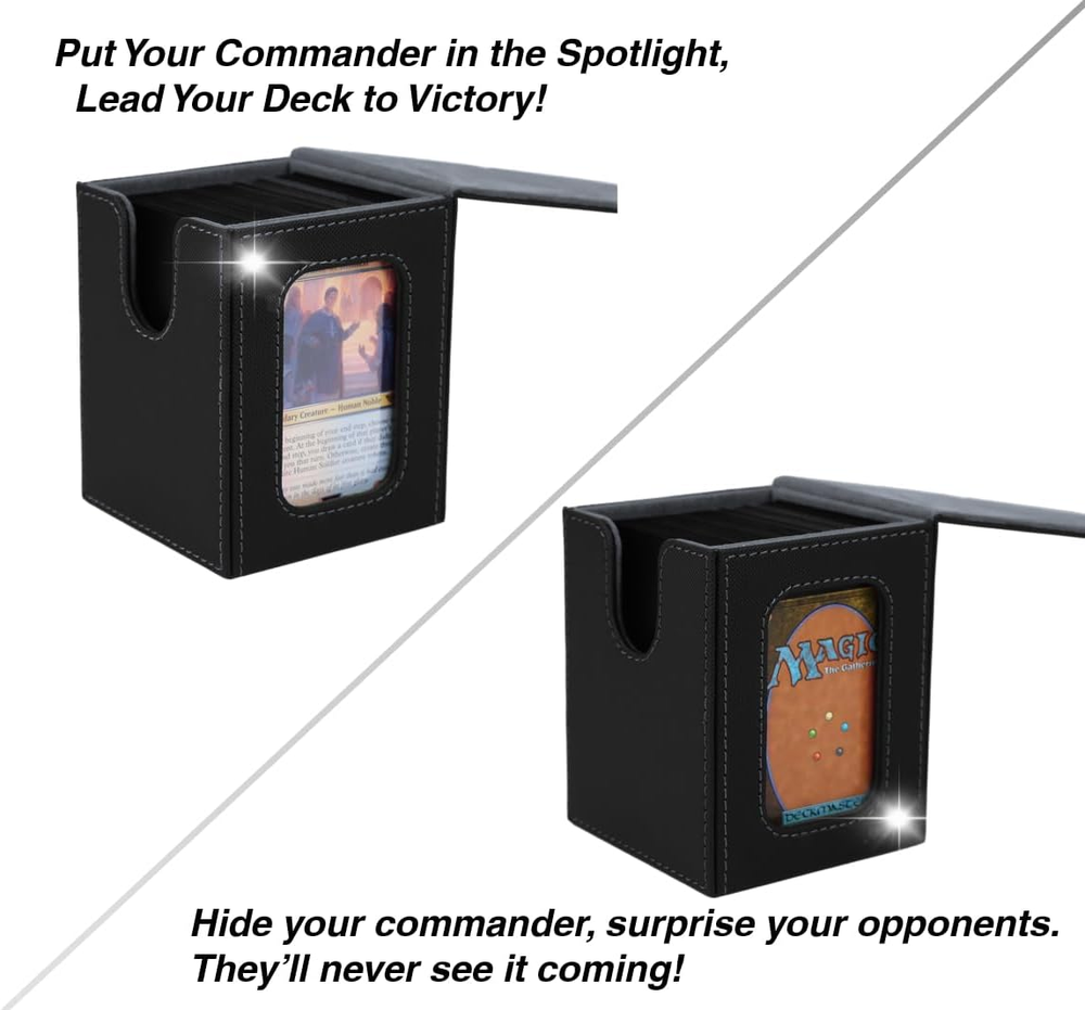 【Patented Design】Specifically designed for Commander EDH players our innovative design is custom-fitted for your Commander deck. Securely store your Commander card in the included top loader, and proudly display it in the specially designed slot. Additionally, it allows for easy identification of which deck is inside each card box. 【Large Capacity】internal dimensions -3.74x 3.07x 2.83 in,.This deck box offers 3 storage configurations,holds 120 single-sleeved cards, 100 double-sleeved cards, or 60-80 double-sleeved cards plus extras like dice or tokens. 【Wide Compatibility】Our card deck case is also designed to universally accommodate all trading card games, including Magic The Gathering, Yugioh!, Duel Masters, One Piece, as well as sports cards such as Baseball/basketball/football Cards. 【Powerful protection】Featuring a sturdy PU shell for shock protection and a soft microfiber interior to safeguard cards from scratches, this compact deck box has multiple magnets for secure closure. 【Items Included】Each trading card box comes with 2 card dividers and 1 top loader. Weighing just 0.35 lbs, it’s small, lightweight, and portable—a good choice for card players and collectors! Product Description No need to guess what deck it is The battle among men begins with the tcg deck box Showcase Your Commander: Lead from the Front! Hide your commander, surprise your foes! Large capacity card box Can accommodate over 120 single-sleeved or over 100 double-sleeved cards. Includes one toploader and two card dividers